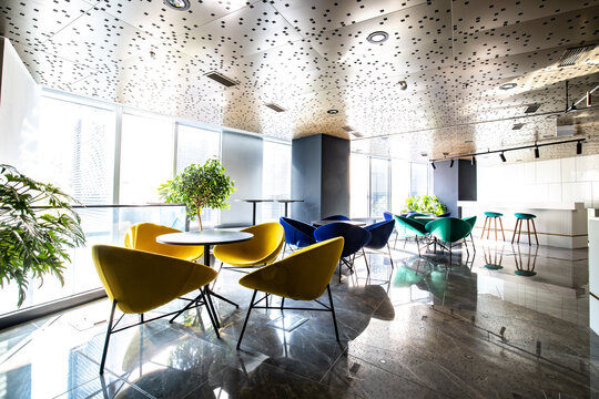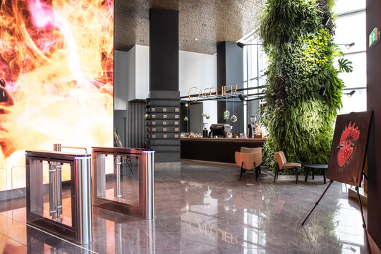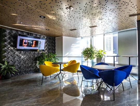 Spațiul de primire din această clădire emblematică a Bucureștiului a rămas din punct de vedere al designului interior cu 10 ani în urmă, pe vremea când domina sfera de zgârie-nori ai Bucureștiului fără alte obiecții.
