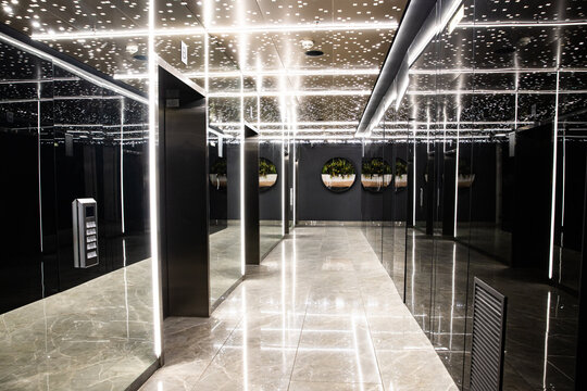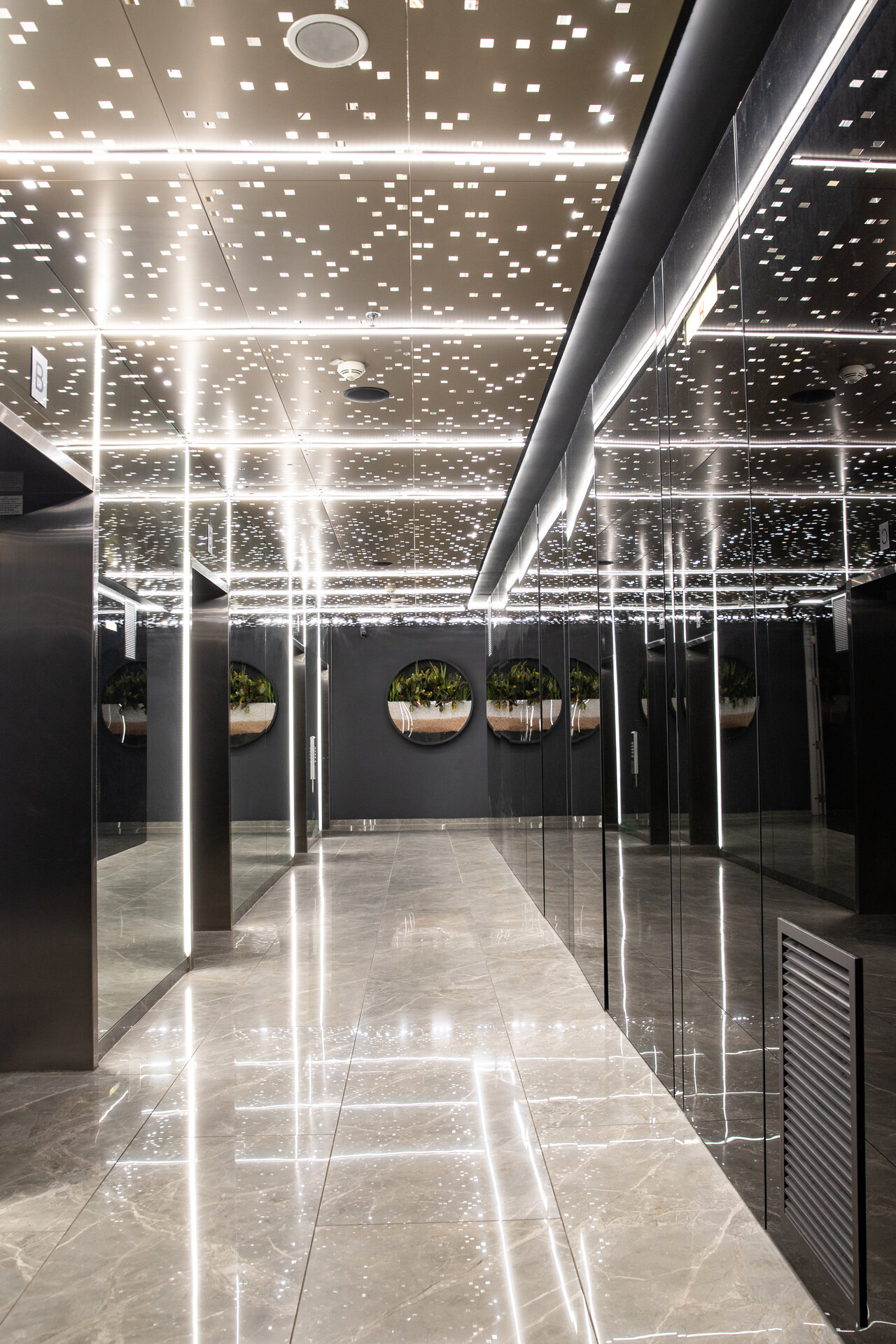 Un alt element important al spațiului propus este tavanul fals. Acesta a fost gândit încă de la început ca o "ploaie de stele". Efectul de ploaie de stele se dorea a fi inițial obținut prin multe corpuri de iluminat, dar întrucât ar fi costat foarte mult s-a optat pentru un tavan cu perforații proiectate specific, care să permită luminii ampla-sate sub el să pătrundă în încăpere. Efectul cel mai puternic este obținut în lobby-ul lifturilor unde, cu ajutorul unor benzi LED, a oglinzilor și a sticlei negre se obține impresia de infinit în nucleul clădirii respectiv în locul de unde se ajunge la nori.
