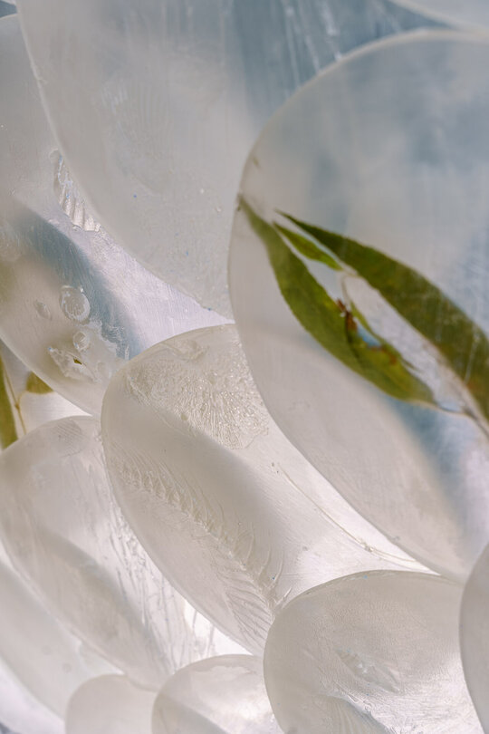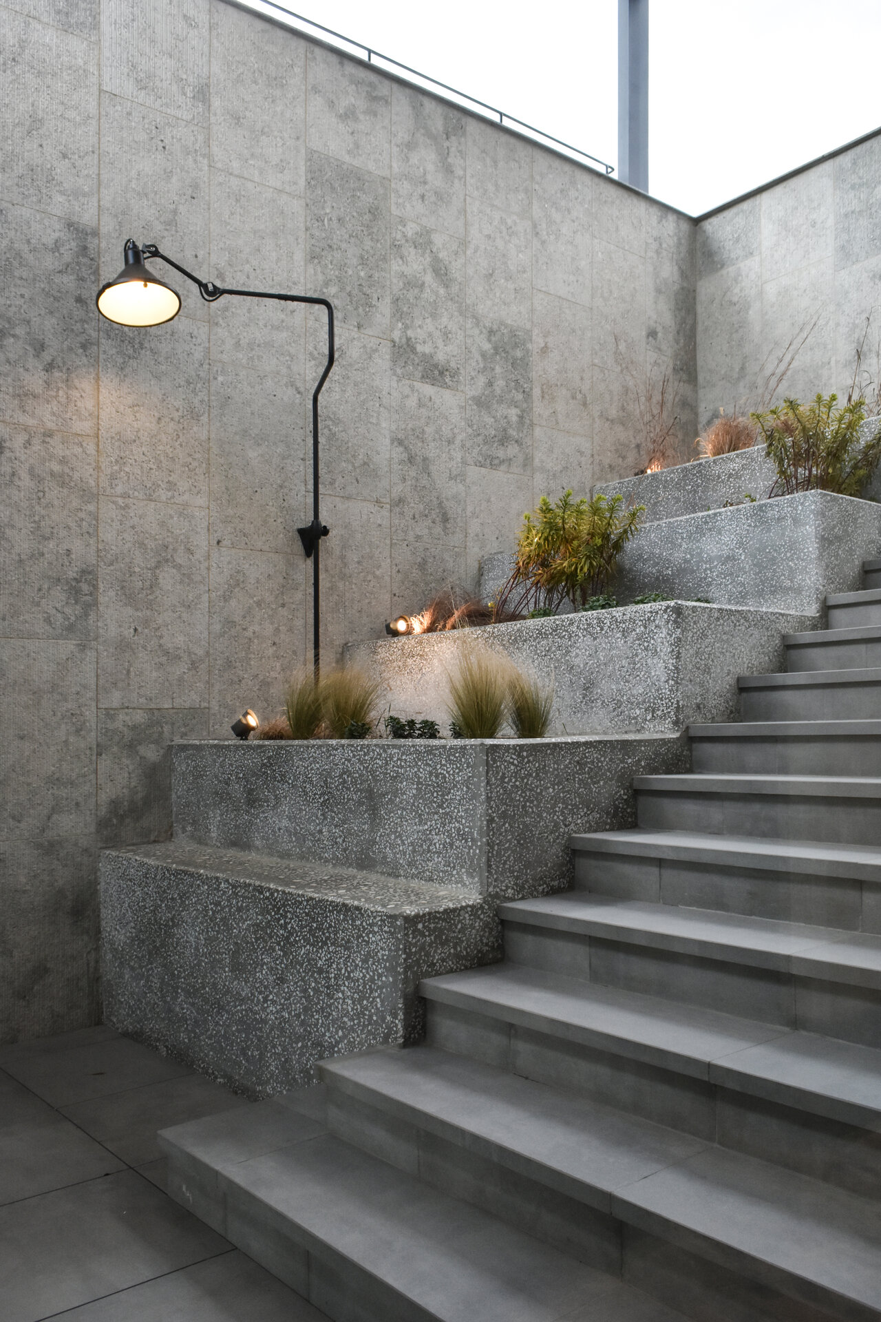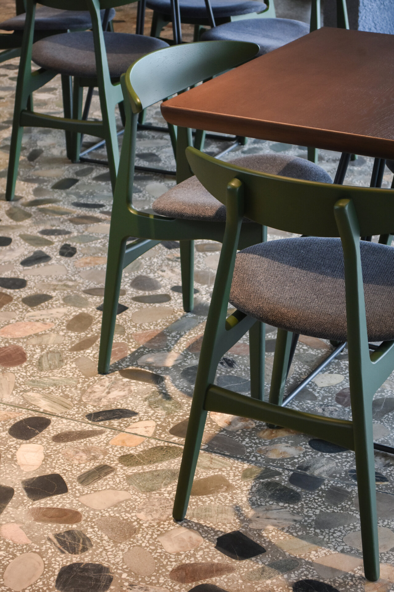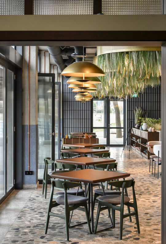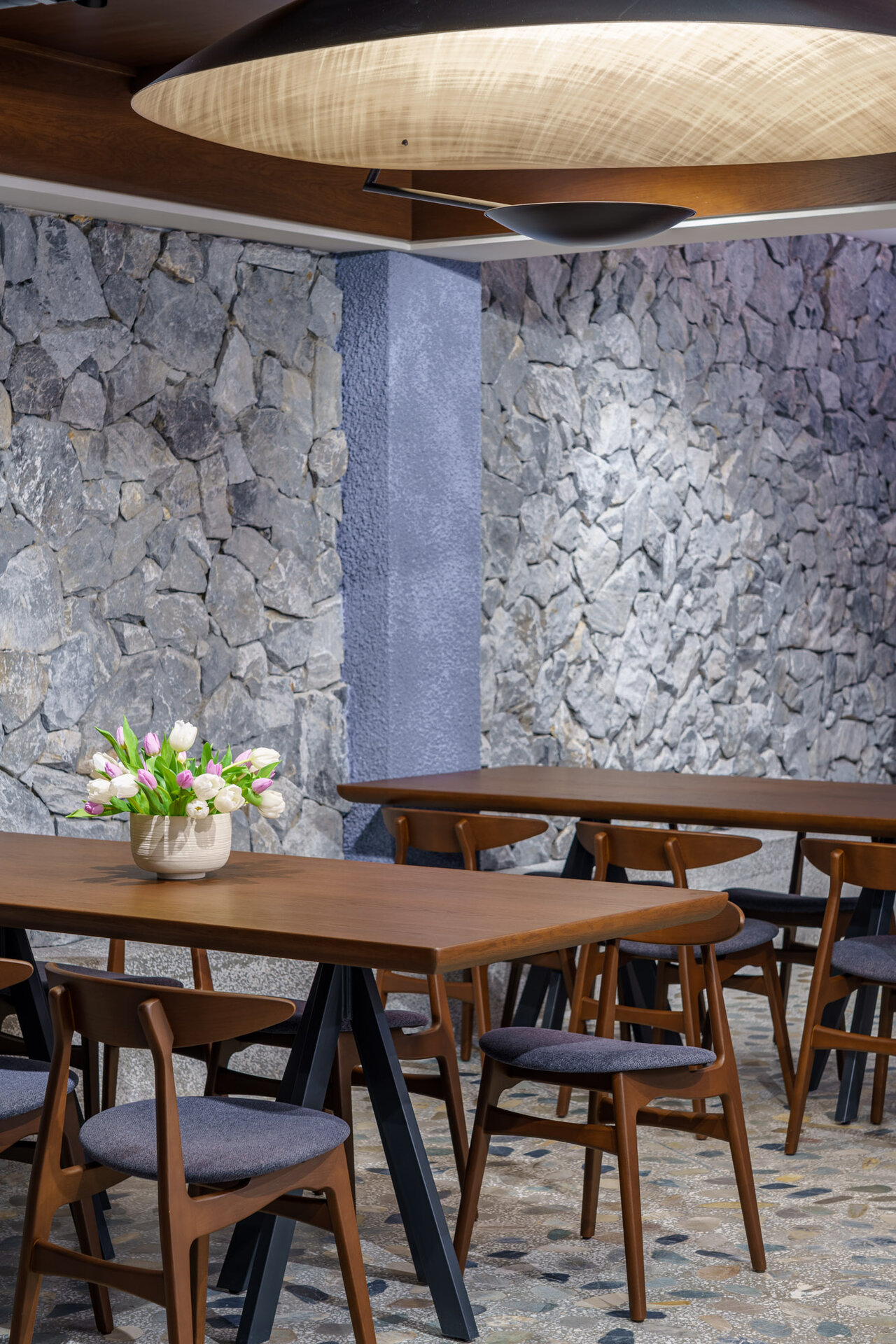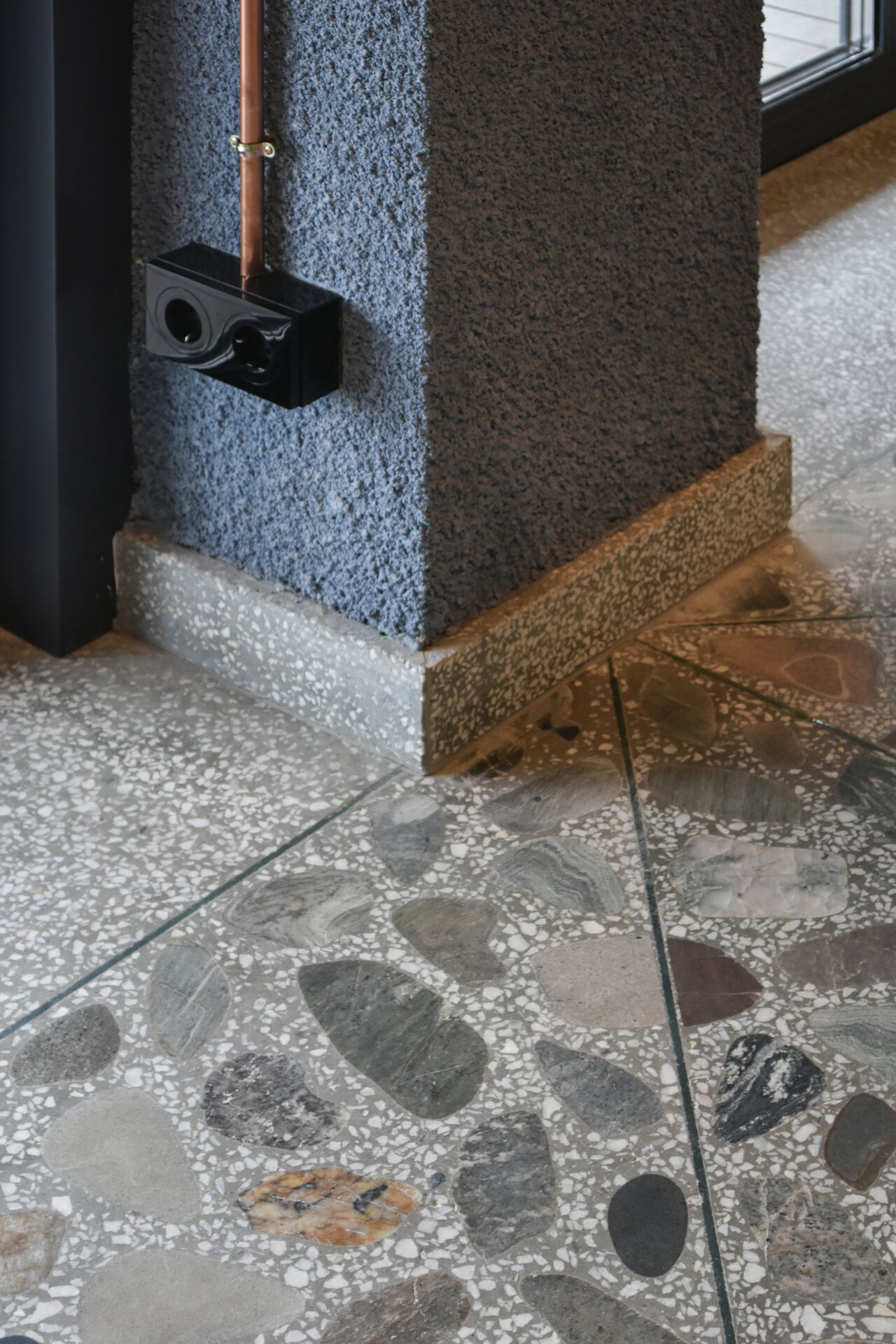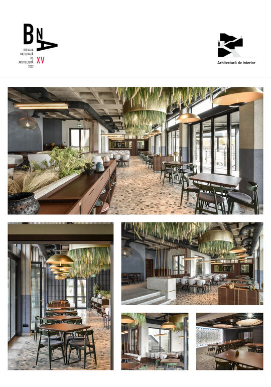 Dialogul dintre natură și design este susținut și de alegerea materialelor: pardoseala cu pietre din râul Bistrița, placări cu piatră cochiliferă, vegetație, detalii precum medalioanele de rășină, în care o serie de elemente naturale colectate de pe sit (plante și osaturile unor pești) au fost folosite ca matrițe.