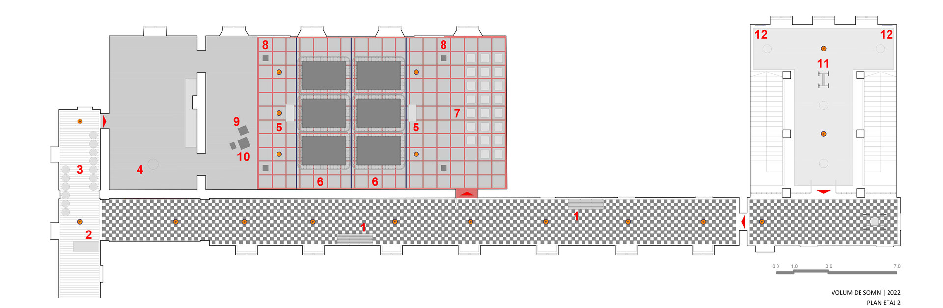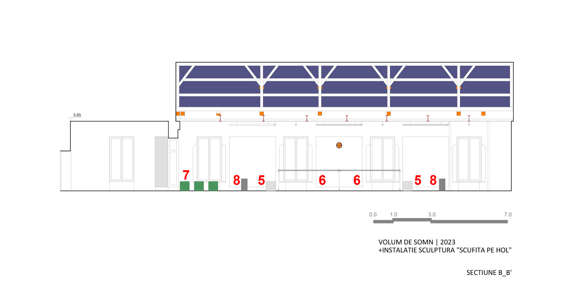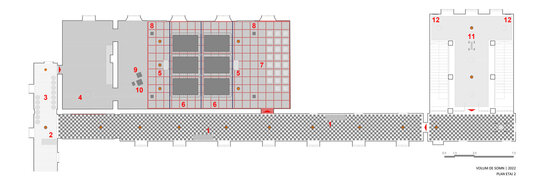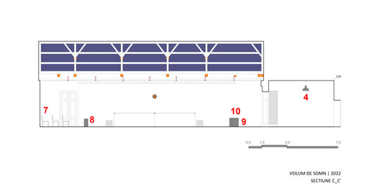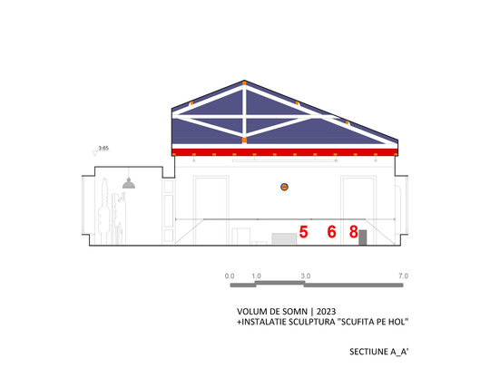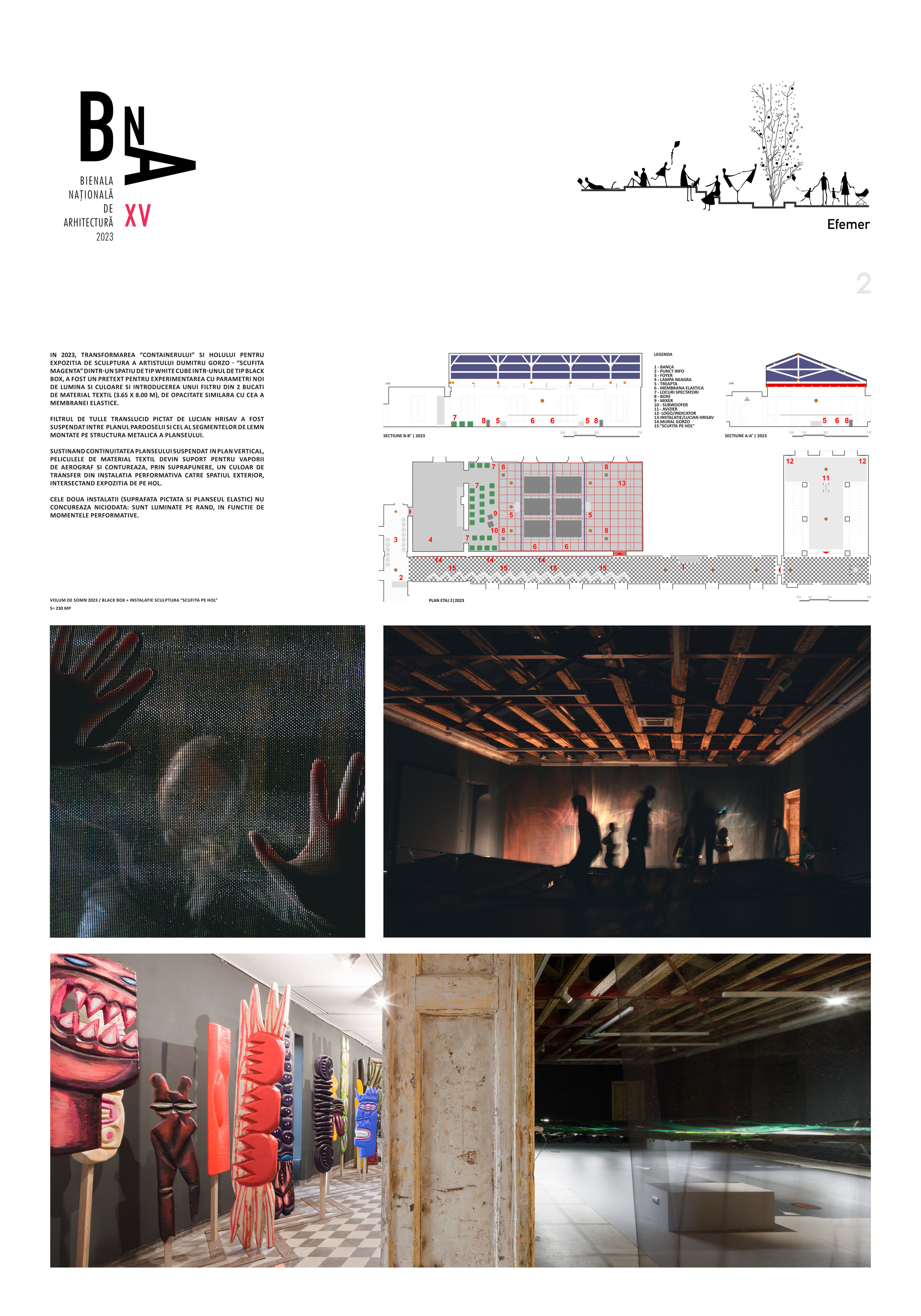 În 2023, transformarea “containerului” și holului pentru expoziția de sculptură a artistului Dumitru Gorzo - “Scufița Magenta” dintr-un spațiu de tip white cube într-unul de tip black box, a fost un pretext pentru experimentarea cu parametri noi de lumină și culoare și introducerea unui filtru din 2 bucăți de material textil (3.65 x 8.00 m), de opacitate similară cu cea a membranei elastice.