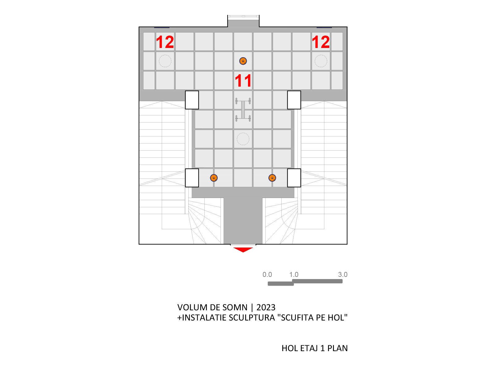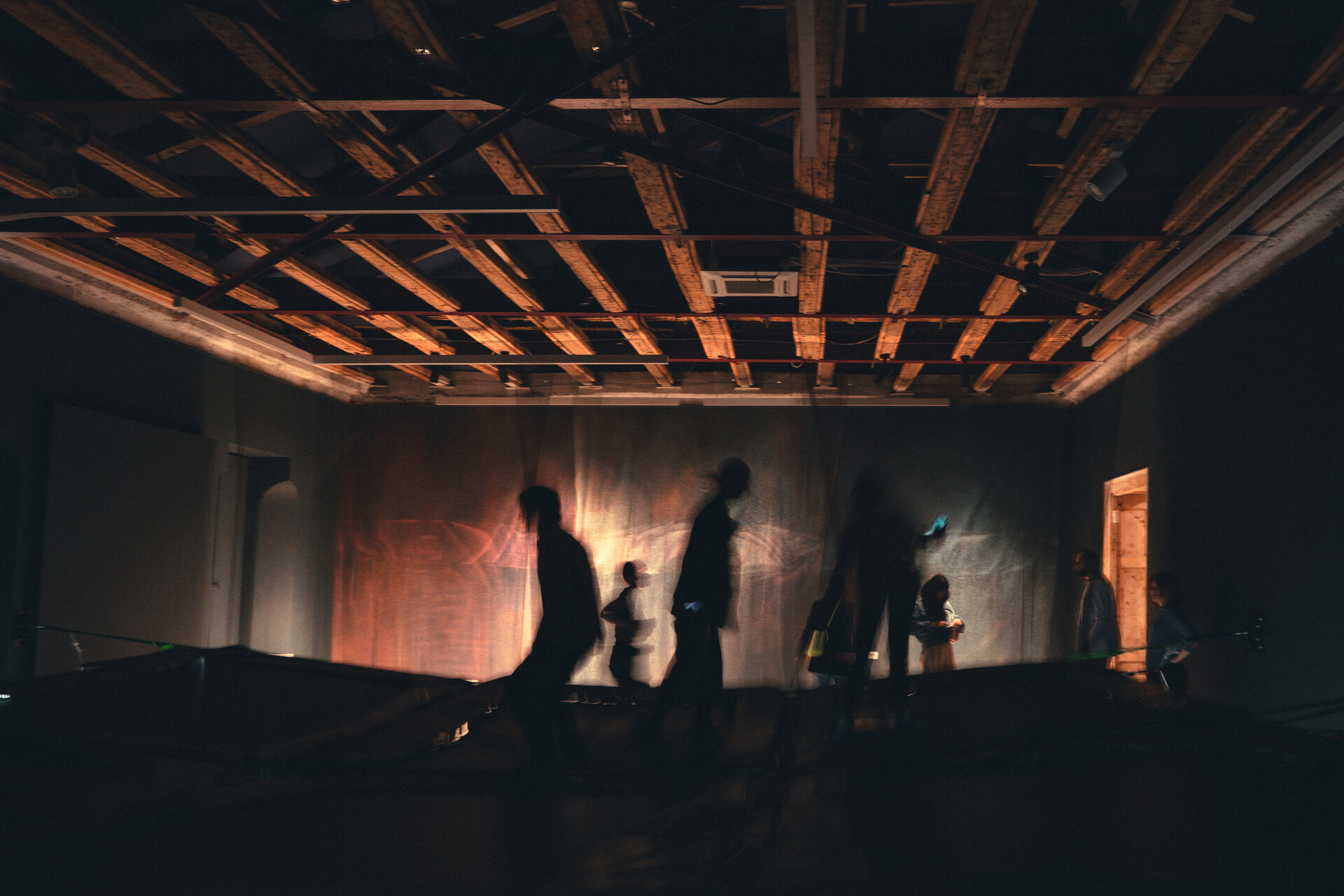 Filtrul de tulle translucid pictat de Lucian Hrisav a fost suspendat între planul pardoselii și cel al segmentelor de lemn montate pe structura metalică a planșeului.