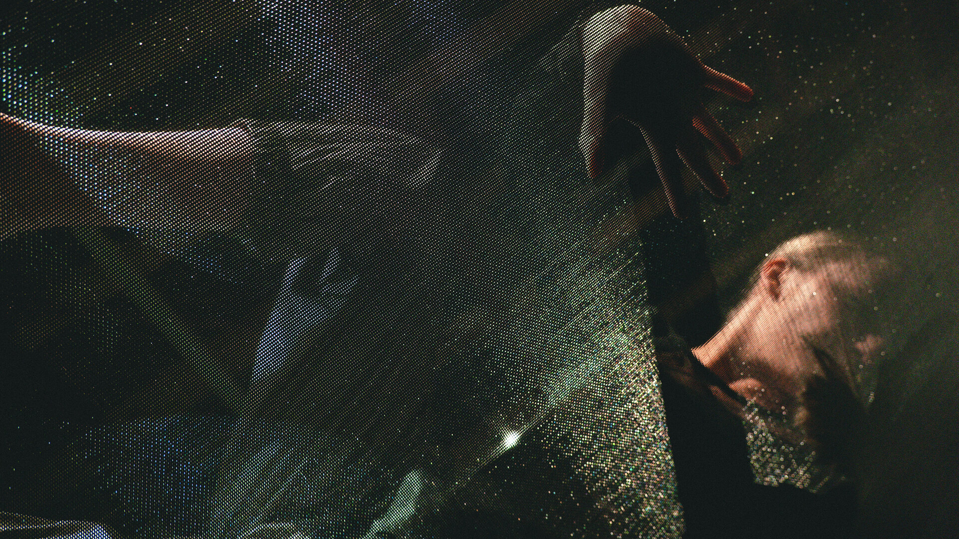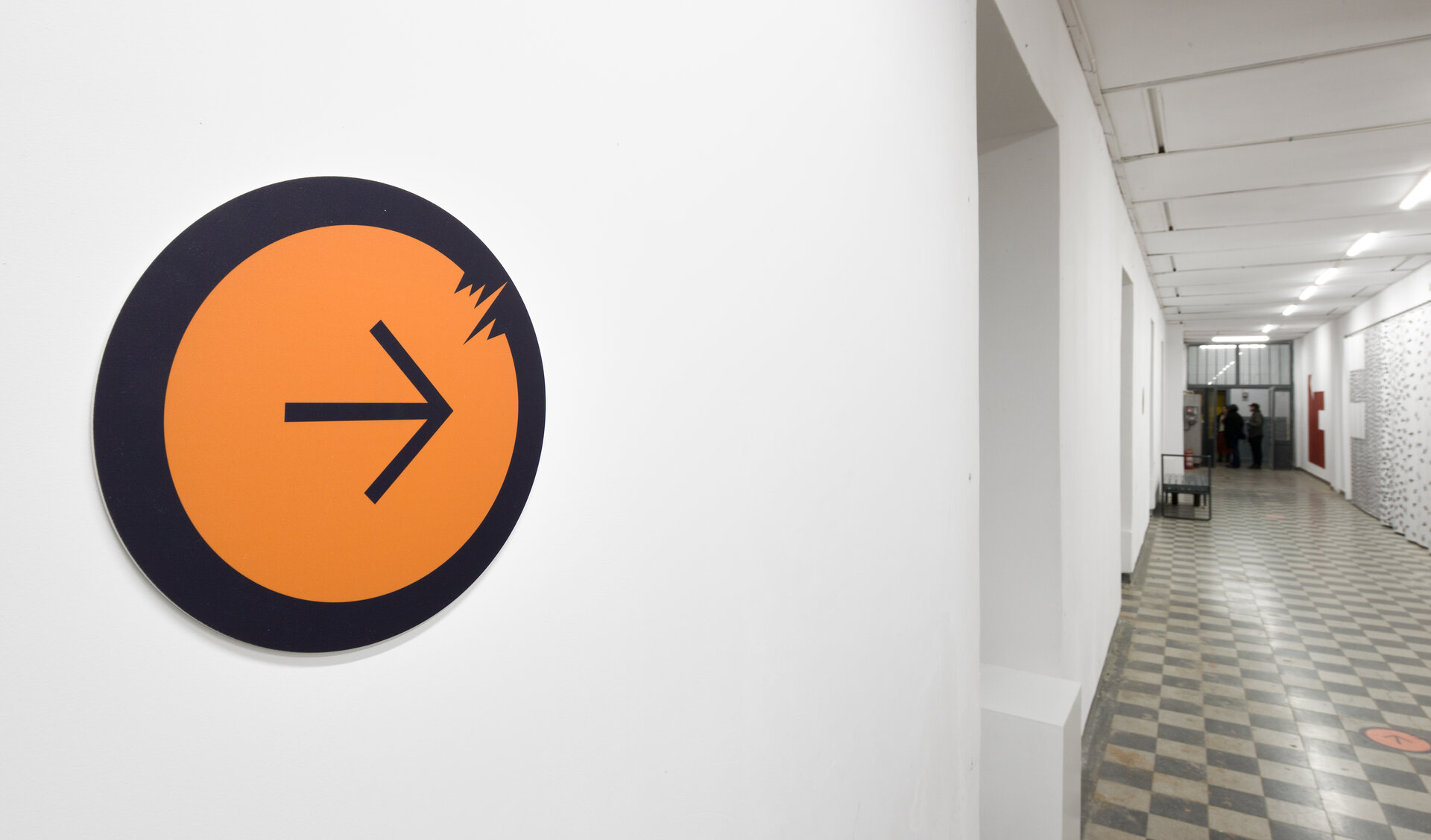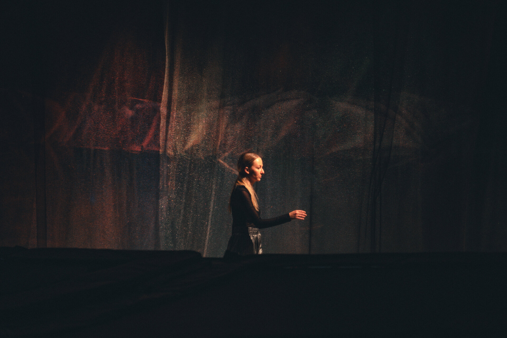 Susținând continuitatea planșeului suspendat în plan vertical, peliculele de material textil devin suport pentru vaporii de aerograf și conturează, prin suprapunere, un culoar de transfer din instalația performativă către spațiul exterior, intersectând expoziția de pe hol.