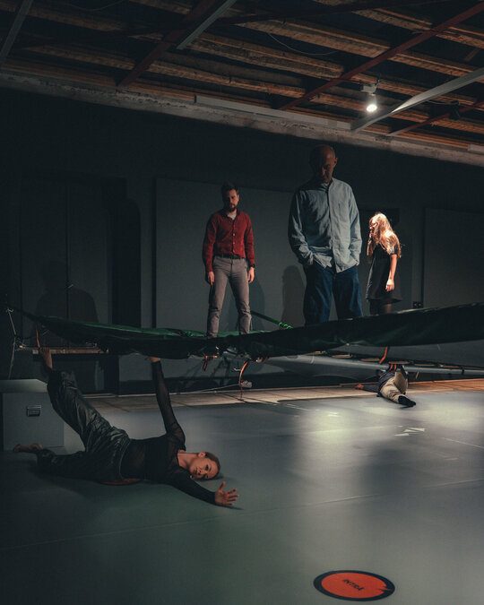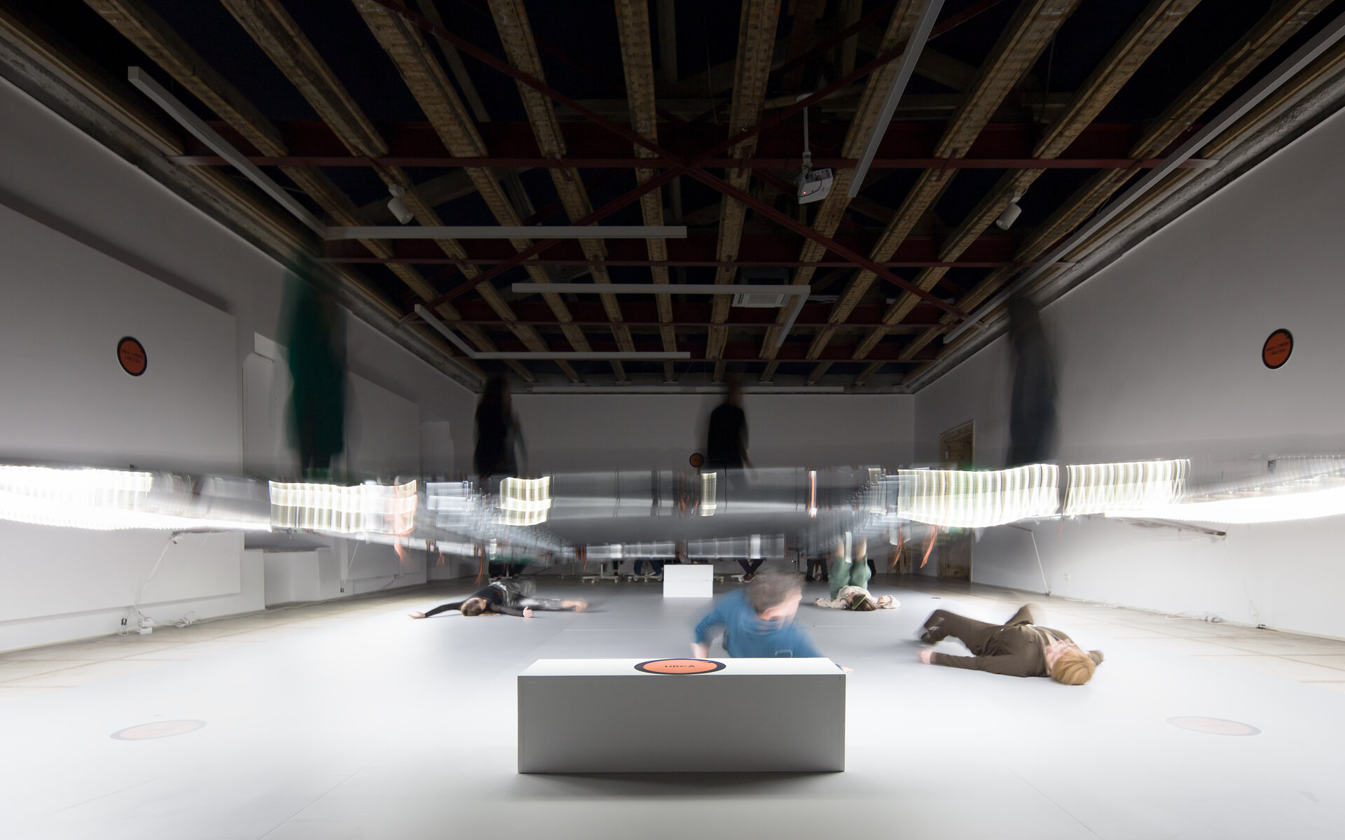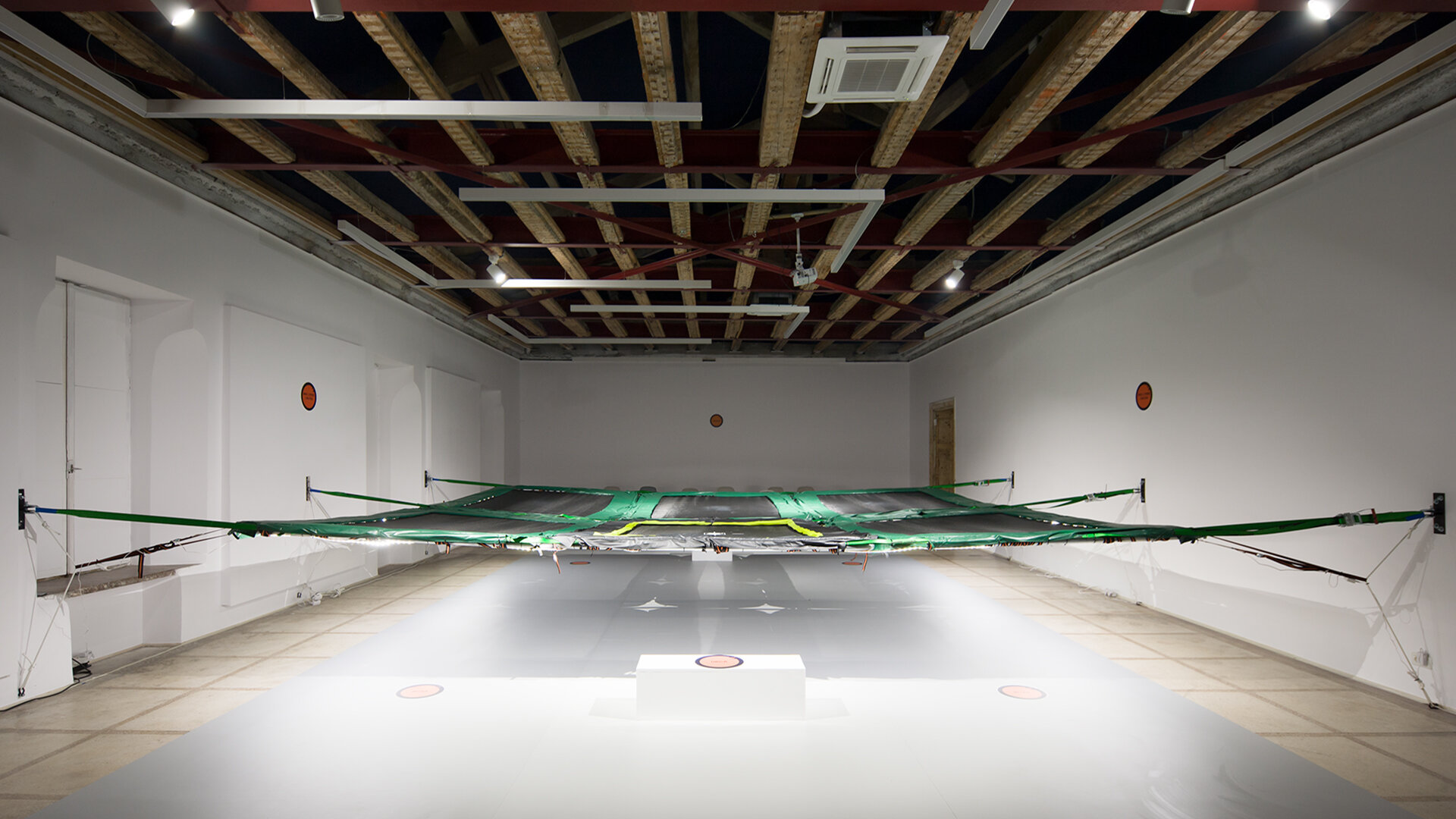 Cele doua instalații (suprafață pictată și planșeul elastic) nu concurează niciodată: sunt luminate pe rand, în funcție de momentele performative.