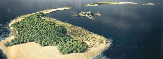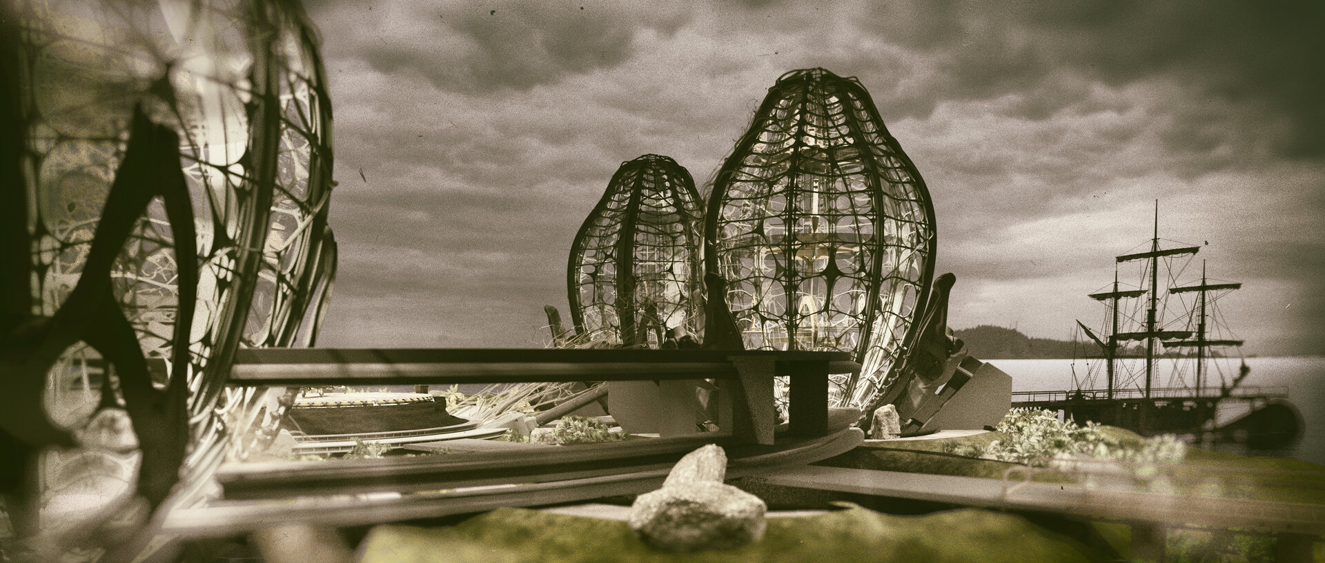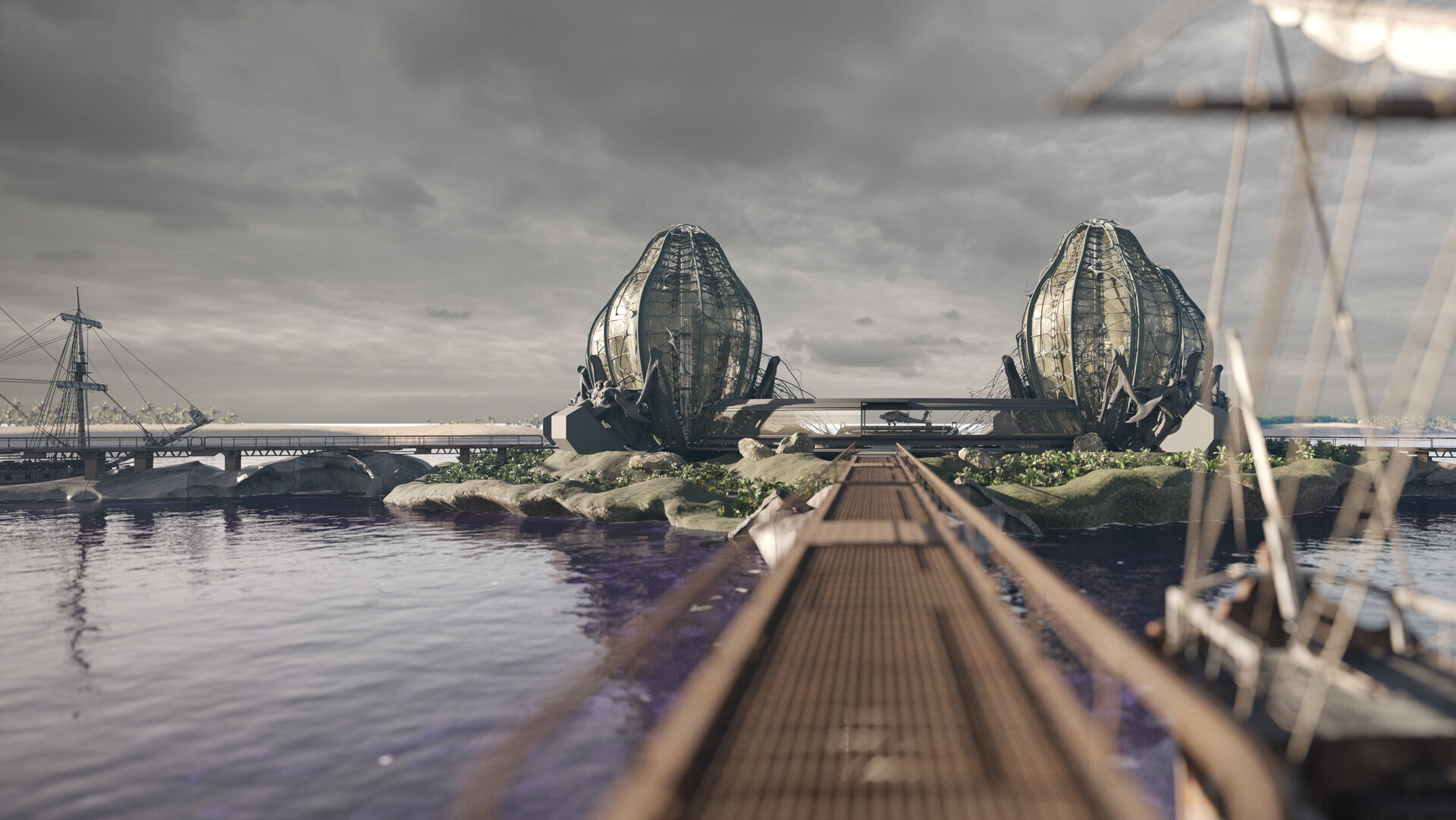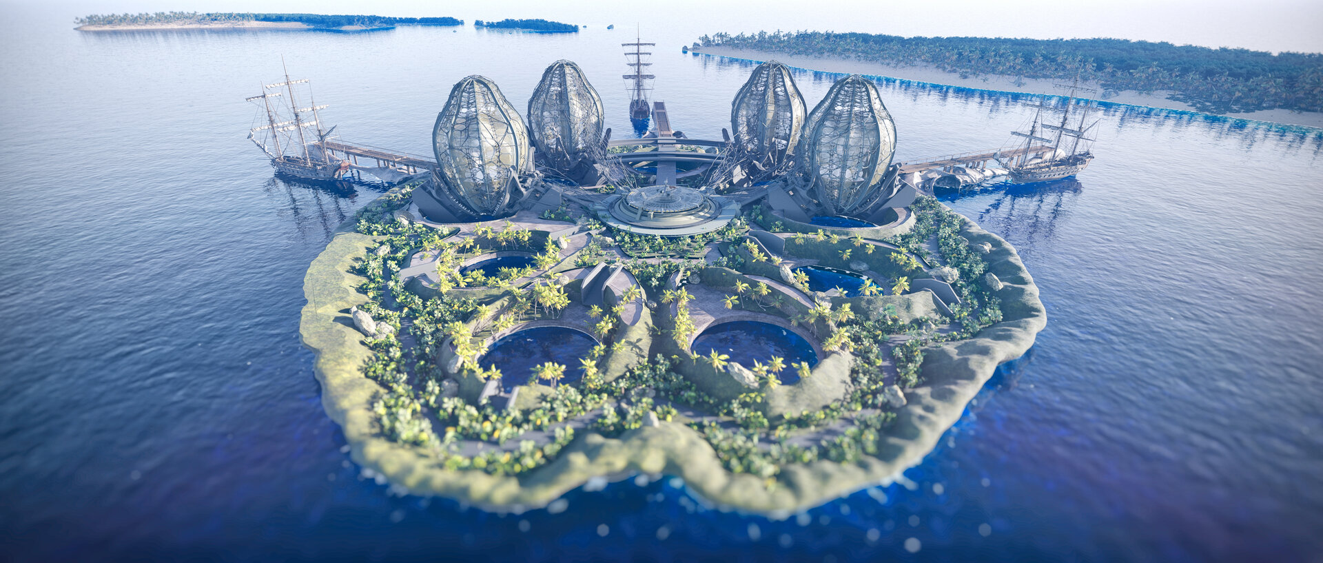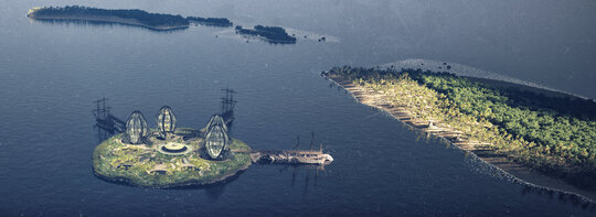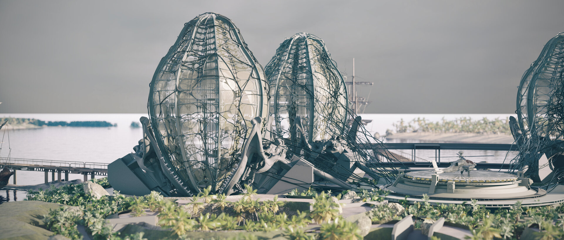 Având în vedere integrarea perspectivei biometrice în principiile de bază ale proiectului, cele patru unități de locuit iau forma unor ouă de fluture monarh ancorate în pontonul ce imită silueta unei flori de lotus prin intermediul unor elemente structurale în forma unui craniu de broască.