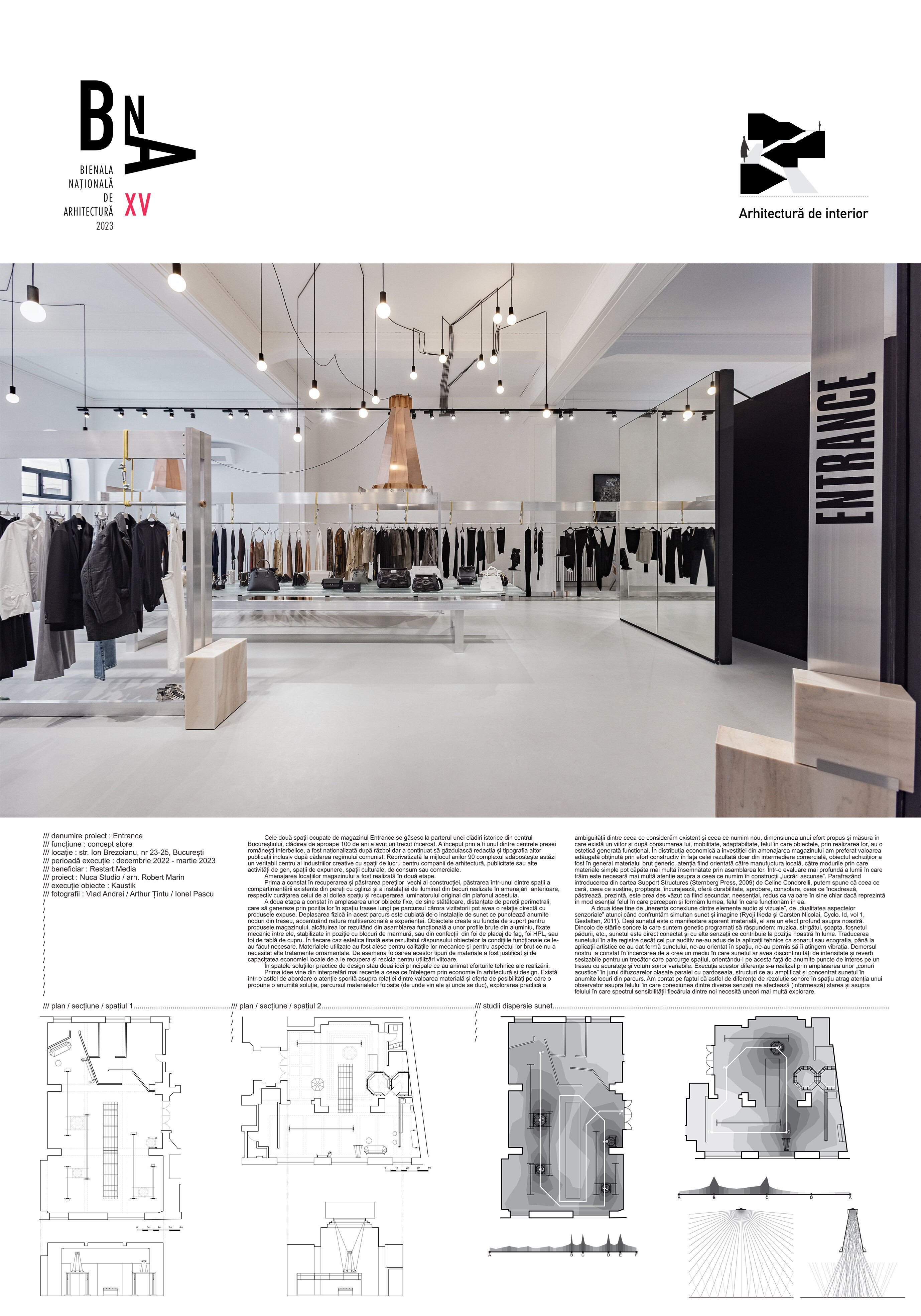 Cele două spații ocupate de magazinul Entrance se găsesc la parterul unei clădiri istorice din centrul Bucureștiului, clădirea de aproape 100 de ani a avut un trecut încercat. A început prin a fi unul dintre centrele presei românești interbelice, a fost naționalizată după război dar a continuat să găzduiască redacția și tipografia altor publicații inclusiv după cădarea regimului comunist. Reprivatizată la mijlocul anilor 90 complexul adăpostește astăzi un veritabil centru al industriilor creative cu spații de lucru pentru companii de arhitectură, publicitate sau alte activități de gen, spații de expunere, spații culturale, de consum sau comerciale.