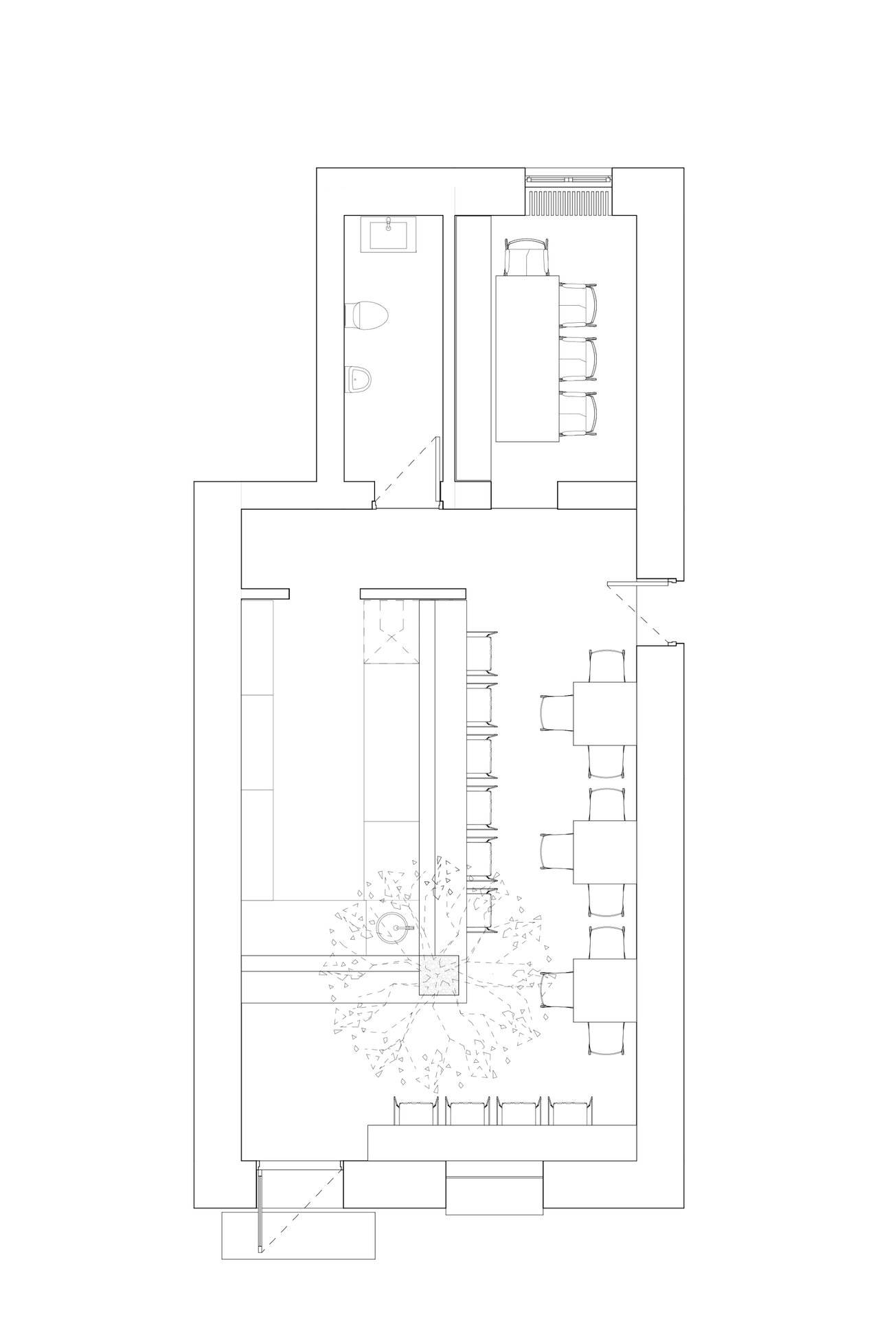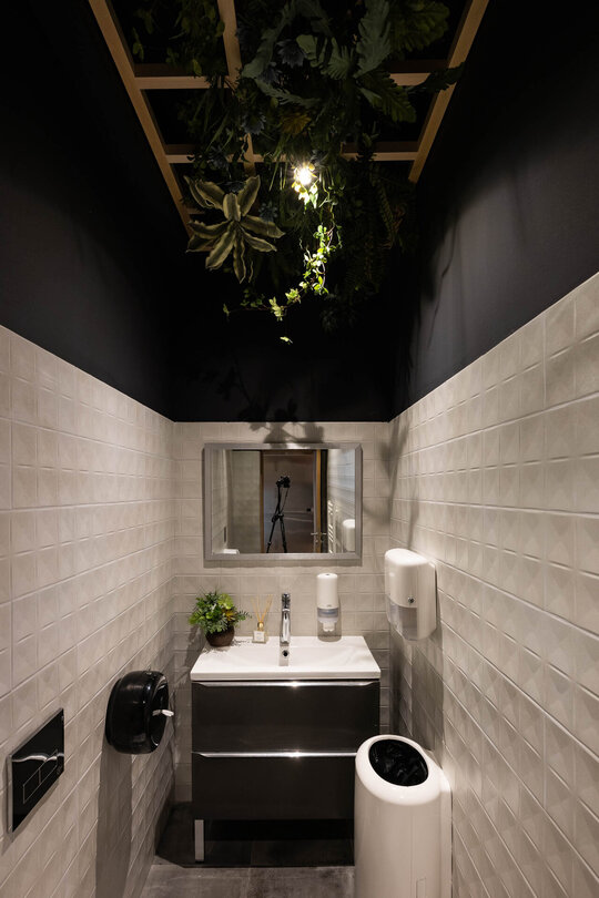 Tavanul din lemn al restaurantului ascunde toate instalațiile necesare pentru a asigura buna funcționare a spațiului, oferind totodată o experiență vizuală curată și plăcută pentru clienți. Toate conductele, cablurile și echipamentele necesare au fost discret instalate deasupra structurii de lemn și cu scopul de a le face complet invizibile clienților, aceste instalații au fost vopsite în negru, asigurând o armonie perfectă cu culoarea tavanului și creând iluzia că acestea pur și simplu nu există.
