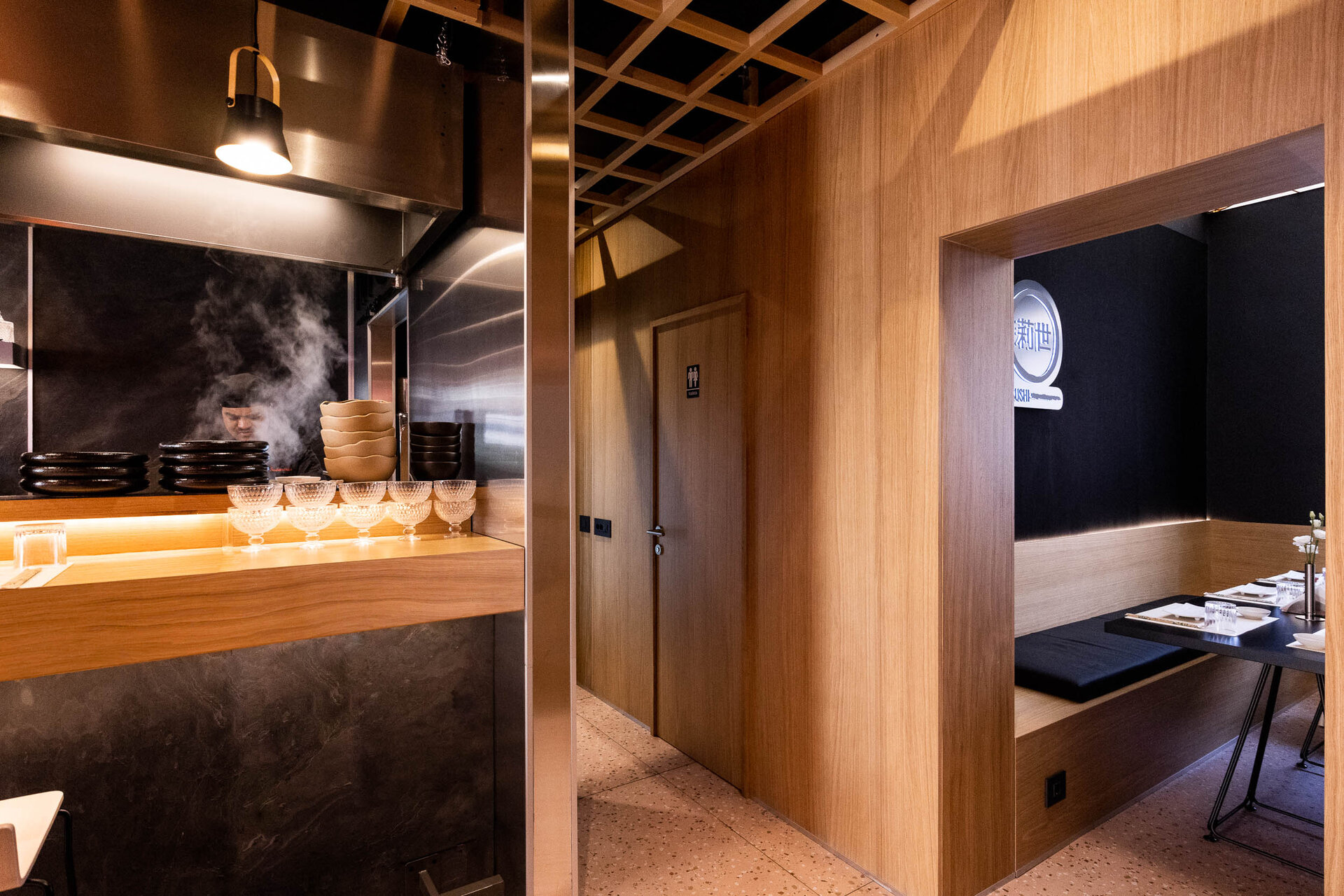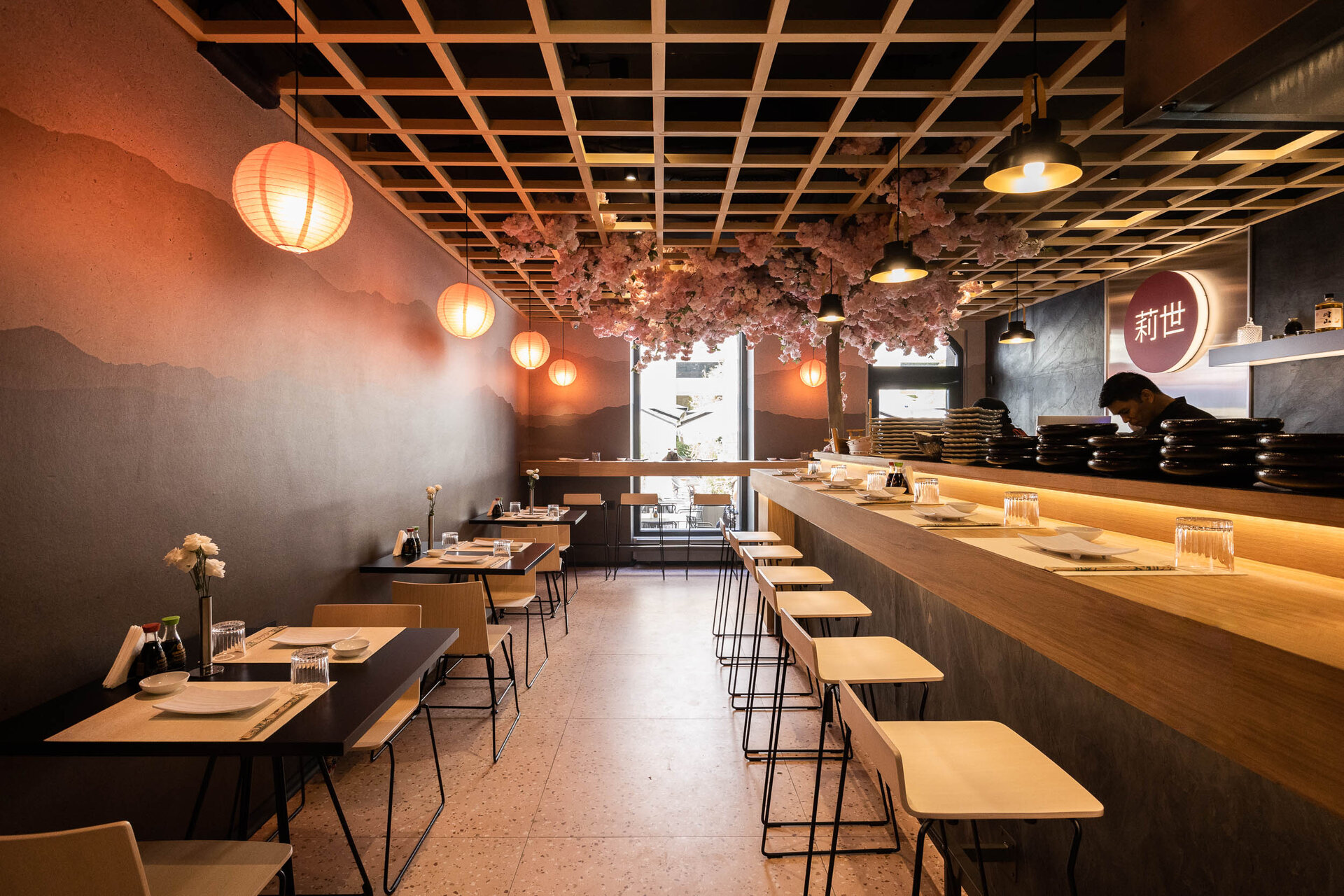 Aceste materiale naturale sunt combinate cu elemente industriale precum și inoxul, care adaugă un aer autentic spațiului. Folosirea materialelor robuste aduce un strop de duritate în design, amintind de esența culturii japoneze. Cu toate acestea, pentru a crea un echilibru vizual și o atmosferă caldă și primitoare, un terazzo într-o nuanță deschisă de roz-somon este introdus în design. Acest element aduce un contrast placut și scoate în evidență frumusețea a cireșului japonez, cu florile sale delicate și efemere.