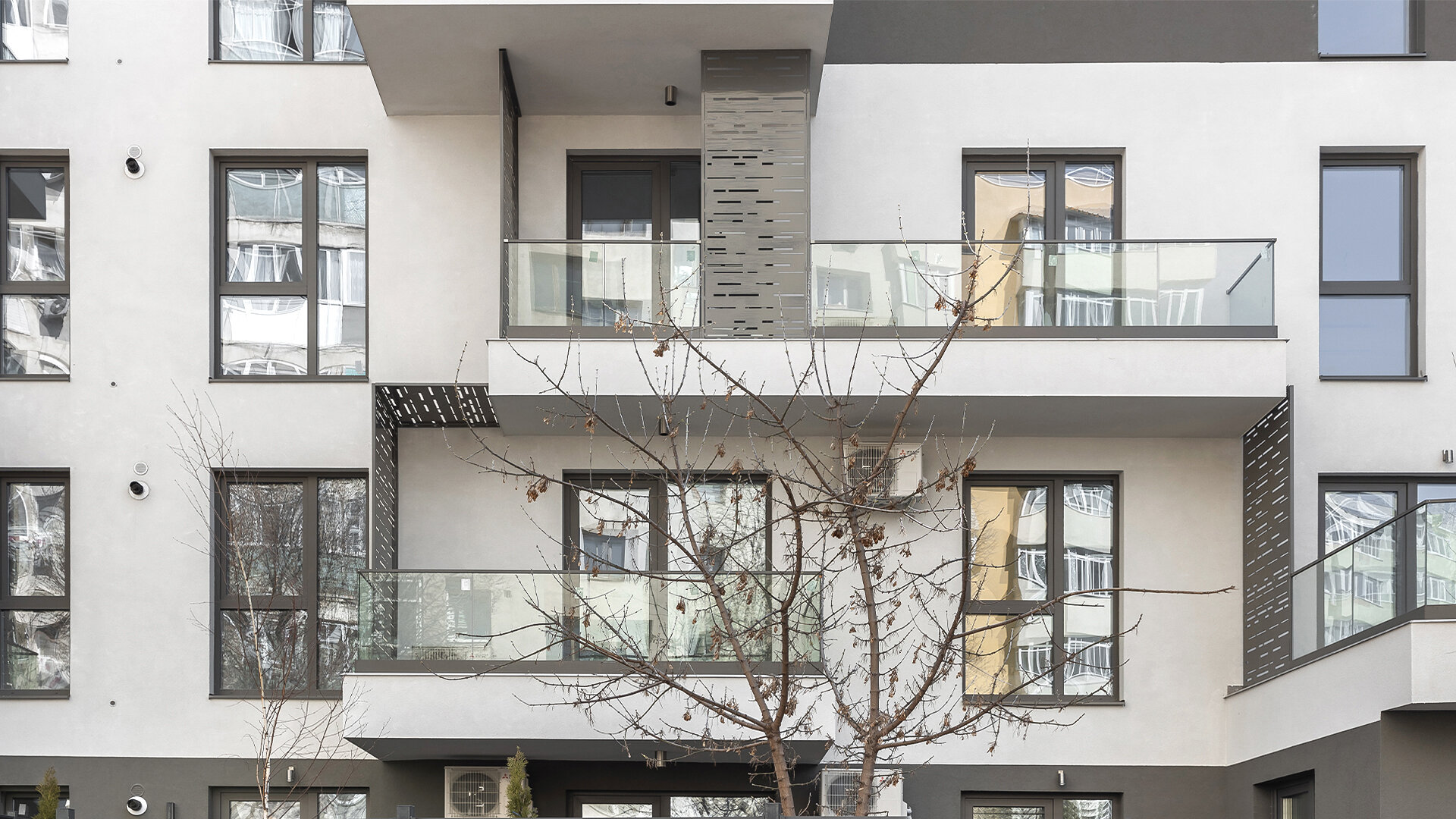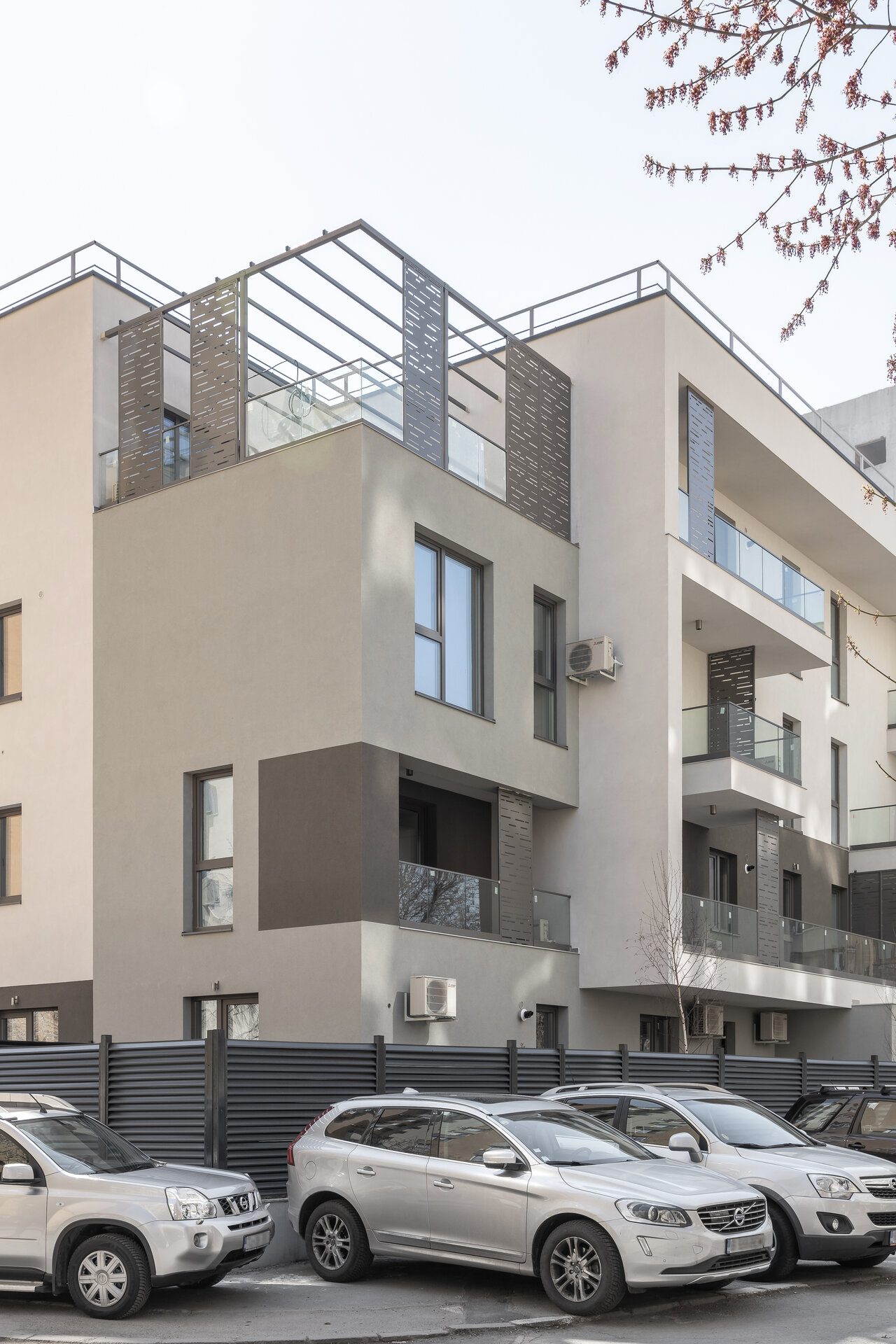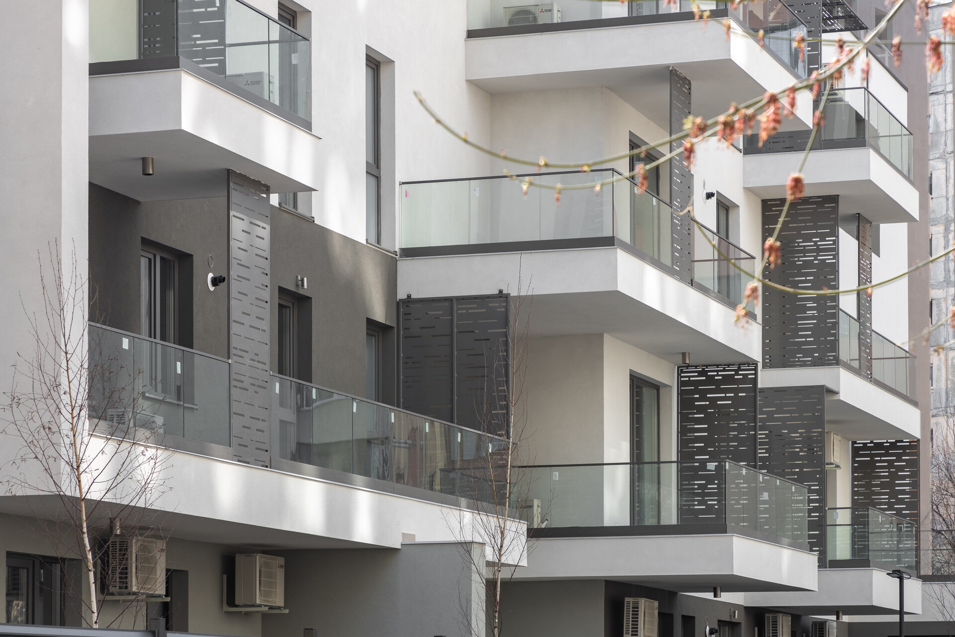 Panourile metalice propuse pe fațade au rol dublu. Unesc vizual elemente volumetrice și asigură în același timp intimitate, fiind poziționate astfel încât să limiteze vederea spre balconul vecin.