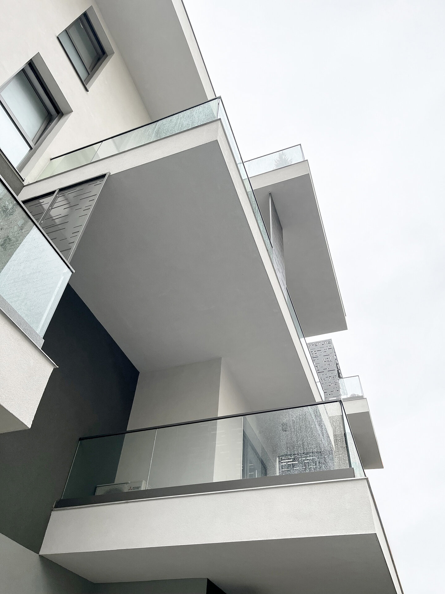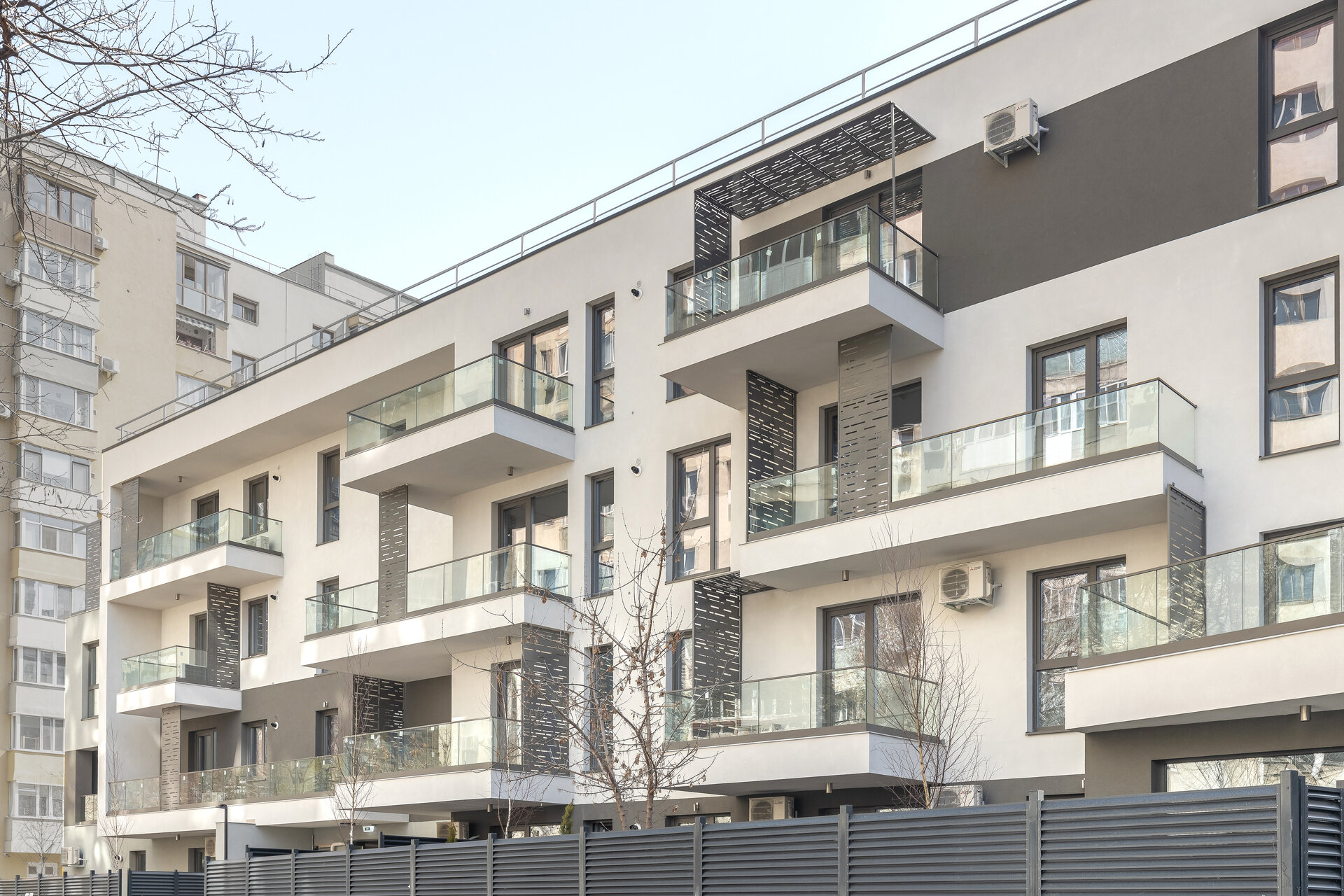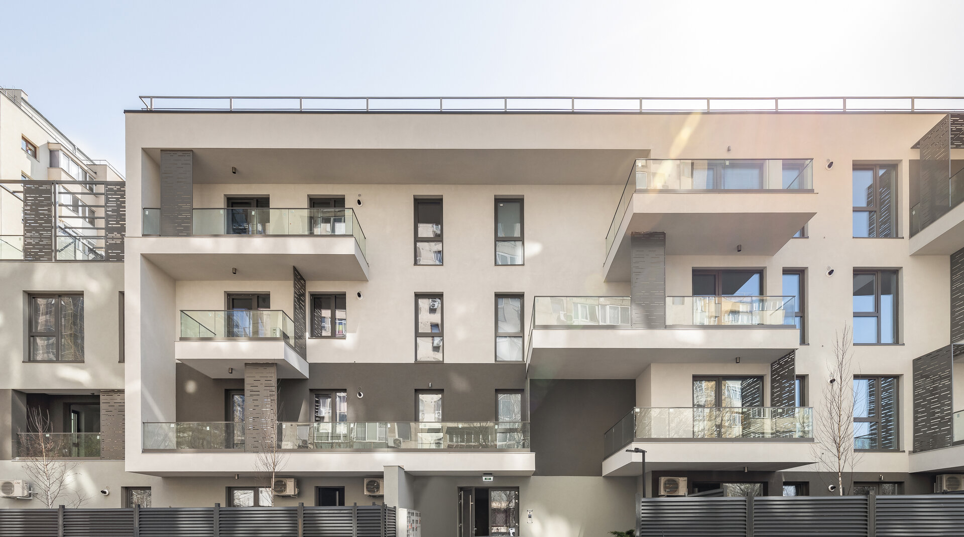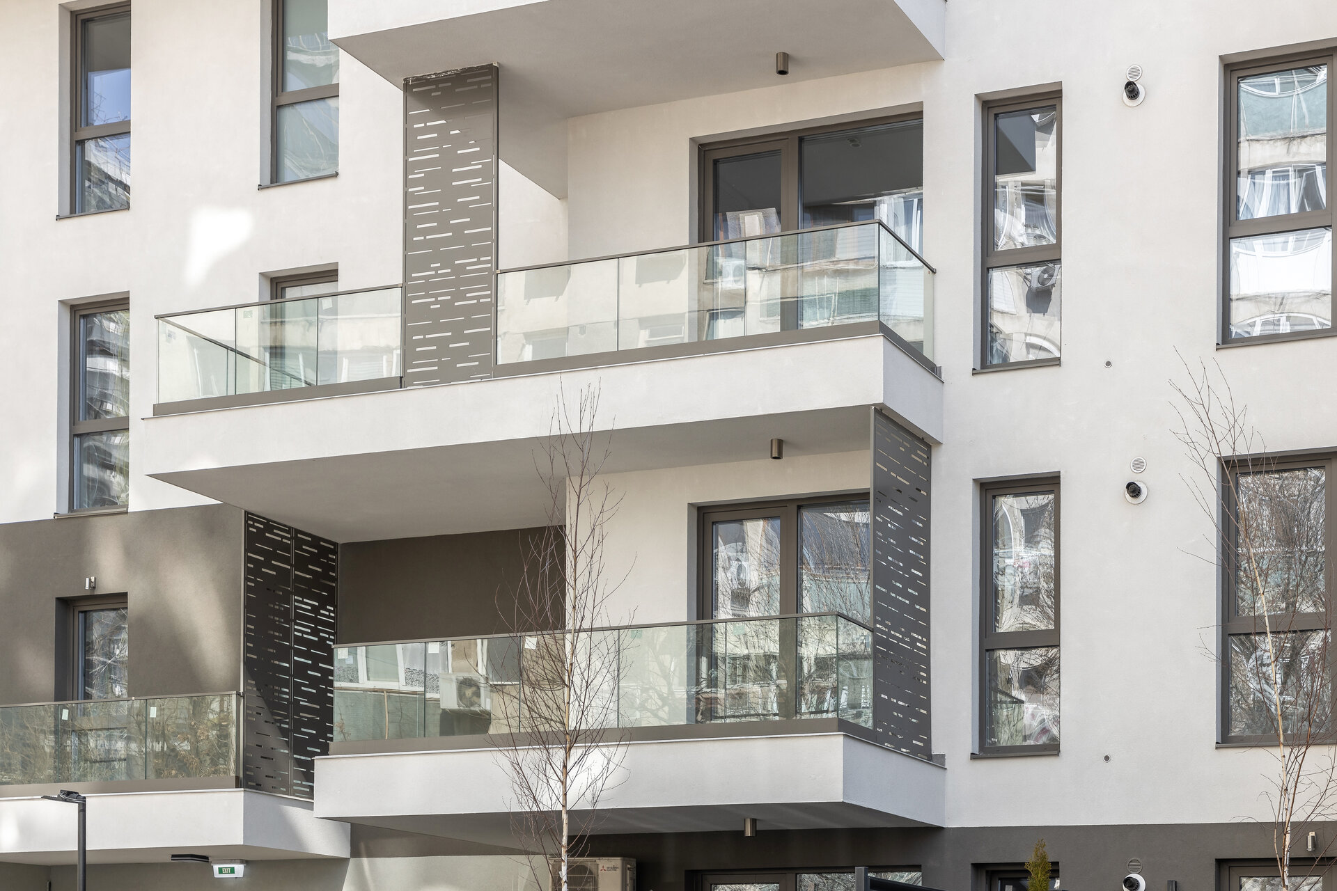 Panourile metalice propuse pe fațade au rol dublu. Unesc vizual elemente volumetrice și asigură în același timp intimitate, fiind poziționate astfel încât să limiteze vederea spre balconul vecin.