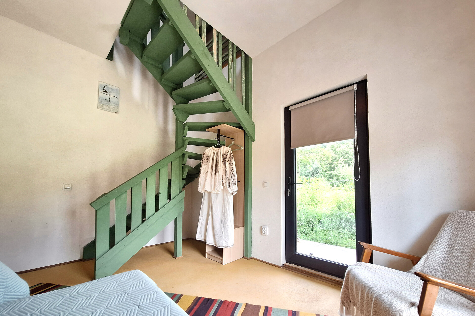În parter există patru camere dispuse pe fiecare dintre cele patru colțuri și un spațiu mai mic, central pe latura de nord, opusă grădinii, cu rol de depozitare și cameră tehnică. Cele patru încăperi sunt independente, cu acces din exterior, de pe prispă. Trei dintre ele au rol de mici locuri individuale, de lucru sau de stat și de relaxare, fiecare având o cameră corespondentă în mansardă, cu care comunică prin intermediul a câte unei scări din lemn. Cea de a patra încăpere, amplasată către grădină, este cea mai mare, fiind un spațiu comun de gătit și de luat masa, conectat, de asemenea printr-o scară de lemn, cu o zonă de socializare, de lectură sau de relaxare, aflată în mansardă. Tot acest spațiu comun are acces la un grup sanitar, precum și la camera tehnică și de depozitare.