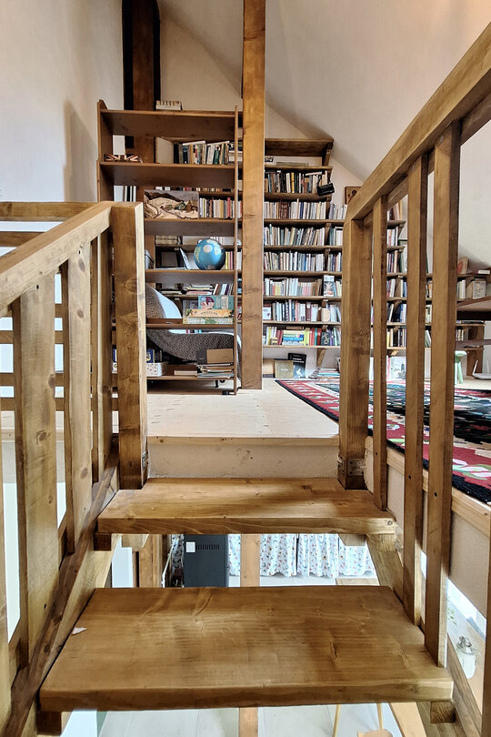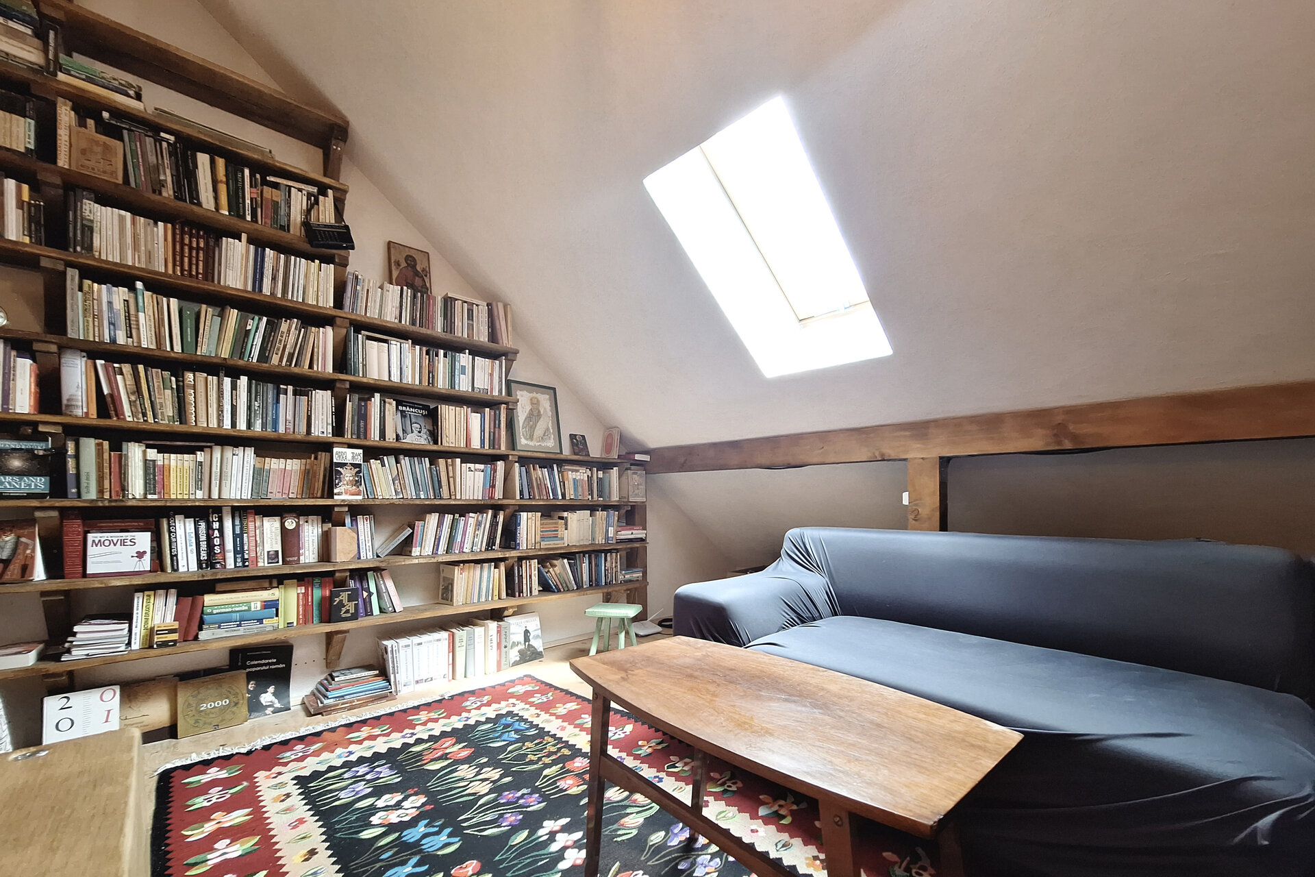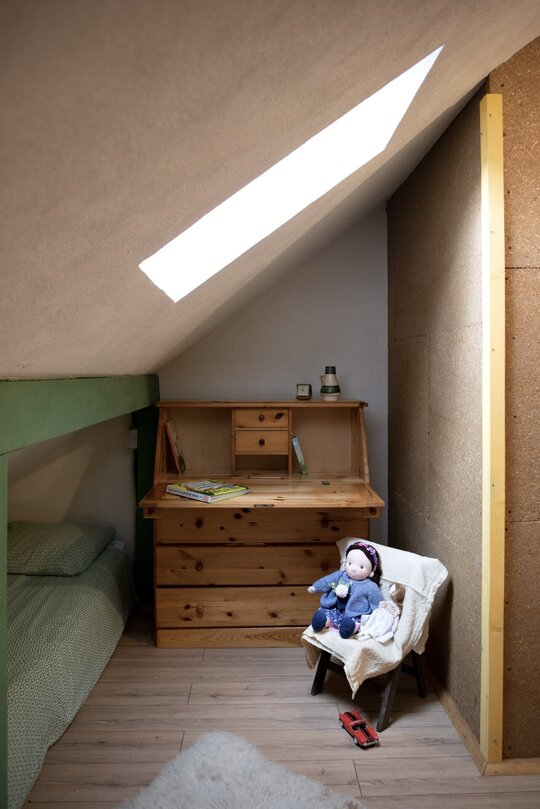 Mansarda constă în cele patru încăperi ce își asumă fiecare câte un colț, respectiv, sfert din acoperire. Trei dintre ele corespund spațiilor individuale din parter și funcționează ca zone de dormit, fiecare având locuri de depozitare și câte o baie minimală. Cea de a patra încăpere, aflată peste spațiul comun de gătit și de luat masa, este un loc de socializare în care oaspeții se pot relaxa citind sau lucrând.