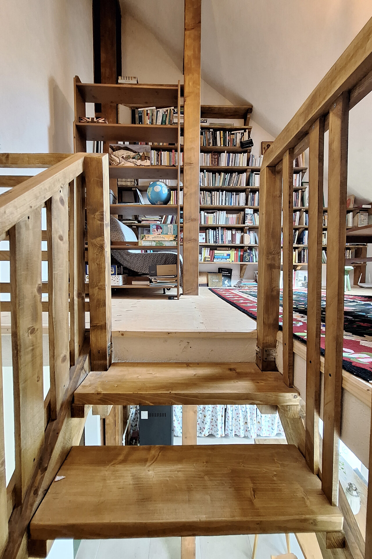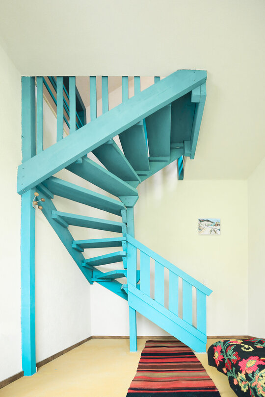 La interior pereții sunt placați cu gipscarton vopsit alb, sau cu panouri din microfibre de paie rămase aparente, fiecare mic „duplex” fiind diferit prin cromatica aleasă pentru vopseaua scărilor și a balustradelor, precum și prin culoarea elementelor ceramice din băi. Mobilierul este minimal, din piese și obiecte recuperate, adaptate sau chiar inventate. Amenajarea spațiilor îi aparține Cristinei și reflectă pasiunea ei pentru echilibrul între confortul contemporan și atmosferă artizanală, caldă și naturală, dată de obiecte, materiale și texturi diferite, armonios îmbinate.
