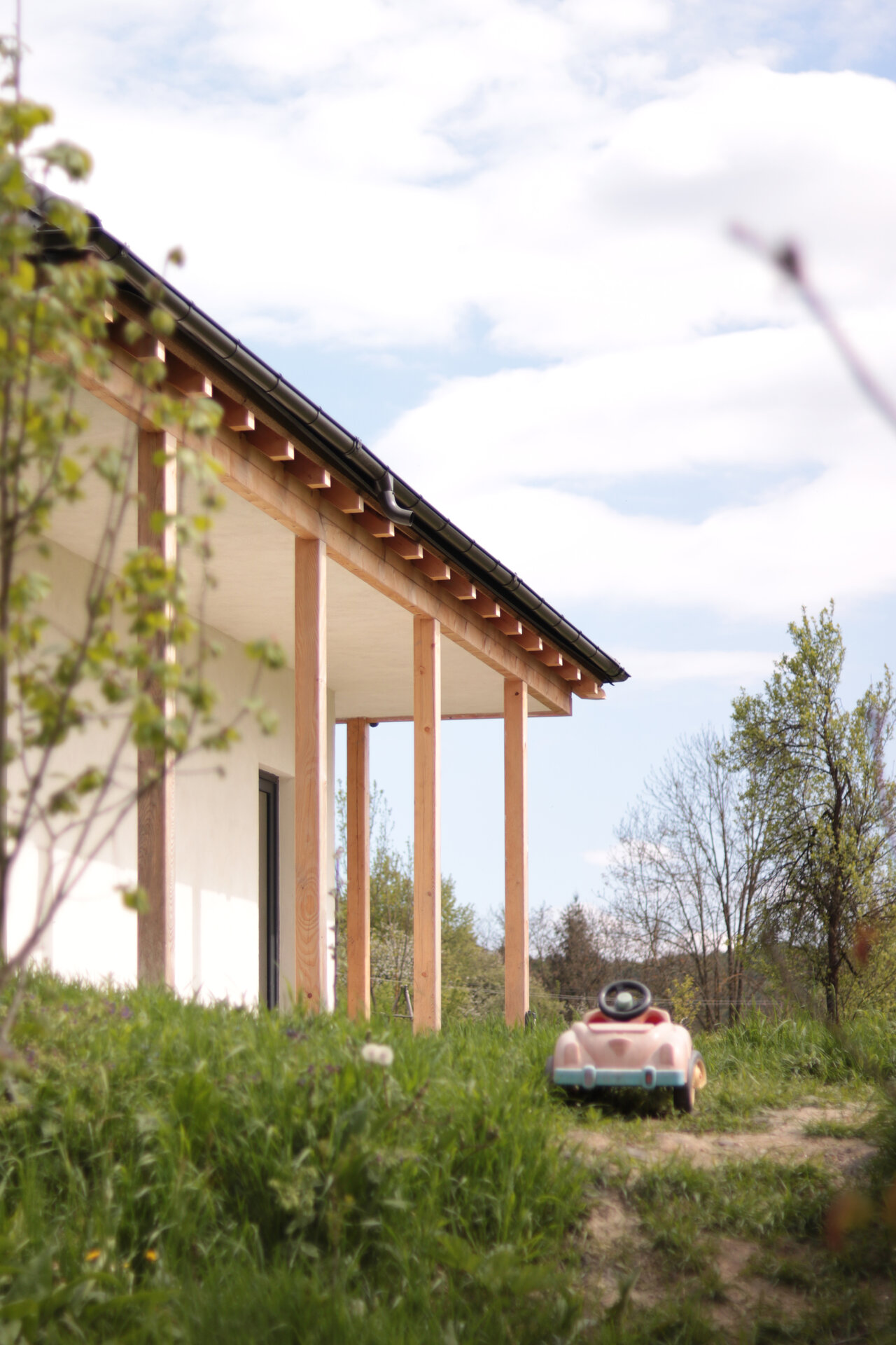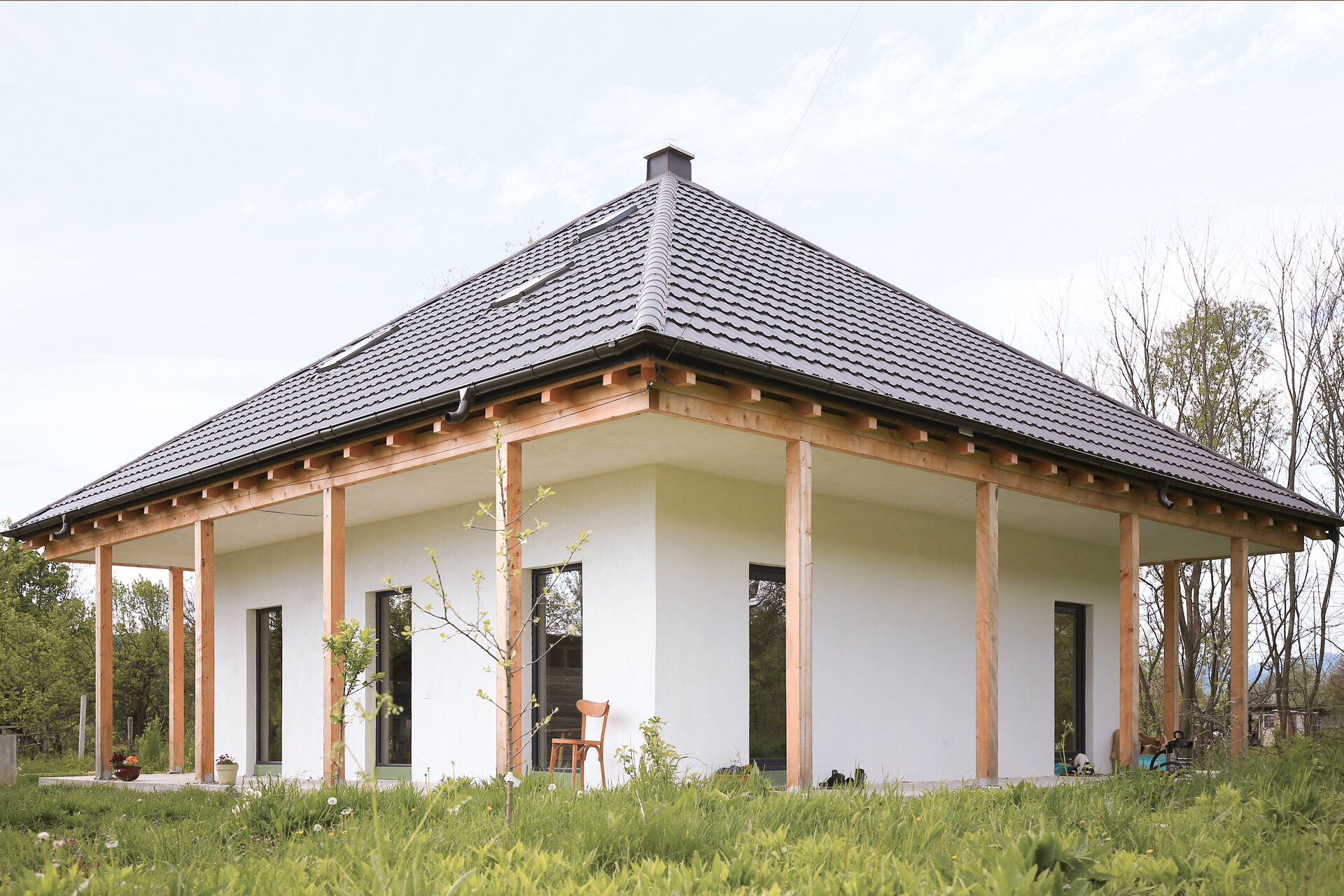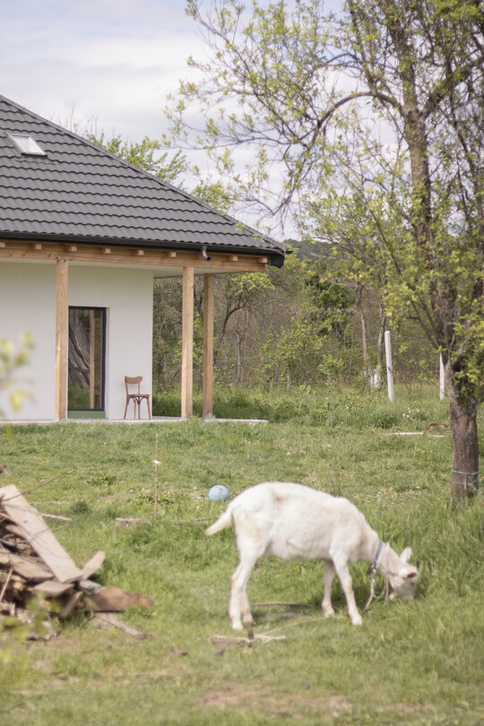 Centrul casei, material și simbolic, este marcat de coșul de fum necesar sobei ce încălzește toate spațiile, amplasată în spațiul comun din parter. În jurul acestui ax se dezvoltă întreaga structură din lemn vizibilă la nivelul unor elemente de tipul stâlpi și grinzi, dar care se îmbracă în diferite texturi de materiale, unele rămânând aparente, altele căpătând culoarea albă. Astfel, la exterior, casa este închisă cu panouri din microfibre de paie, tencuite în alb, exprimând volumul compact al parterului, întrerupt vizual de verticalele subțiri ale stâlpilor prispei și de cele două sau trei deschideri transparente amplasate simetric pe fațadele opuse, toate având dimensiune și rol de uși. Acoperișul, prin contrast, este acoperit cu tablă de culoare gri închis, în care sunt prezente doar câteva mici și punctuale luminatoare de tip Velux, ce ventilează și aduc lumină în încăperile mansardei.