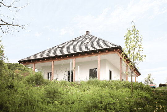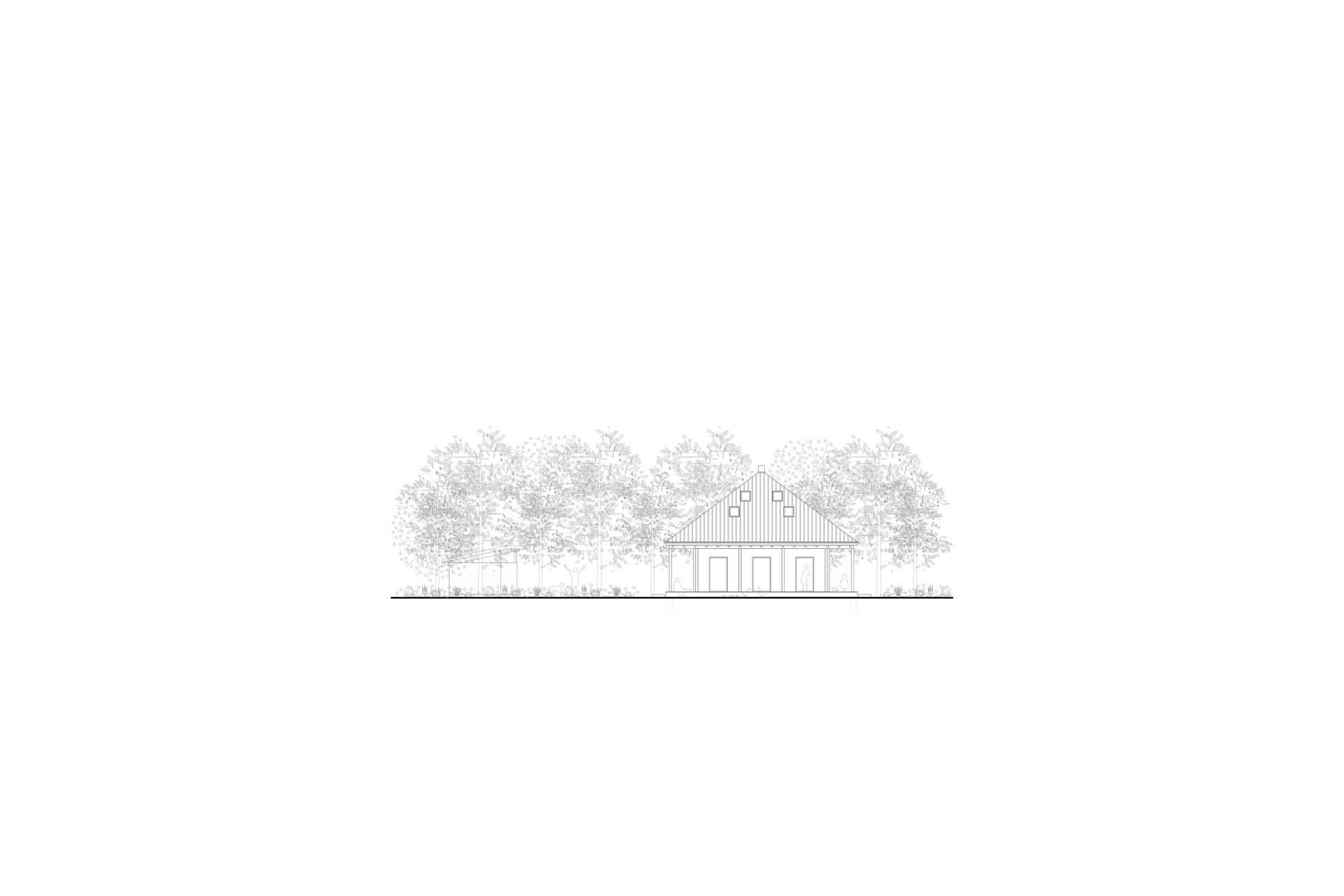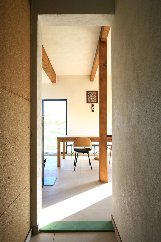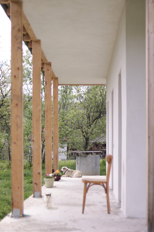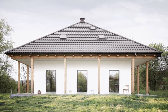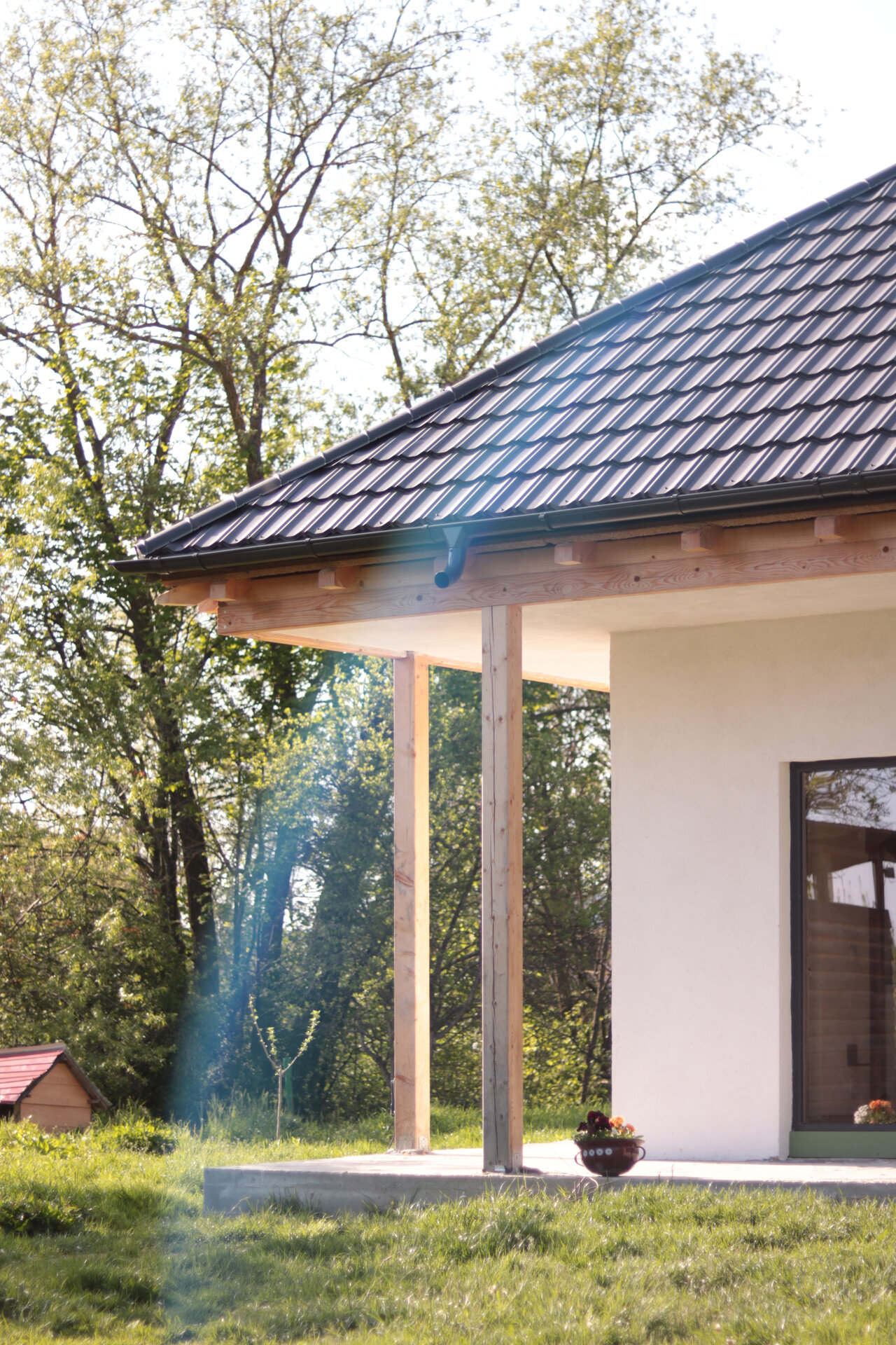 Centrul casei, material și simbolic, este marcat de coșul de fum necesar sobei ce încălzește toate spațiile, amplasată în spațiul comun din parter. În jurul acestui ax se dezvoltă întreaga structură din lemn vizibilă la nivelul unor elemente de tipul stâlpi și grinzi, dar care se îmbracă în diferite texturi de materiale, unele rămânând aparente, altele căpătând culoarea albă. Astfel, la exterior, casa este închisă cu panouri din microfibre de paie, tencuite în alb, exprimând volumul compact al parterului, întrerupt vizual de verticalele subțiri ale stâlpilor prispei și de cele două sau trei deschideri transparente amplasate simetric pe fațadele opuse, toate având dimensiune și rol de uși. Acoperișul, prin contrast, este acoperit cu tablă de culoare gri închis, în care sunt prezente doar câteva mici și punctuale luminatoare de tip Velux, ce ventilează și aduc lumină în încăperile mansardei.
