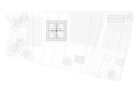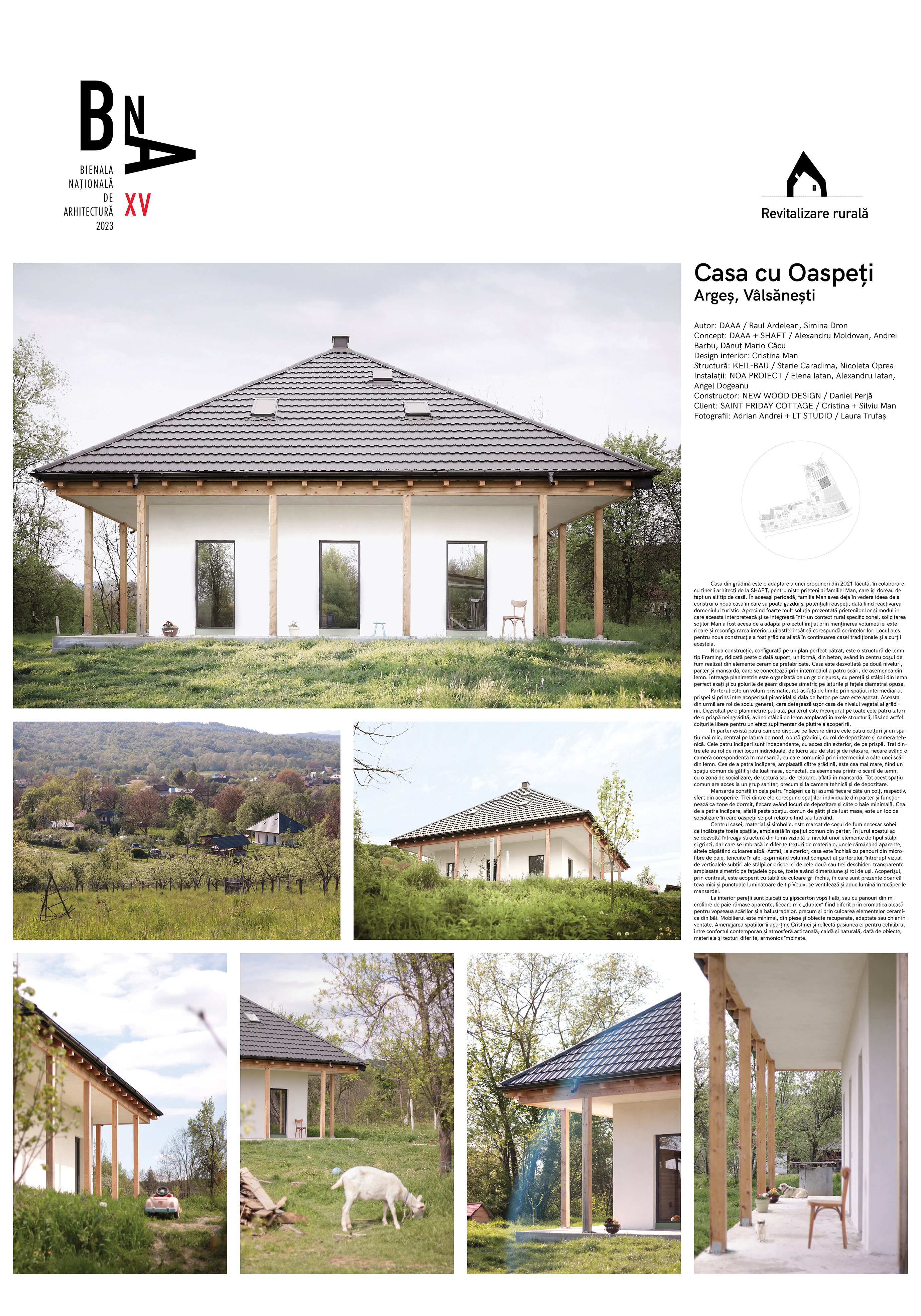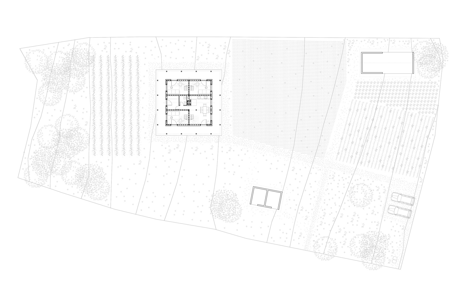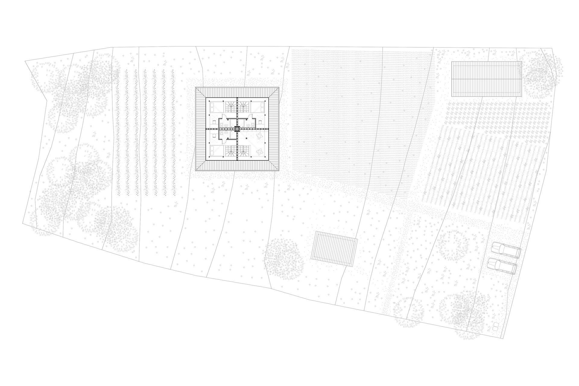 Noua construcție, configurată pe un plan perfect pătrat, este o structură de lemn tip Framing, ridicată peste o dală suport, uniformă, din beton, având în centru coșul de fum realizat din elemente ceramice prefabricate. Casa este dezvoltată pe două niveluri, parter și mansardă, care se conectează prin intermediul a patru scări, de asemenea din lemn. Întreaga planimetrie este organizată pe un grid riguros, cu pereții și stâlpii din lemn perfect axați și cu golurile de geam dispuse simetric pe laturile și fețele diametral opuse.