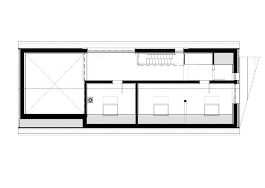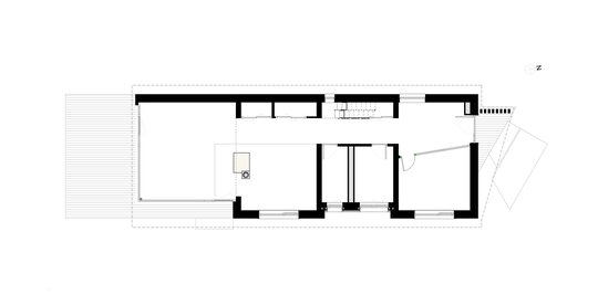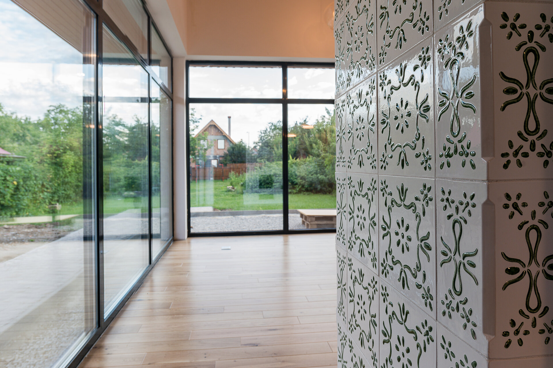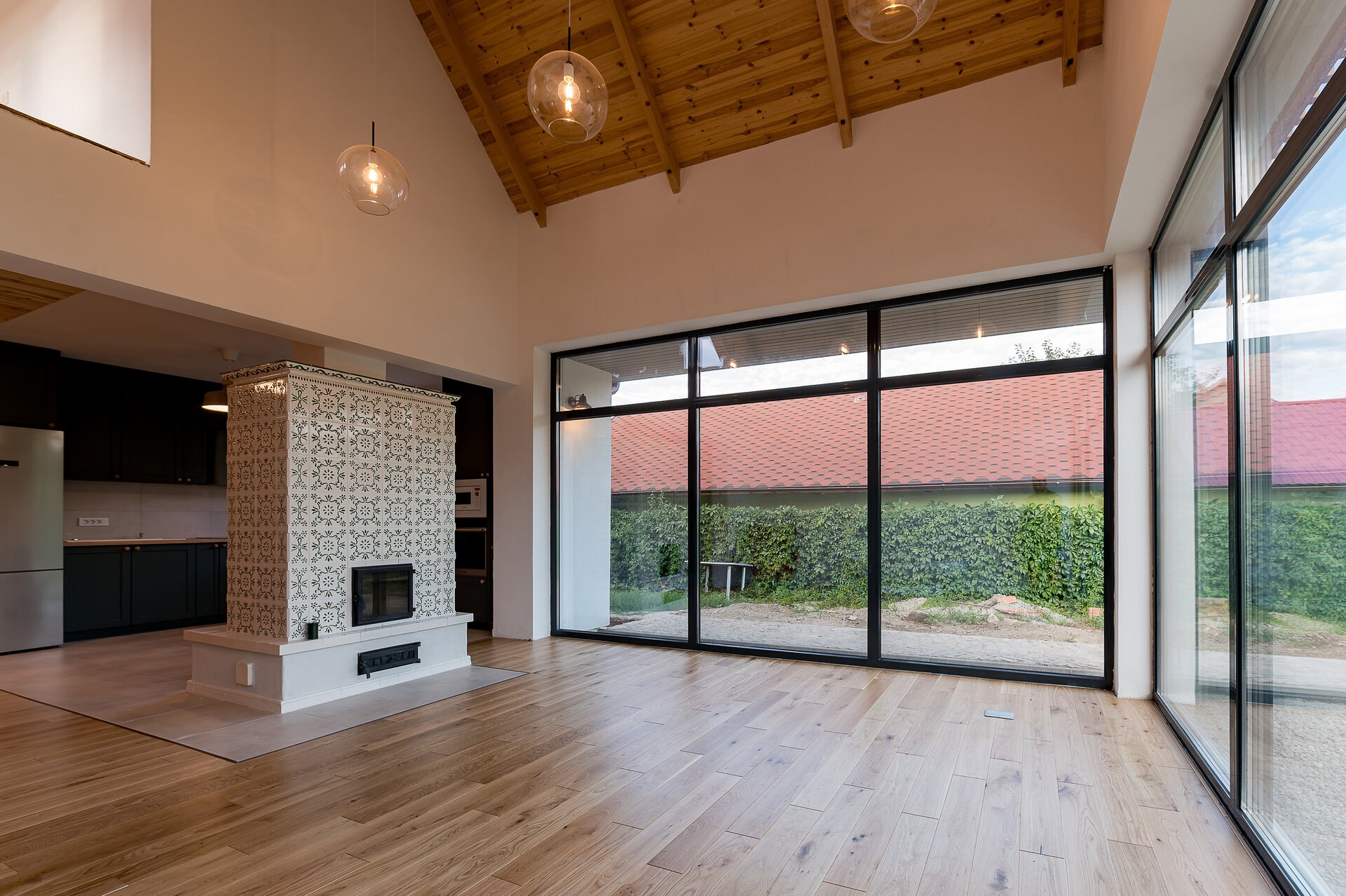 Imediat după intrarea în casă, la capătul celălalt al coridorului se dezvăluie – ca o invitaţie- grădina din spatele clădirii. Dând curs invitraţiei oferite de prezenţa grădinii în casă şi parcurgând coridorul, la capătul celălalt a clădirii, în camera de zi spaţiul interior se expandează atât ca volum (galerie) cât şi vizual (suprafeţele vitrate dau senzaţia ca spaţiul interior se întinde spre curte). Această zona de zi este organizată în jurul „vetrei”, întruchipată de un termoşemineu (îmbrăcat cu piese ceramice artizanale din teracotă smălţuită, având din nou reper tradiţia locală) amplasată între bucătărie şi living. La nivelul parterului găsim în completarea spaţiilor menţionate un dormitor, o baie, un duş şi spaţii anexe (cămară, debara, spaţiu tehnic, etc.)