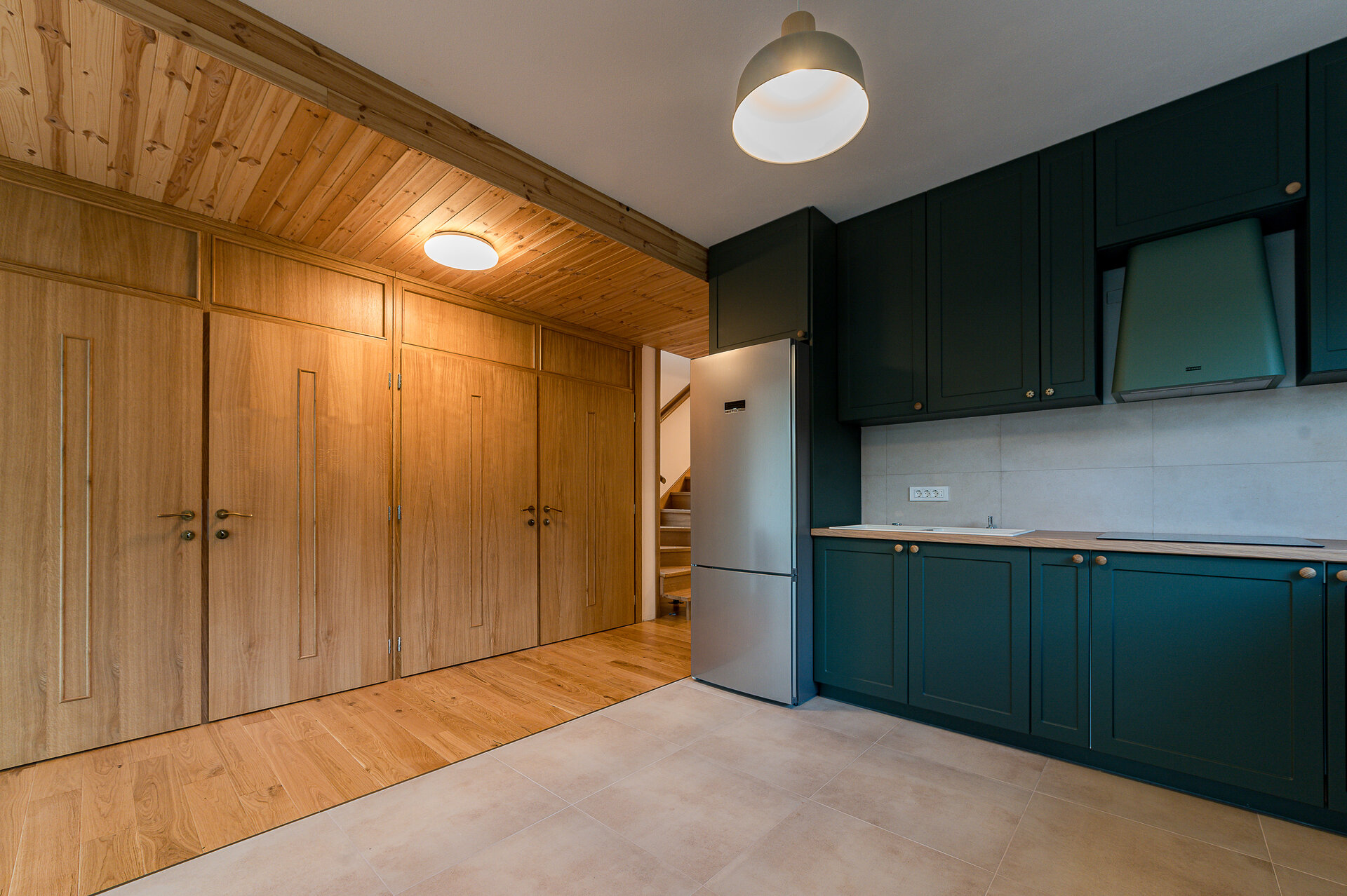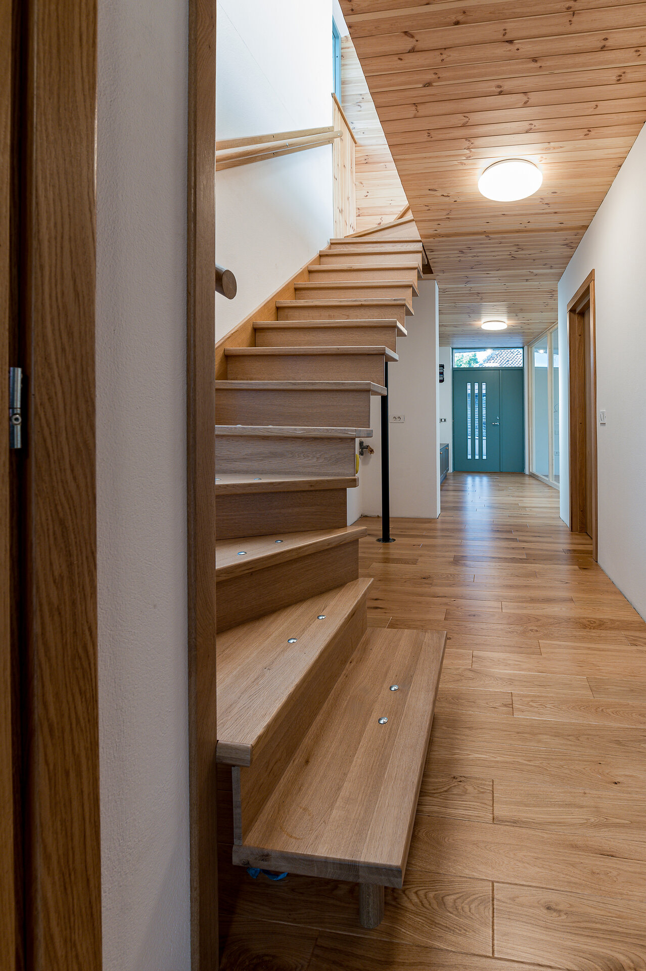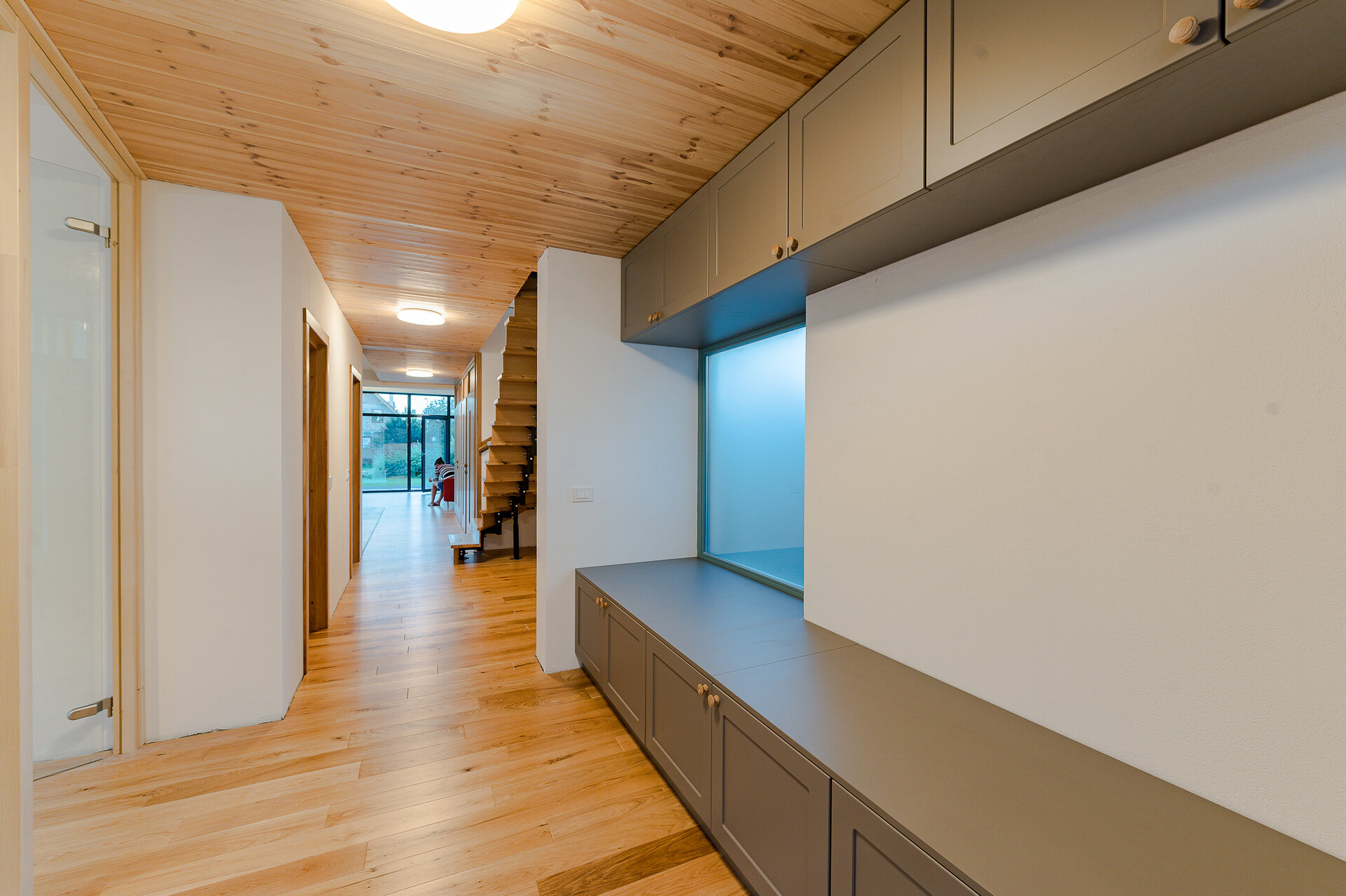 Imediat după intrarea în casă, la capătul celălalt al coridorului se dezvăluie – ca o invitaţie- grădina din spatele clădirii. Dând curs invitraţiei oferite de prezenţa grădinii în casă şi parcurgând coridorul, la capătul celălalt a clădirii, în camera de zi spaţiul interior se expandează atât ca volum (galerie) cât şi vizual (suprafeţele vitrate dau senzaţia ca spaţiul interior se întinde spre curte). Această zona de zi este organizată în jurul „vetrei”, întruchipată de un termoşemineu (îmbrăcat cu piese ceramice artizanale din teracotă smălţuită, având din nou reper tradiţia locală) amplasată între bucătărie şi living. La nivelul parterului găsim în completarea spaţiilor menţionate un dormitor, o baie, un duş şi spaţii anexe (cămară, debara, spaţiu tehnic, etc.)