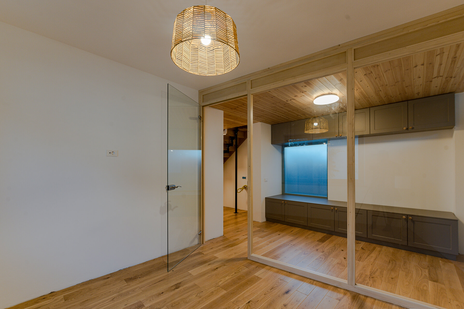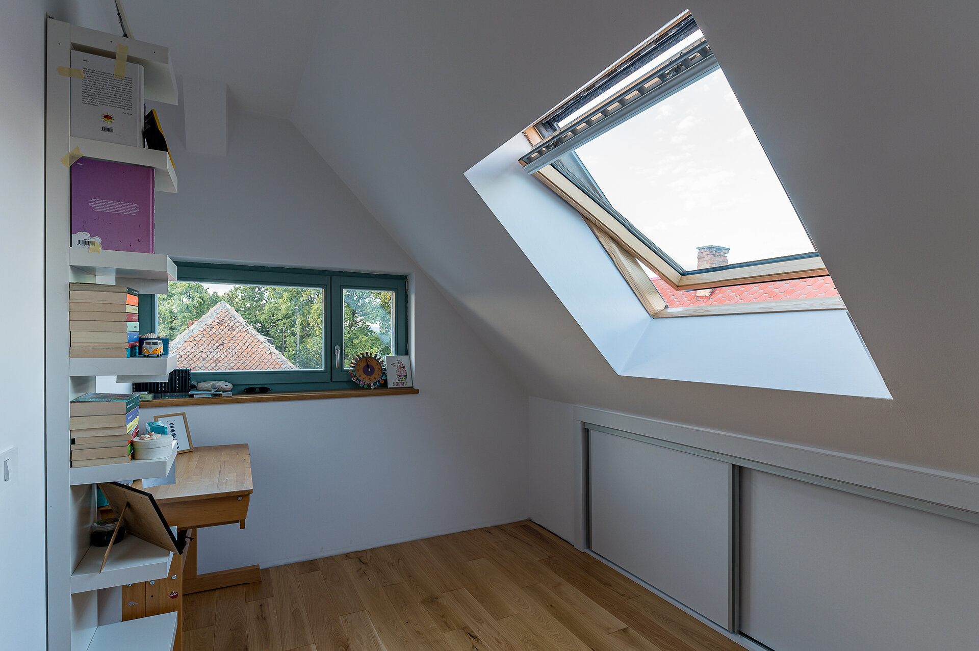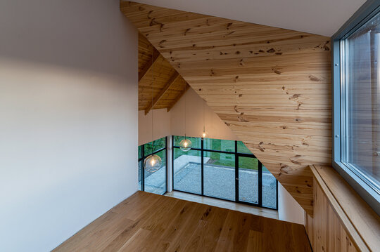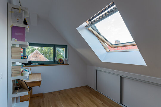 Mansarda adăposteşte spaţiile private a copiilor. Holul mansardei este un fel de spaţiu de refugiu şi de lectură, cu contact audio şi vizual cu zona de zi al parterului.