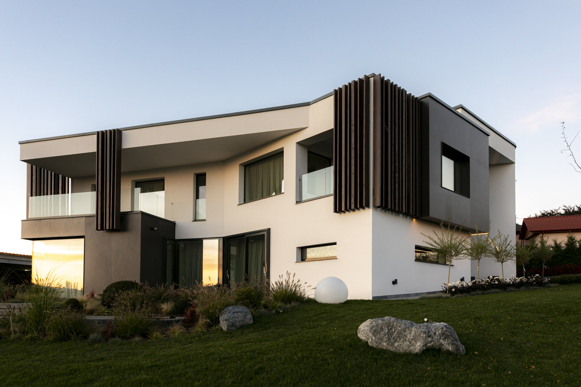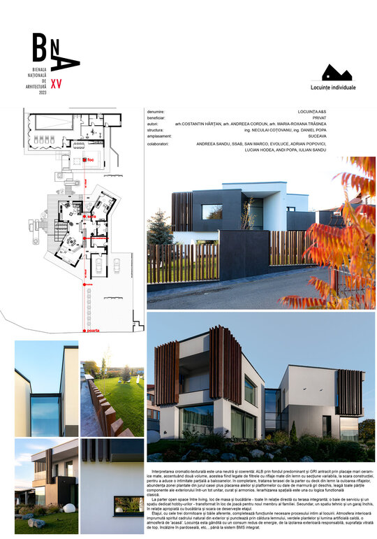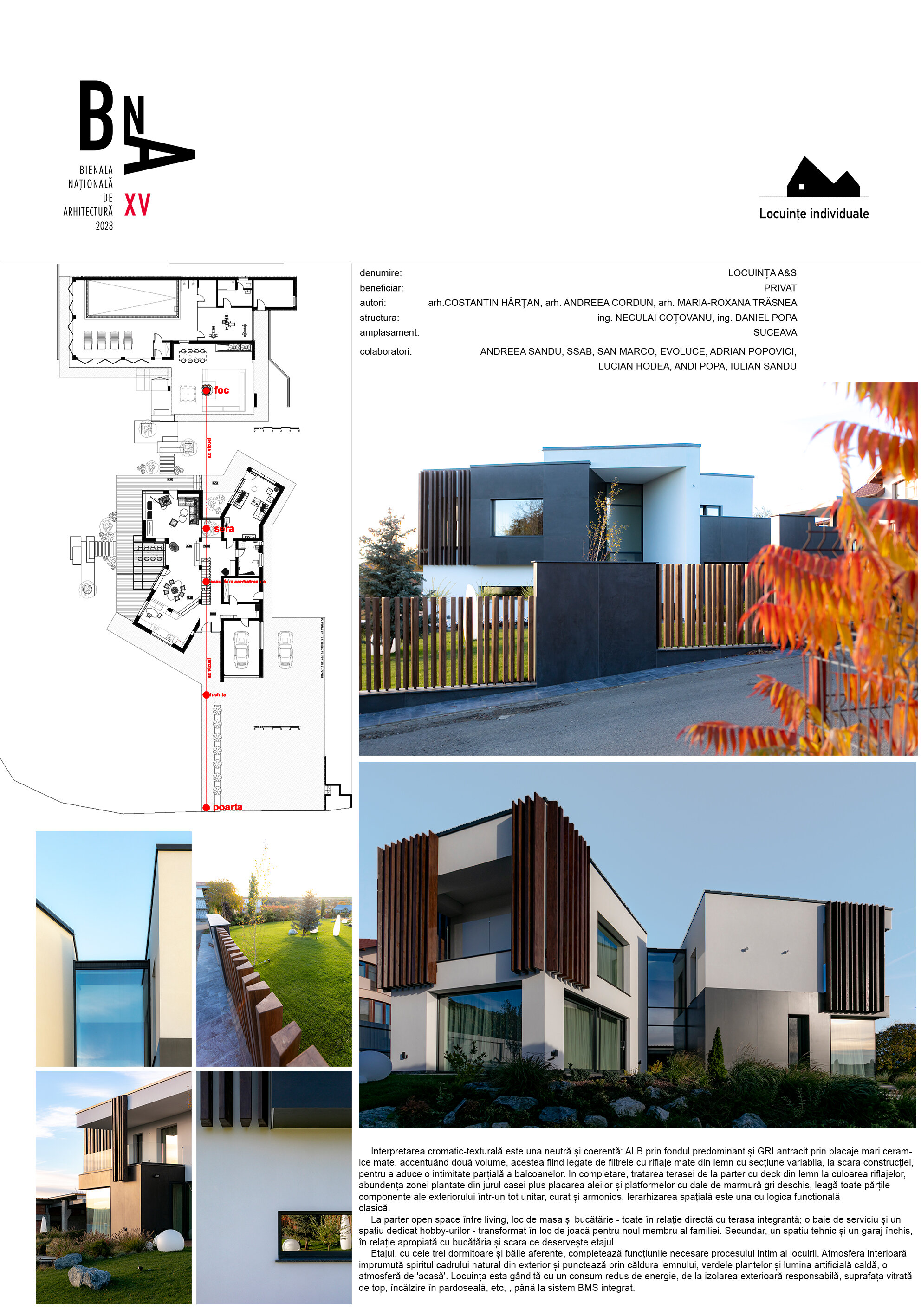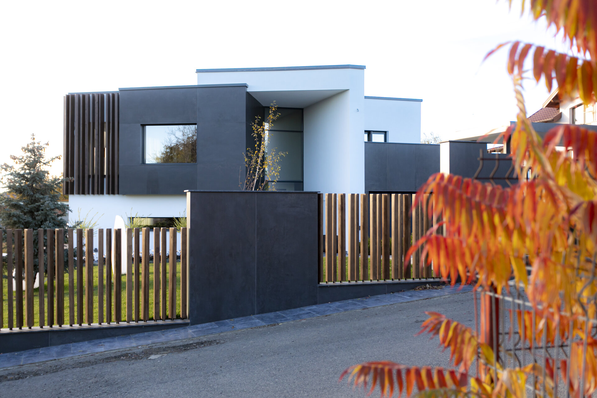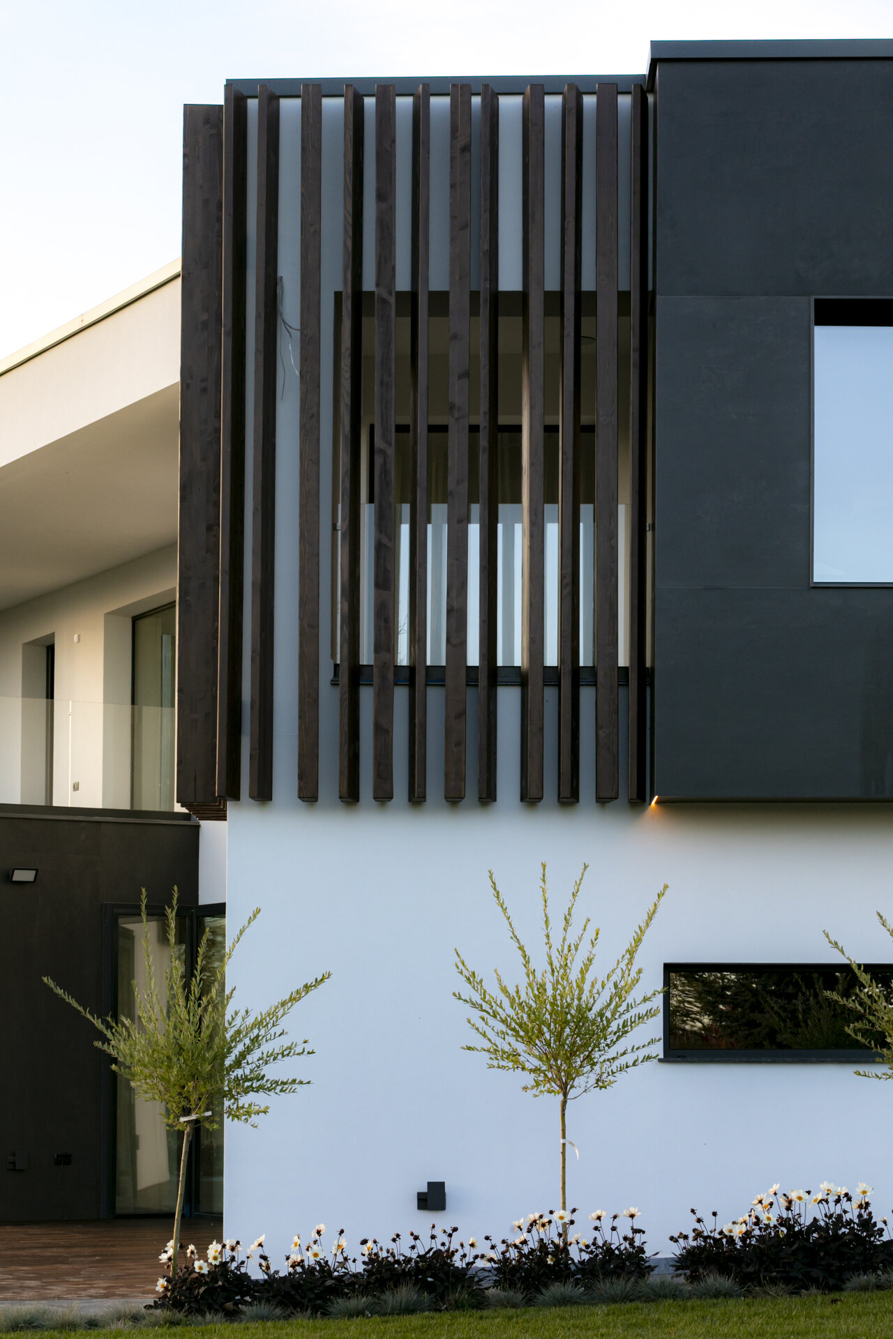 variabilă. Zonele pilelor opace ale gardului, îmbrăcate complet în ceramica gri antracit mat, creează ecrane pe care se profilează