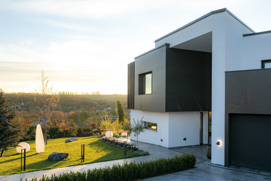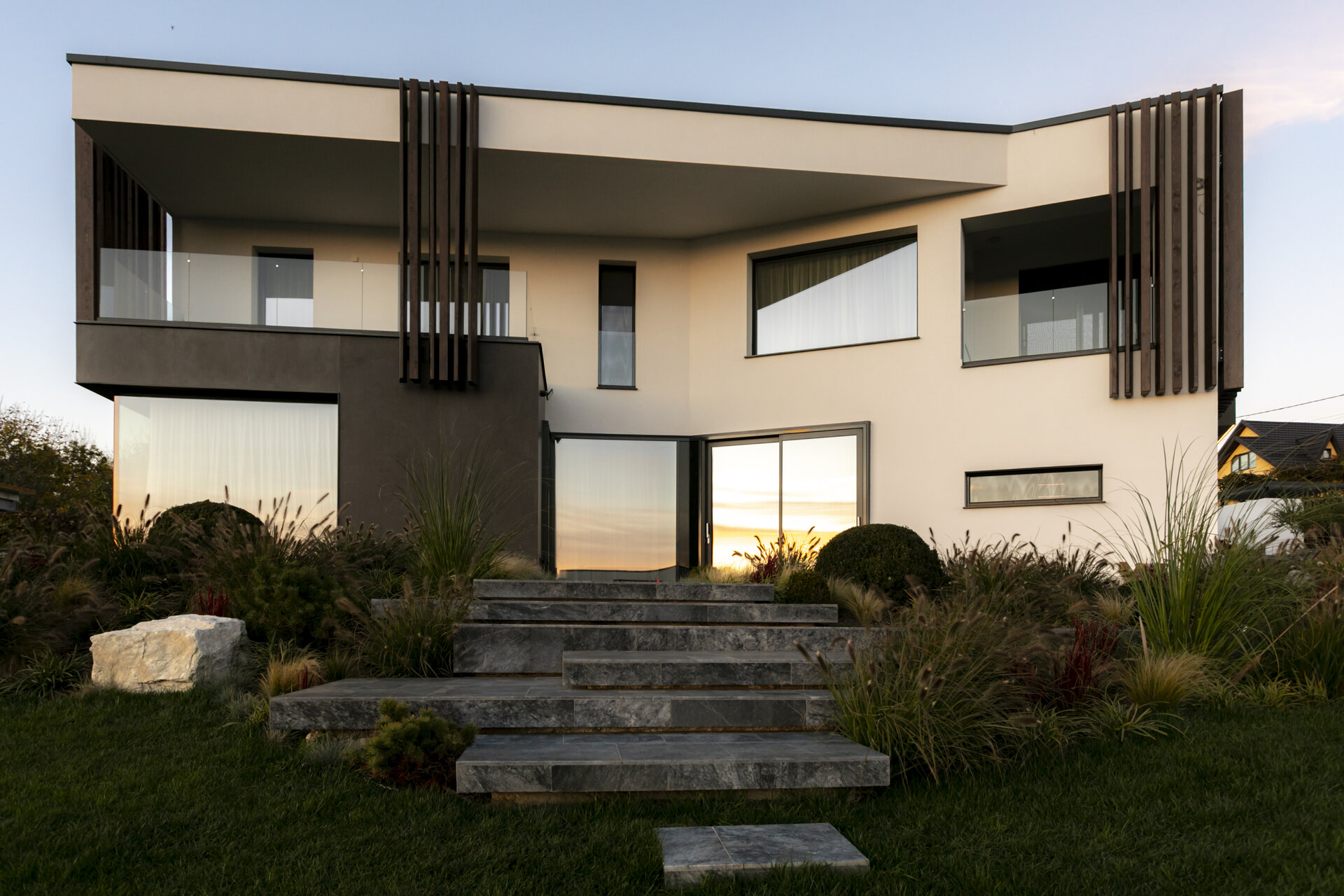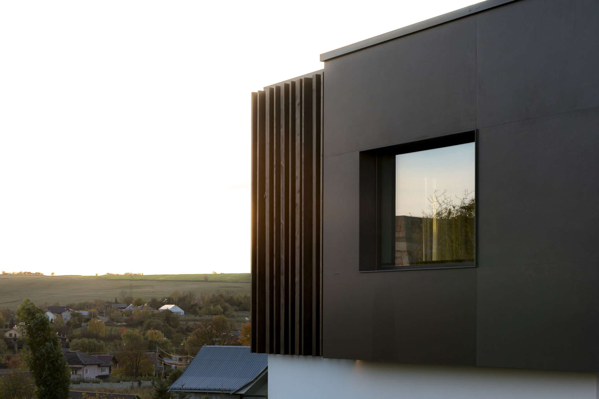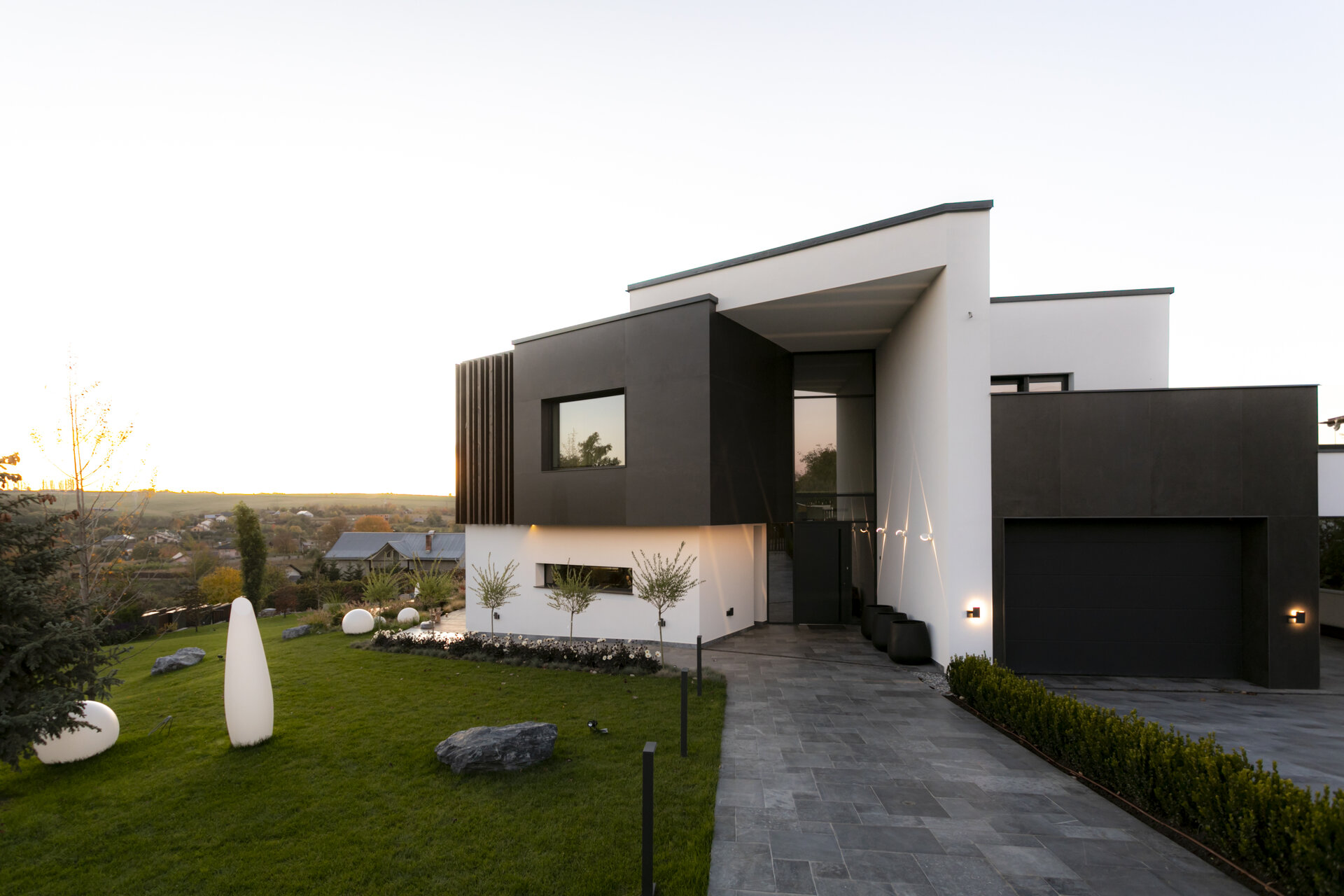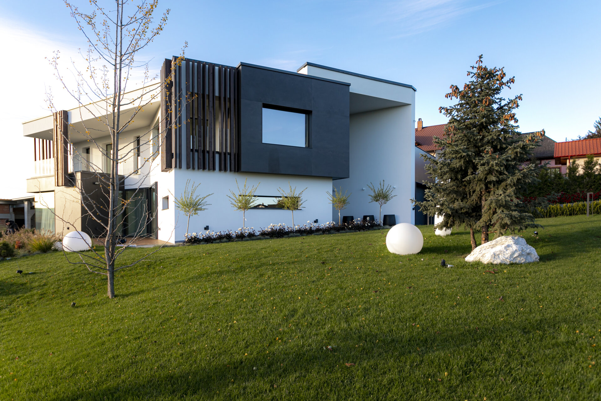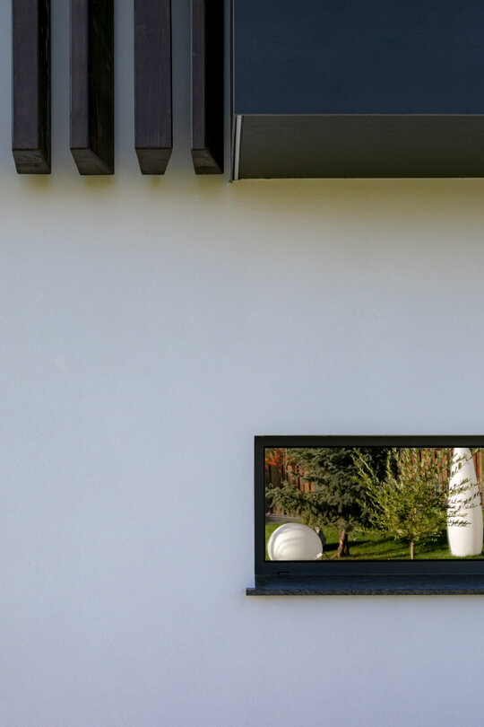variabilă. Zonele pilelor opace ale gardului, îmbrăcate complet în ceramica gri antracit mat, creează ecrane pe care se profilează