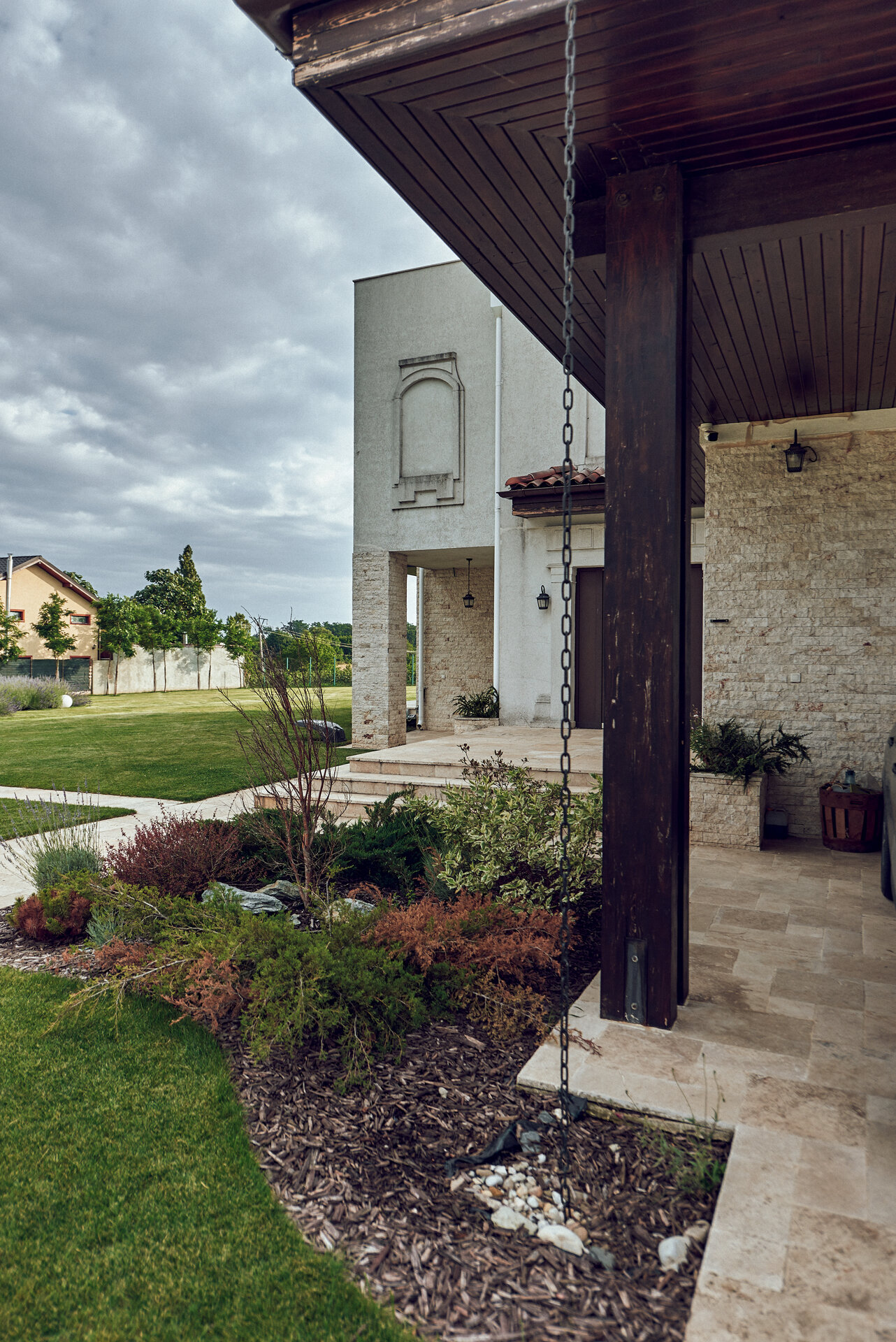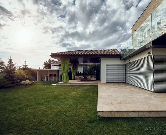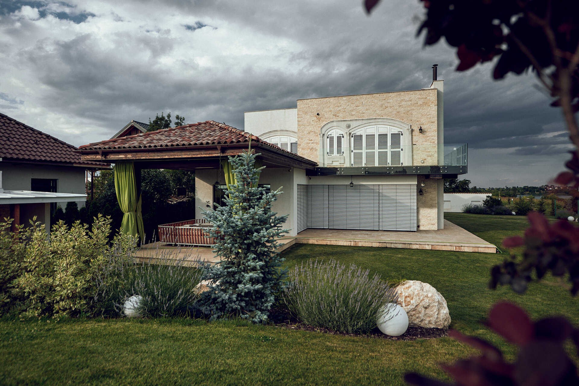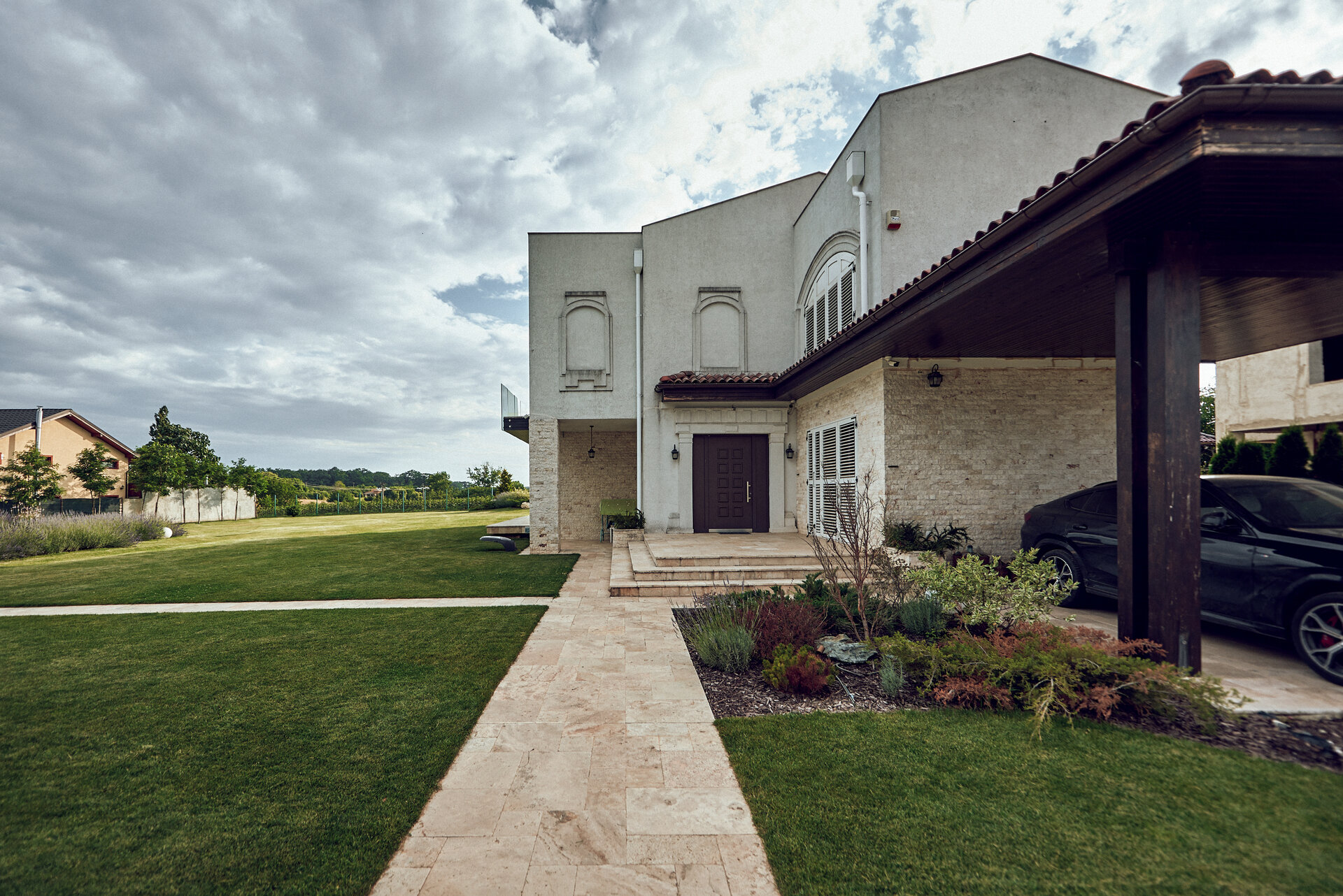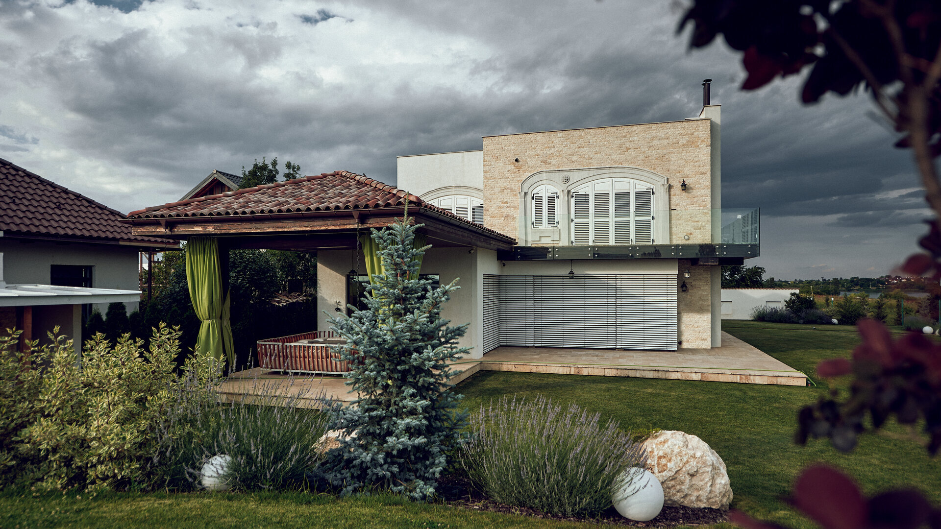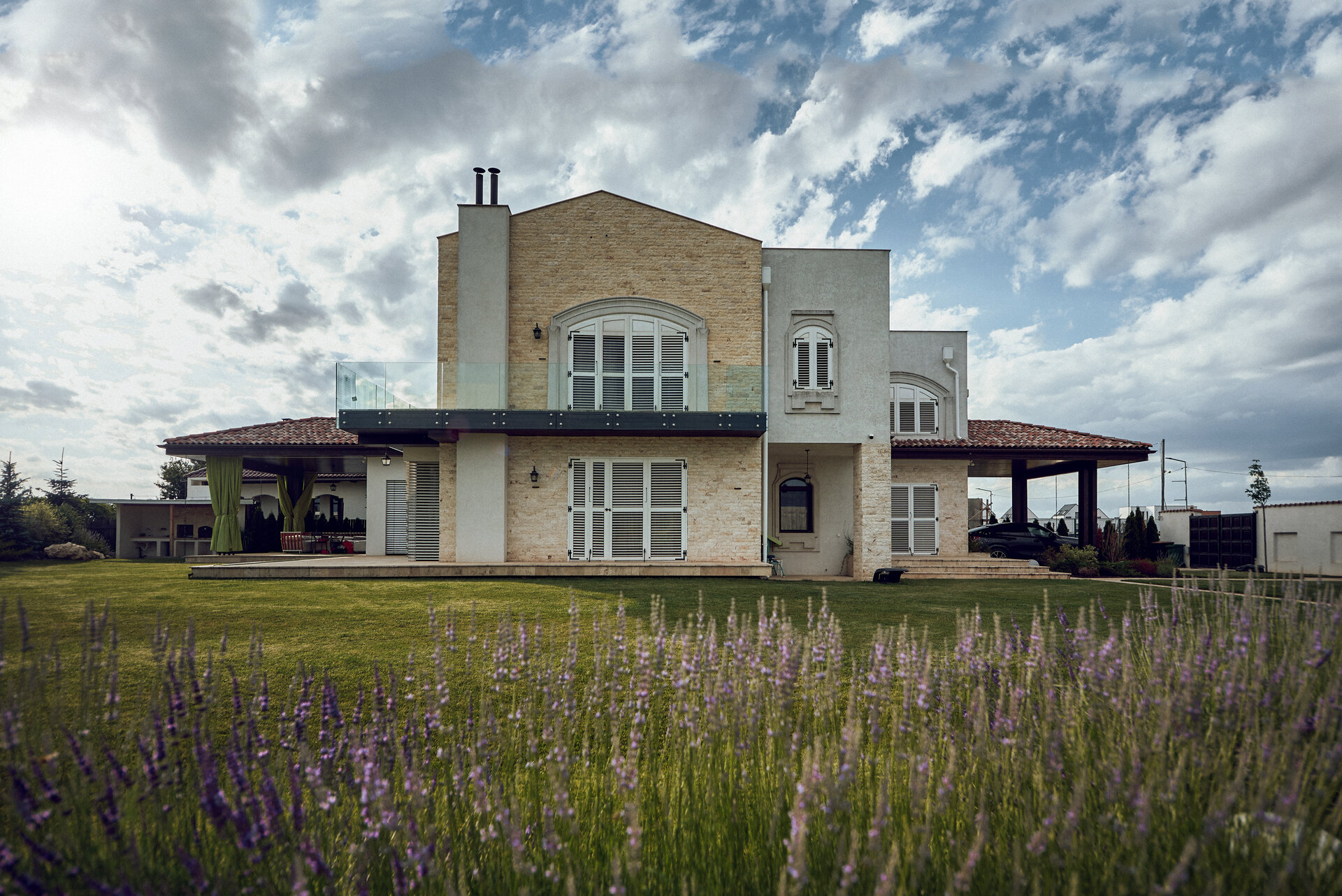 Grădina extinsă a Casei Mediteraneene devine un adevărat sanctuar al frumuseții naturale., iar lavanda parfumată pătrunde aerul cu aroma sa calmantă.