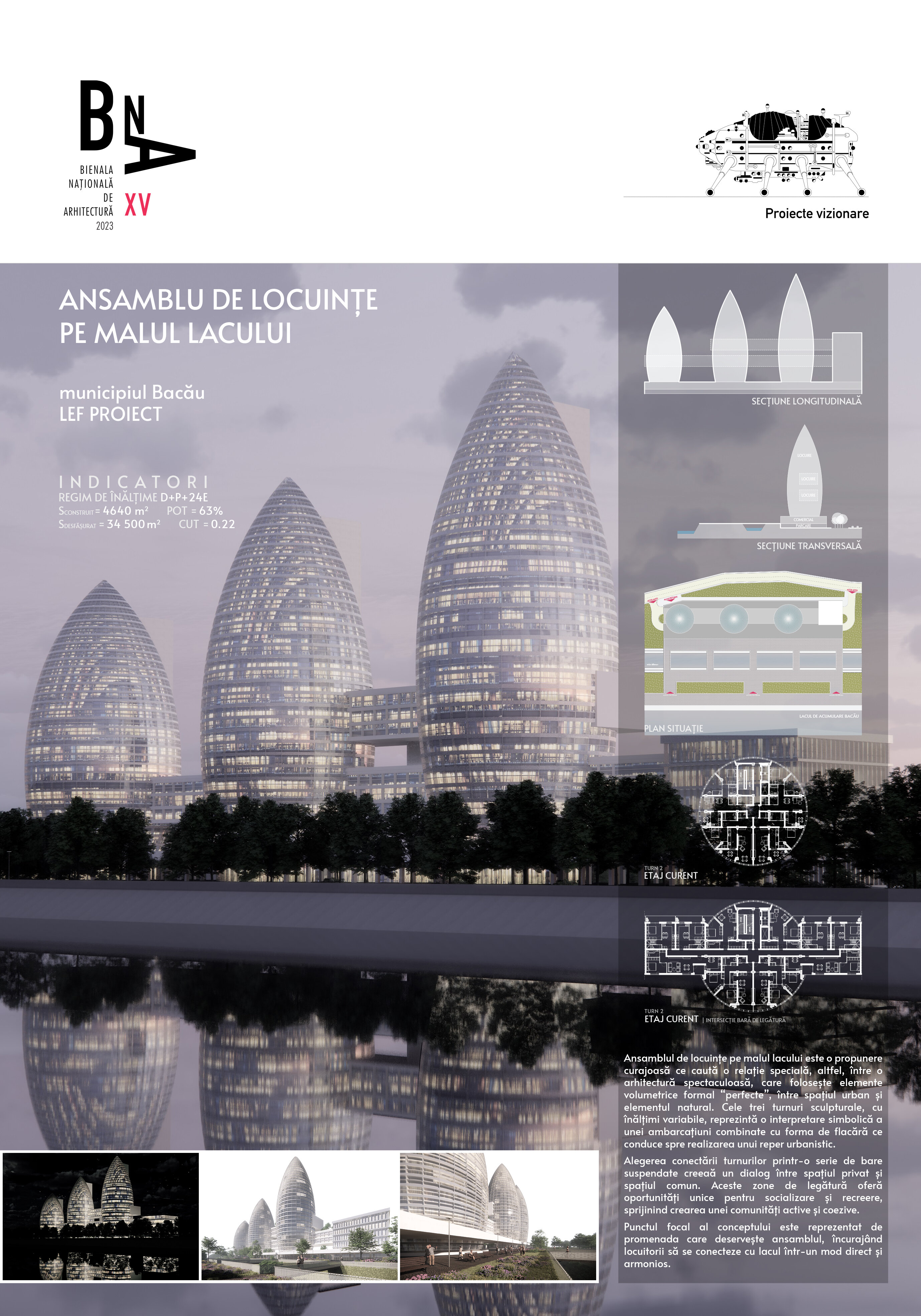 Ansamblul de locuințe pe malul lacului este o propunere curajoasă ce cauta o relatie speciala, altfel, intre o arhitectura spectaculoasa, care foloseste elemente volumetrice formal ”perfecte”, între spațiul