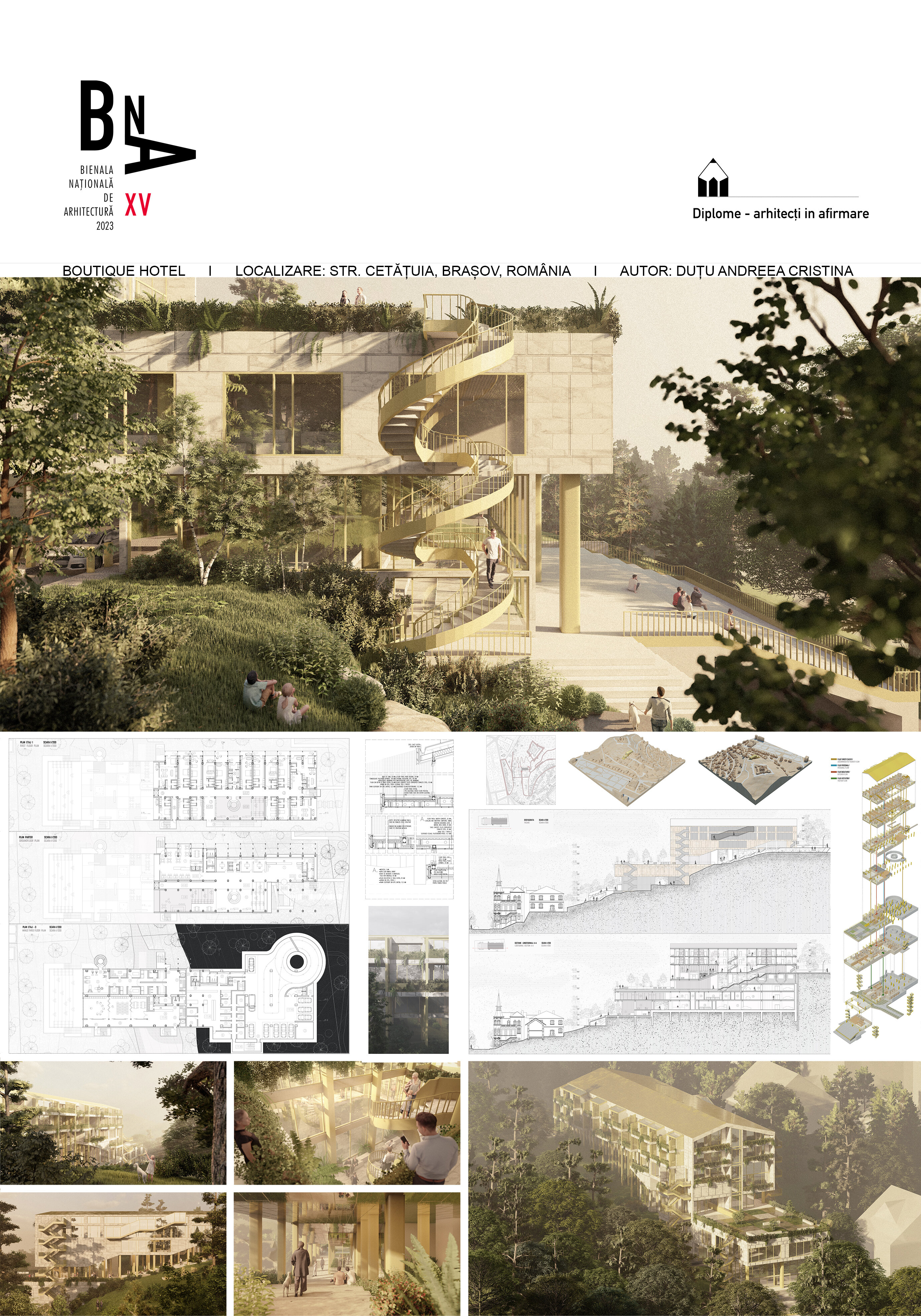 Silueta terenului în pantă și amplasamentul în inima unui spațiu verde, au dat naștere la multiple decizii volumetrice după care s-a modelat volumul exterior și interior al propunerii arhitecturale. Modul de desfășurare a zonificărilor funcționale în trepte a condus la crearea unor înșiruri de legaturi orizontale și verticale între diverse terase amenajate, care devin esențiale în conceptul proiectului prezentat. Inspirația din natură se citește încă de la prima imagine a volumului, până la scheletul de susținere a acestuia. Sistemul structural a luat naștere prin metamorfozarea și stilizarea elementului central al pădurii – trunchiul copacului.