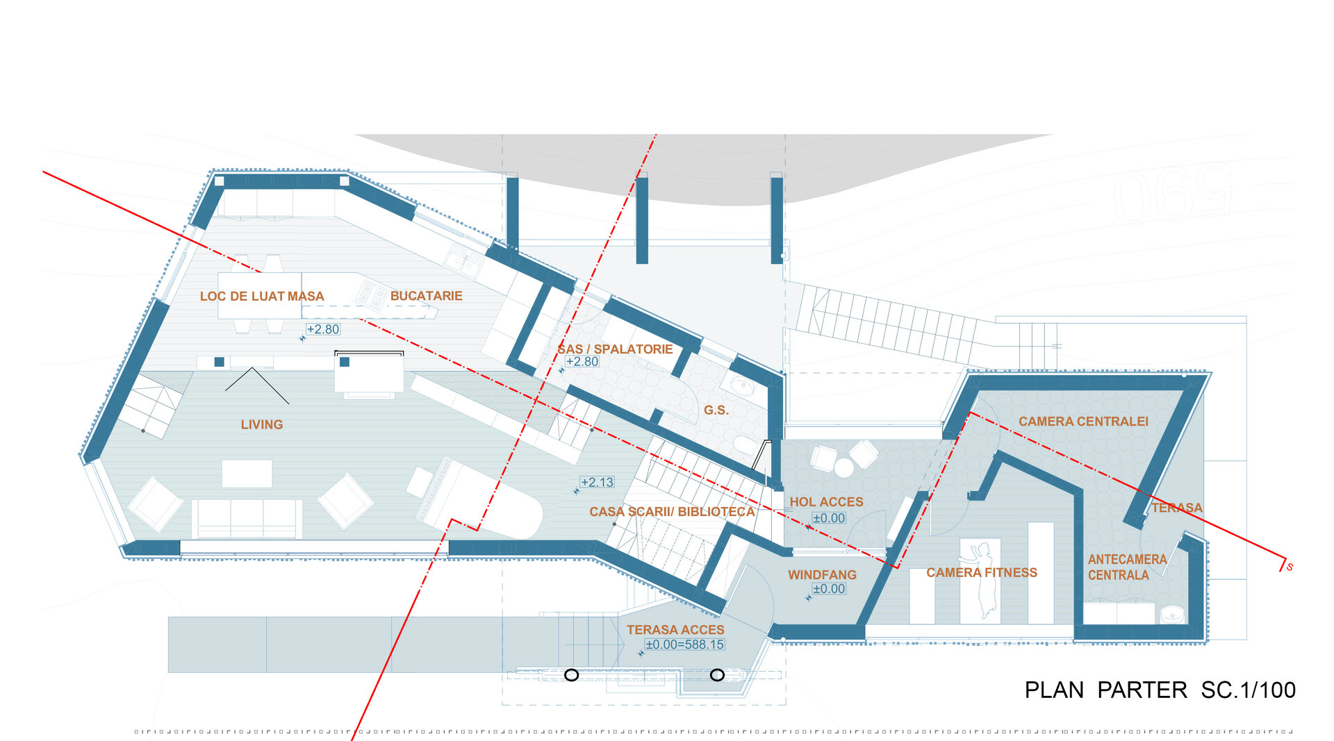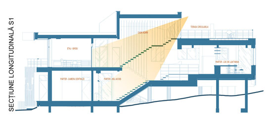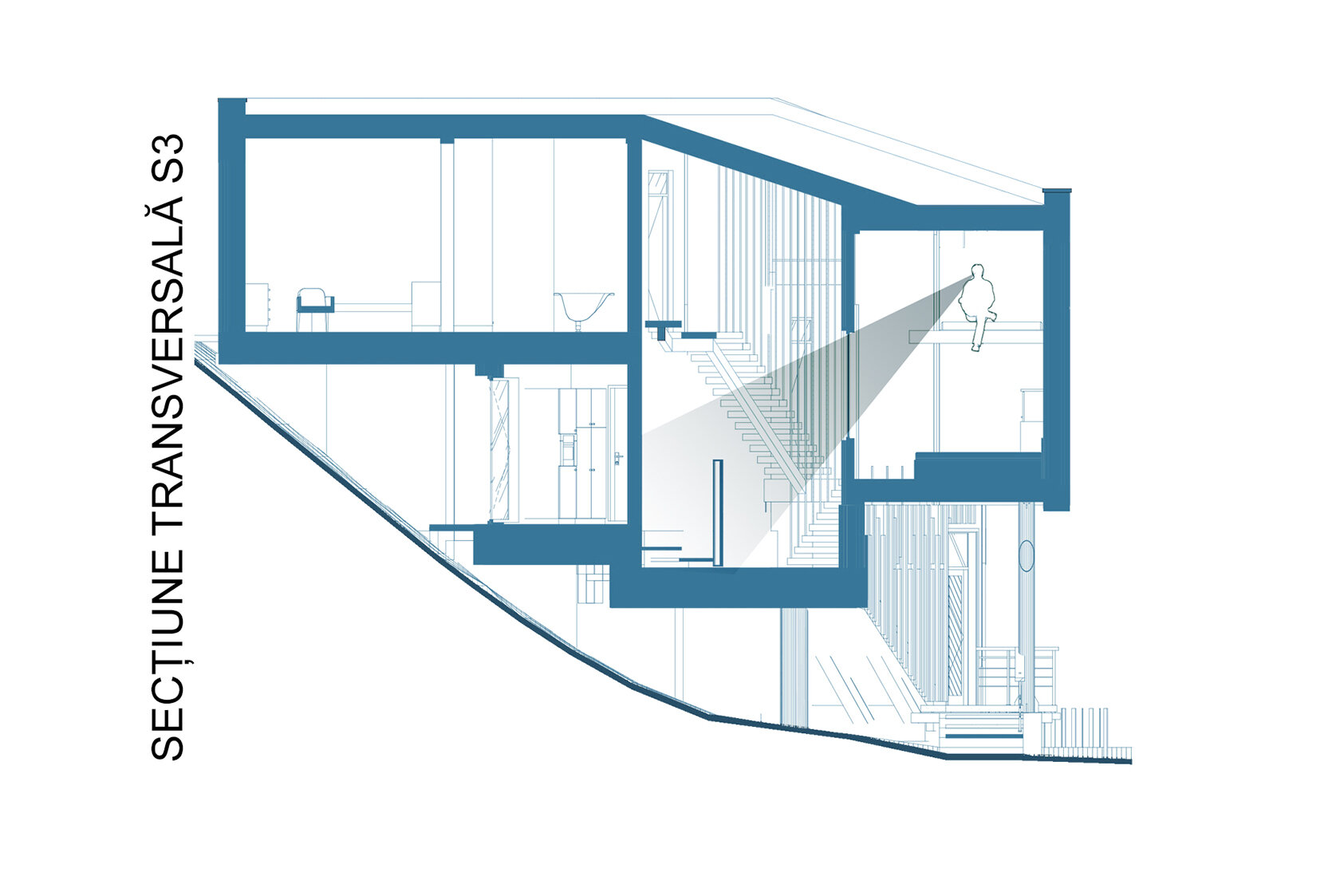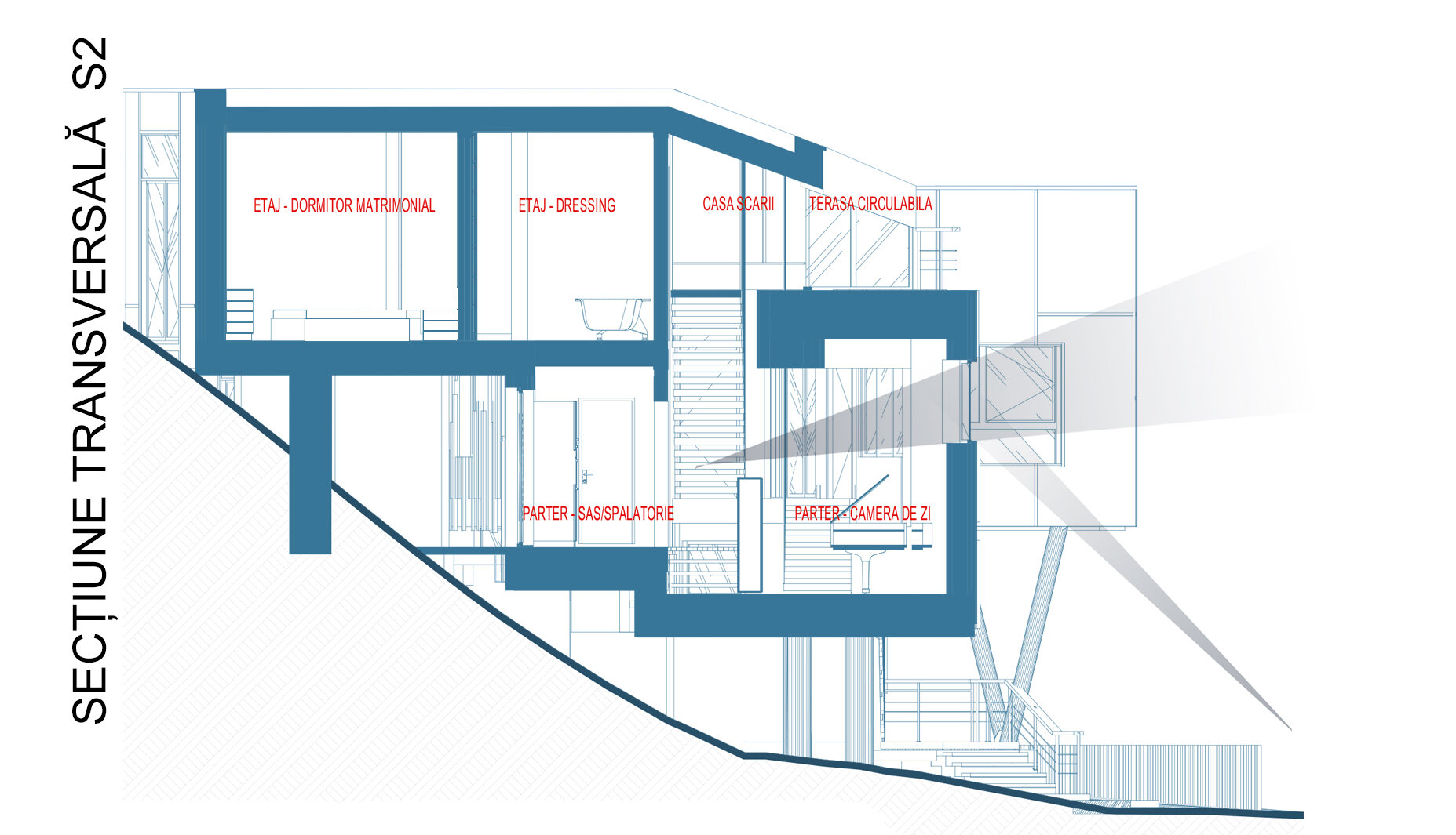 Terenul cu pantă abruptă a provocat limitarea procesului proiectării la o amprentă orizontală dezvoltată în lungul drumului peste care s-au așezat în stivă pe siminiveluri funcțiunile reședinței într-un parcurs funcțional firesc dinspre zona recepției - intrării, spre zonele de zi, apoi prin atrium spre camera de oaspeți și biroul către spațiul cel mai de sus - dormitorul cu terasa. Așadar secvențialitatea spațiilor se desfășoară atât pe orizontală dar și cu precădere pe verticală într-un parcurs mereu în urcare, oferindu-i-se celui care parcuge spațiul surpriza de a pleca de la cota terenului urmând ca după multe trepte urcate să ajungă din nou la cota terenului (vezi dormitorul), îmbinând mereu interiorul cu exteriorul. Zona atriumului deschis (cu o înălțime generoasă) găzduind casa scării, unifică și conecteză în același timp spațiile casei, având o calitate ludică prin jocul luminii datorate vitrajului către terasa de la cota superioară. Acest vitraj are rolul de a trimite lumină în inima casei în cel mai adânc punct al său - intrarea. De asemenea se identifică un alt element important în zona de zi - prezența șemineului - element central în jurul căruia gravitează totul - o amintire a vetrei casei tradiționale. Spațiile de la cotele superioare ale casei au fost astfel gândite încât să ofere o senzație cât mai privată - spații interioare: un dormitor cu baie proprie și dressing care se deschid către versant, precum și spații exterioare: o terasă amplă cu jacuzzi așezată peste zona de zi.