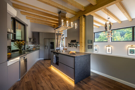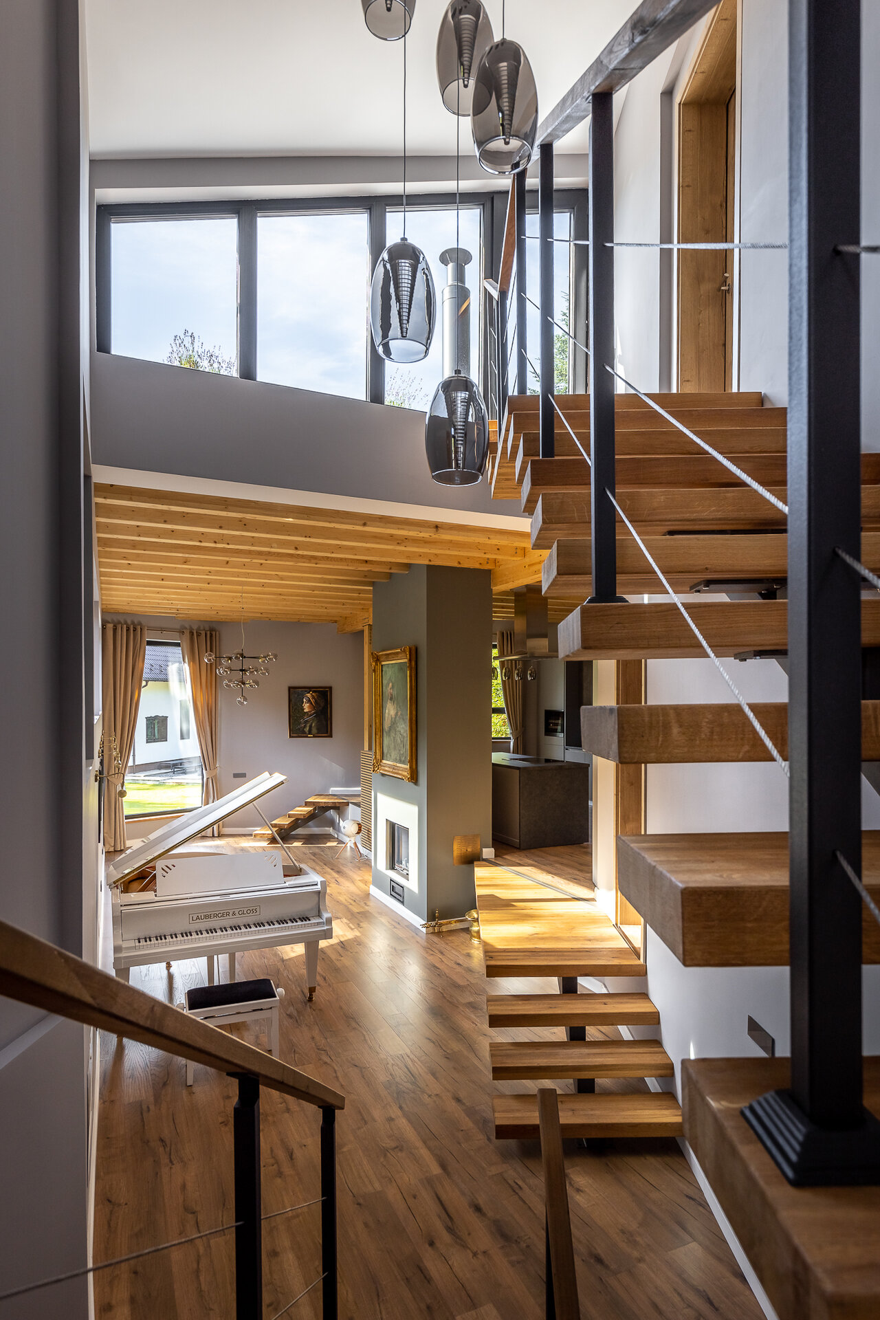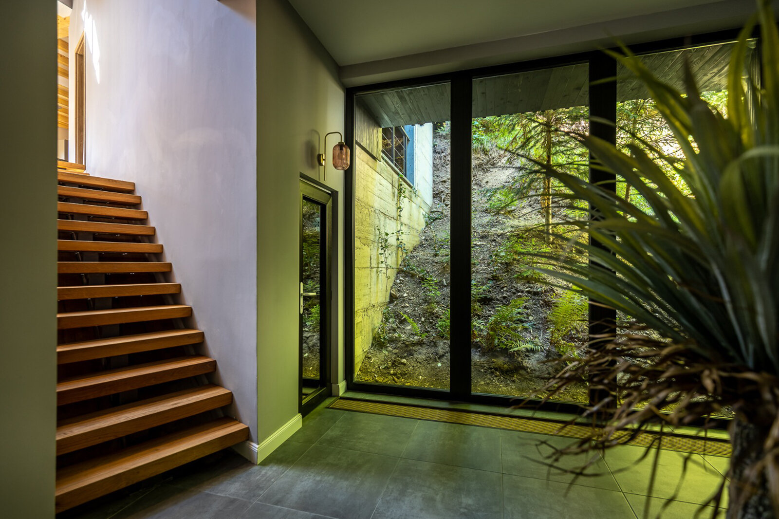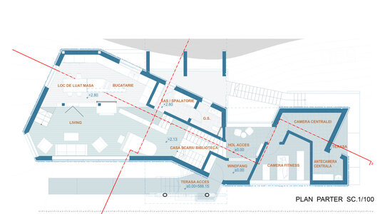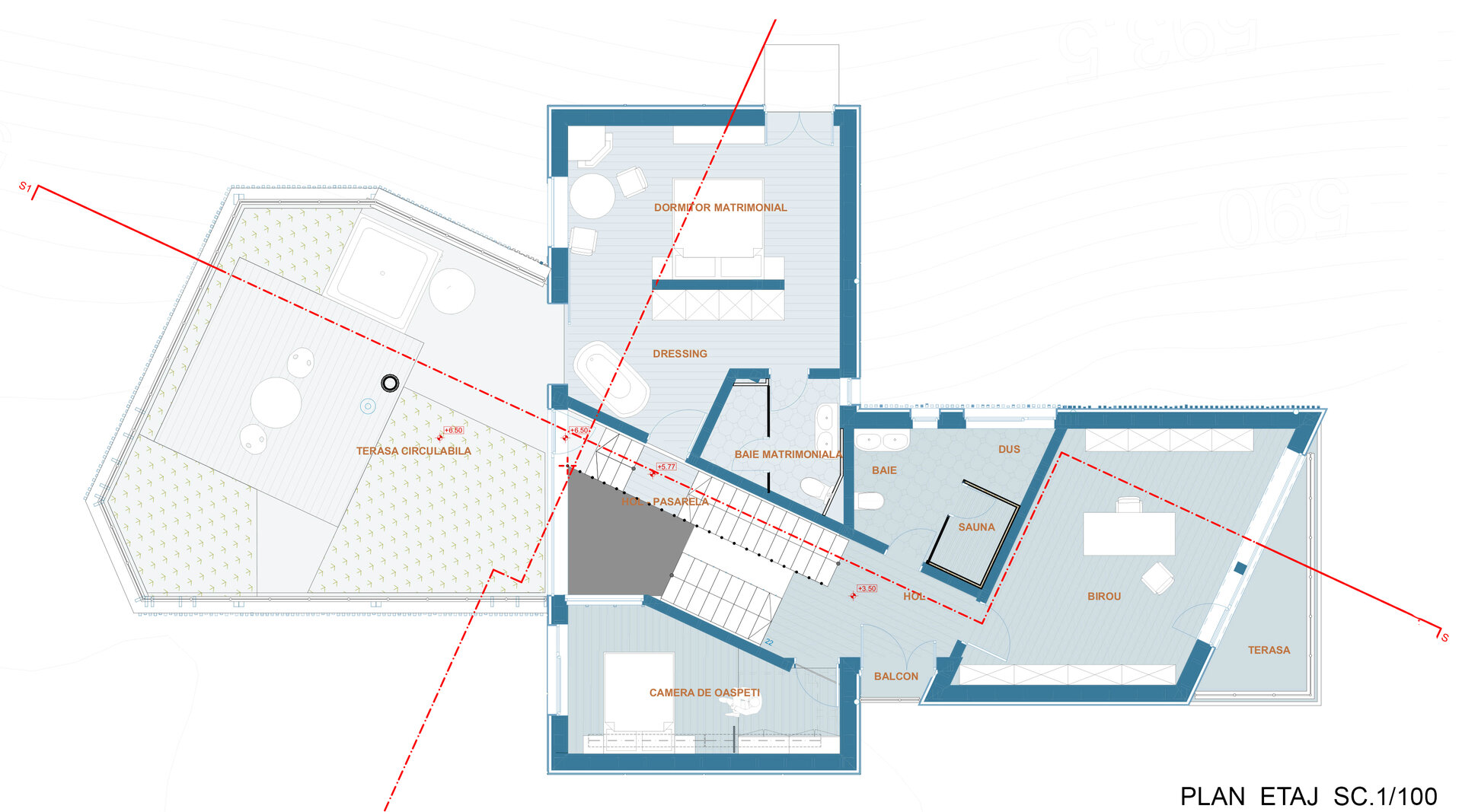 Terenul cu pantă abruptă a provocat limitarea procesului proiectării la o amprentă orizontală dezvoltată în lungul drumului peste care s-au așezat în stivă pe siminiveluri funcțiunile reședinței într-un parcurs funcțional firesc dinspre zona recepției - intrării, spre zonele de zi, apoi prin atrium spre camera de oaspeți și biroul către spațiul cel mai de sus - dormitorul cu terasa. Așadar secvențialitatea spațiilor se desfășoară atât pe orizontală dar și cu precădere pe verticală într-un parcurs mereu în urcare, oferindu-i-se celui care parcuge spațiul surpriza de a pleca de la cota terenului urmând ca după multe trepte urcate să ajungă din nou la cota terenului (vezi dormitorul), îmbinând mereu interiorul cu exteriorul. Zona atriumului deschis (cu o înălțime generoasă) găzduind casa scării, unifică și conecteză în același timp spațiile casei, având o calitate ludică prin jocul luminii datorate vitrajului către terasa de la cota superioară. Acest vitraj are rolul de a trimite lumină în inima casei în cel mai adânc punct al său - intrarea. De asemenea se identifică un alt element important în zona de zi - prezența șemineului - element central în jurul căruia gravitează totul - o amintire a vetrei casei tradiționale. Spațiile de la cotele superioare ale casei au fost astfel gândite încât să ofere o senzație cât mai privată - spații interioare: un dormitor cu baie proprie și dressing care se deschid către versant, precum și spații exterioare: o terasă amplă cu jacuzzi așezată peste zona de zi.
