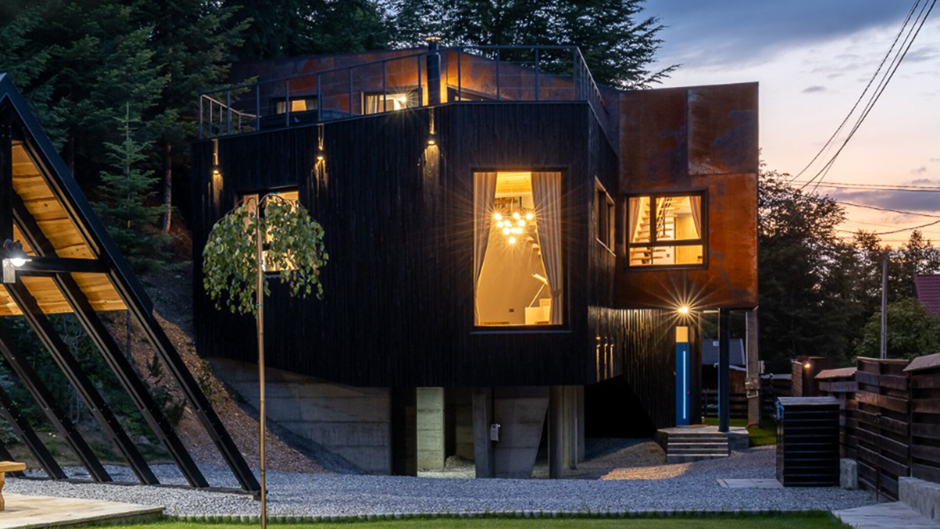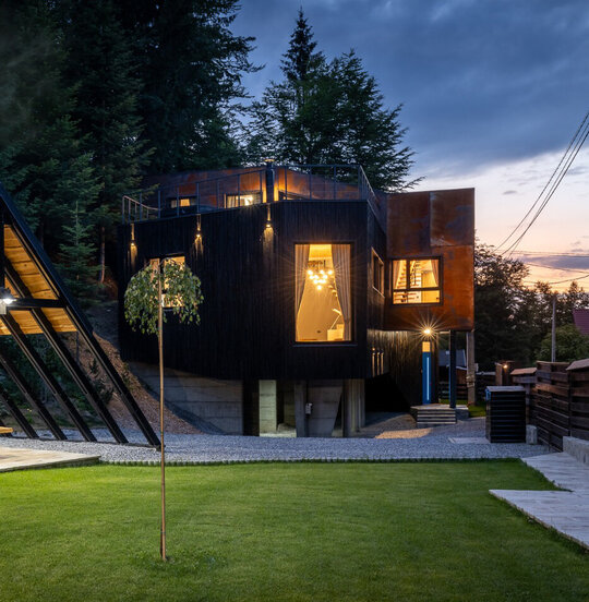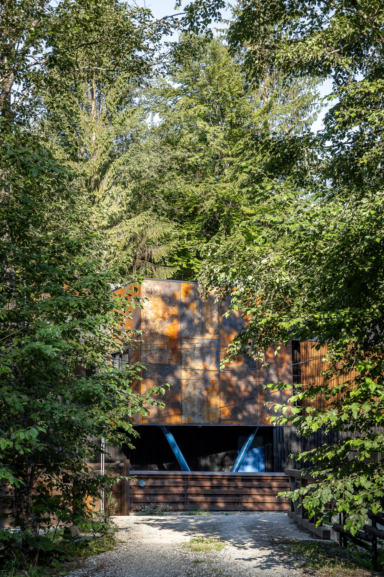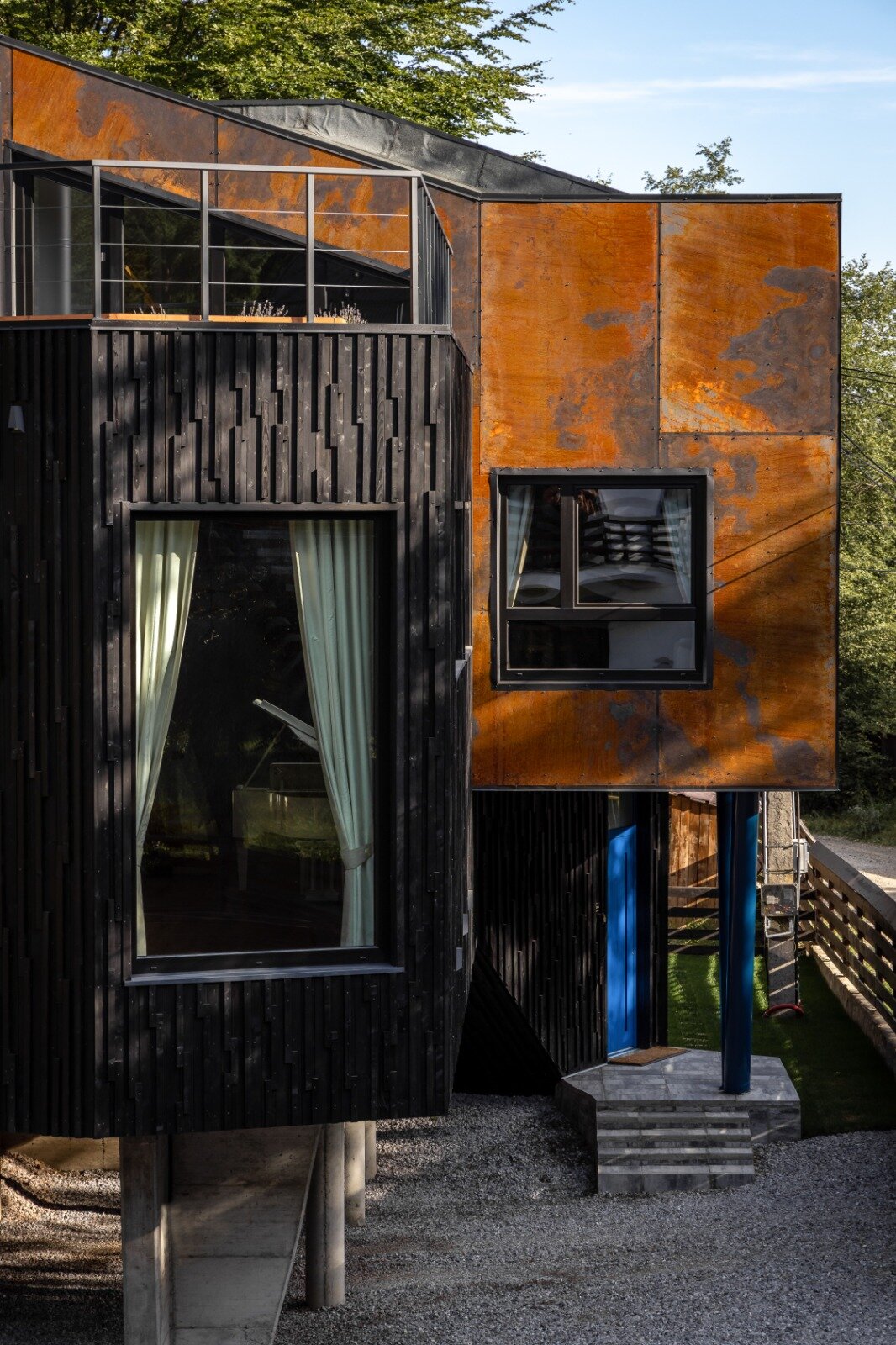 Utilizând numai oțel și lemn, în contrast cu construcțiile tipice locale turistice rezidențiale din cărămidă, am ales să lăsăm la vedete expusă infrastructura din beton. Elementele structurale brute au fost compensate de materialitatea pereților exteriori atât prin calitatea lor organică, texturată (scoarță de copac), cât și prin căldura cromatică a cortenului (cu scopul de a minimiza impactul vizual asupra peisajului). De asemenea abordarea omogenă a volumelor prin utilizarea lemnului tratat negru întunecat, asemenea unei scoarțe de copac pentru pereții exteriori, are rolul de a completa aspectul volumului de cutie misterioasă („mystery box”) din exterior în contrast cu căldura și abundența luminii de la interior.