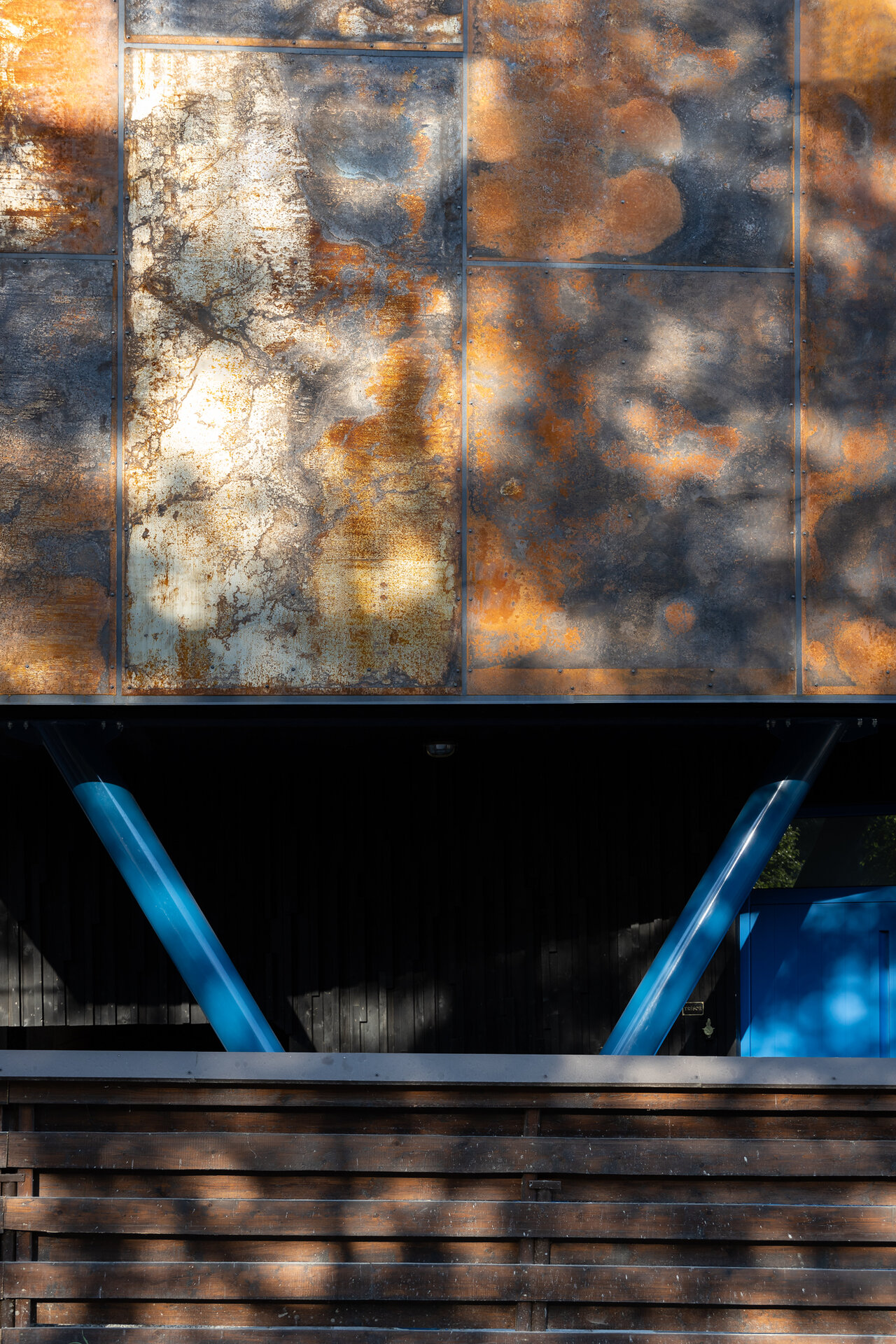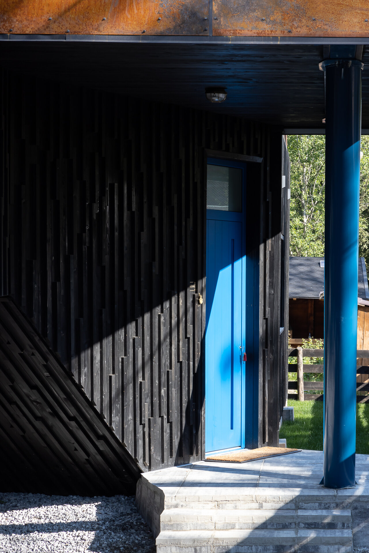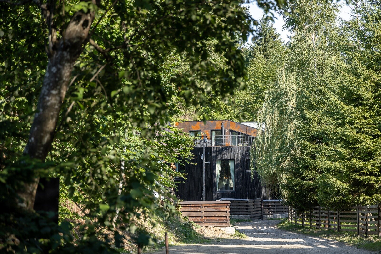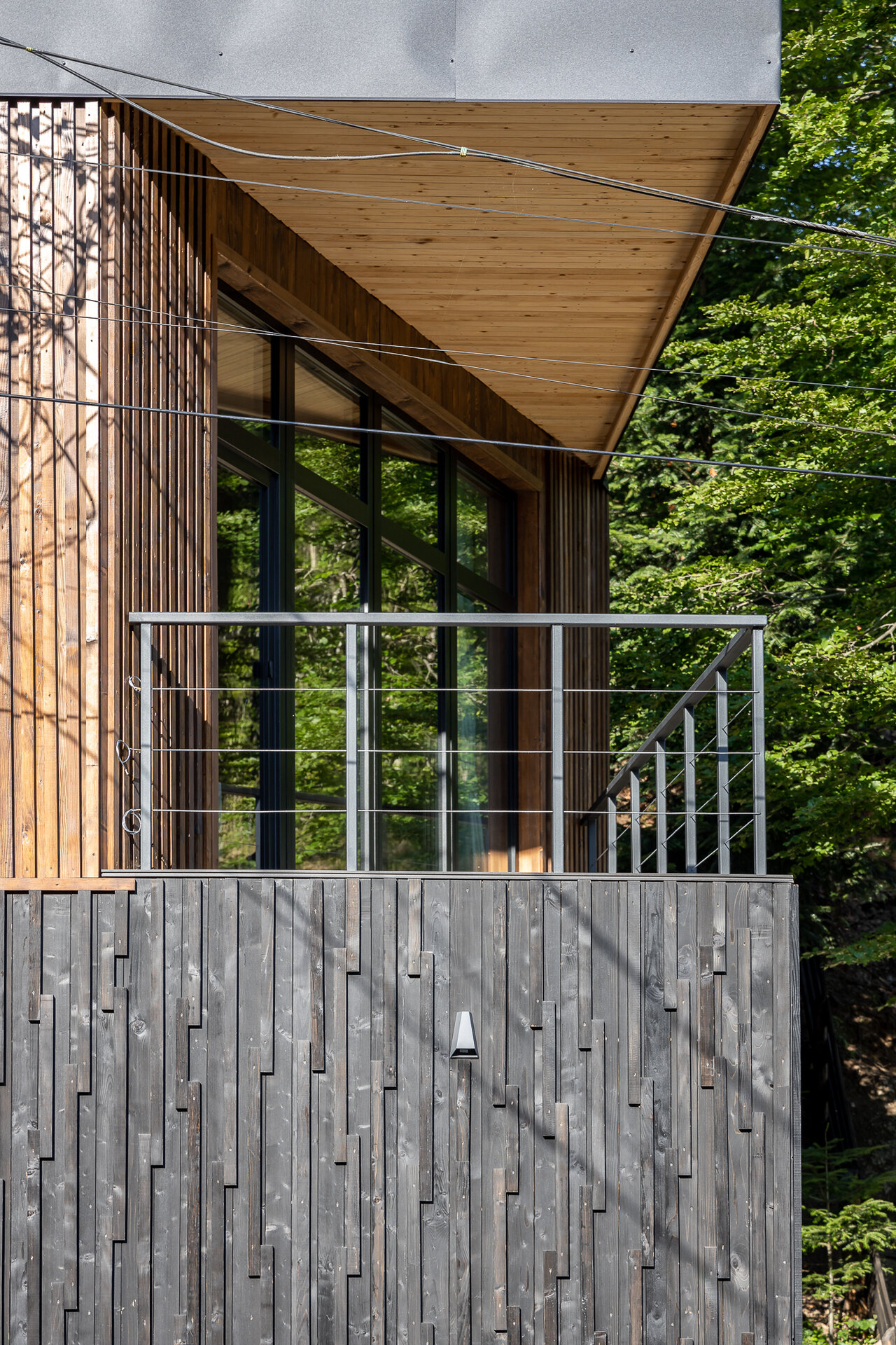 Utilizând numai oțel și lemn, în contrast cu construcțiile tipice locale turistice rezidențiale din cărămidă, am ales să lăsăm la vedete expusă infrastructura din beton. Elementele structurale brute au fost compensate de materialitatea pereților exteriori atât prin calitatea lor organică, texturată (scoarță de copac), cât și prin căldura cromatică a cortenului (cu scopul de a minimiza impactul vizual asupra peisajului). De asemenea abordarea omogenă a volumelor prin utilizarea lemnului tratat negru întunecat, asemenea unei scoarțe de copac pentru pereții exteriori, are rolul de a completa aspectul volumului de cutie misterioasă („mystery box”) din exterior în contrast cu căldura și abundența luminii de la interior.