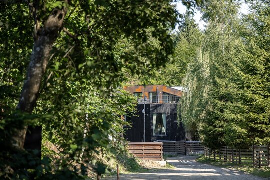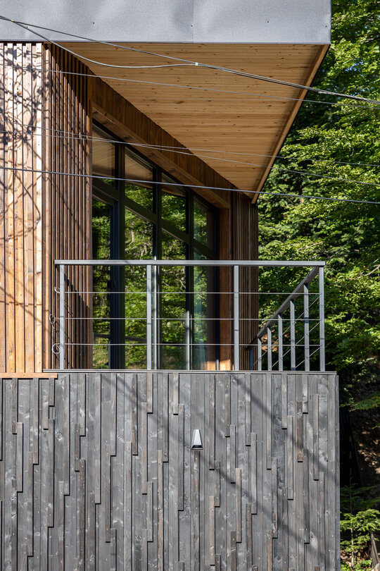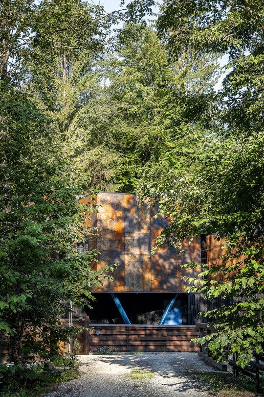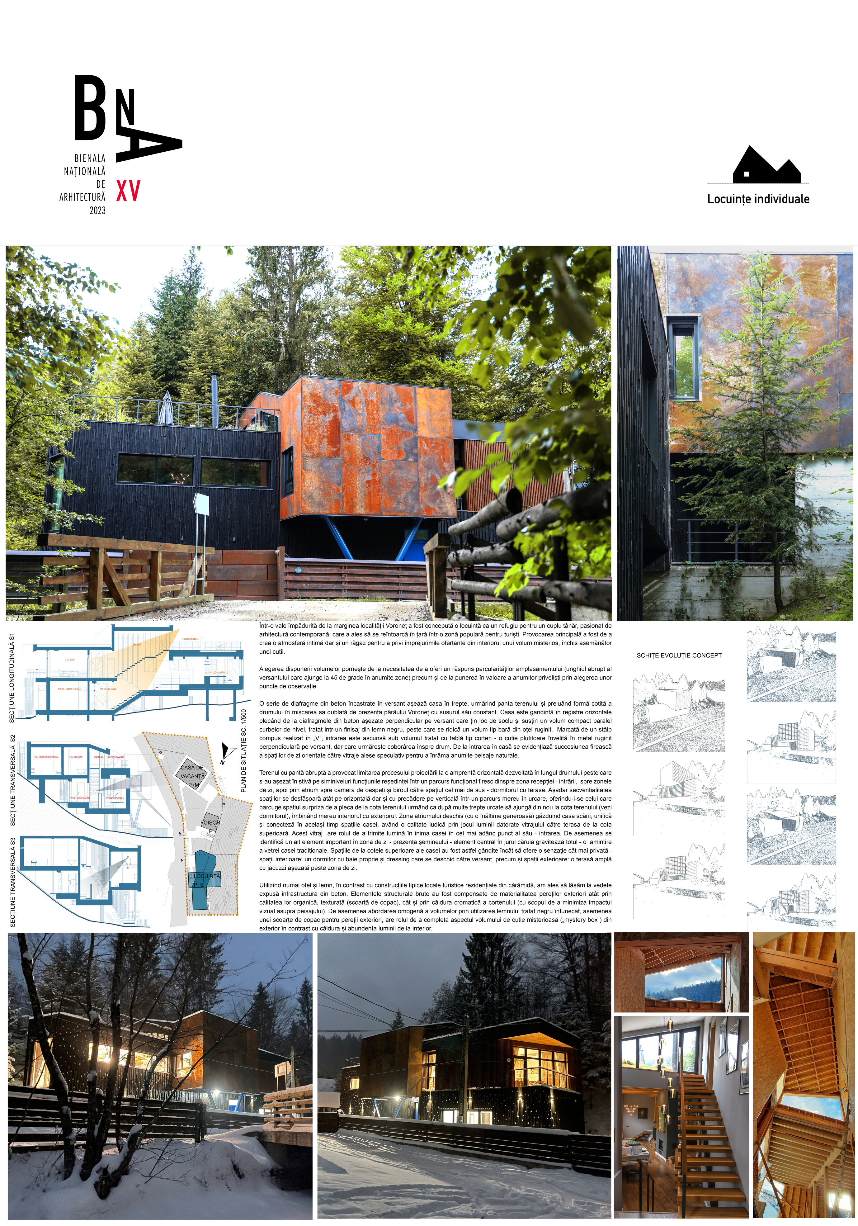 O serie de diafragme din beton încastrate în versant așează casa în trepte, urmărind panta terenului și preluând formă cotită a drumului în mișcarea sa dublată de prezența pârâului Voroneț cu susurul său constant. Casa este gandintă în registre orizontale plecând de la diafragmele din beton așezate perpendicular pe versant care țin loc de soclu și susțin un volum compact paralel curbelor de nivel, tratat intr-un finisaj din lemn negru, peste care se ridică un volum tip bară din oțel ruginit. Marcată de un stâlp compus realizat în „V”, intrarea este ascunsă sub volumul tratat cu tablă tip corten - o cutie plutitoare învelită în metal ruginit perpendiculară pe versant, dar care urmărește coborârea înspre drum. De la intrarea în casă se evidențiază succesiunea firească a spațiilor de zi orientate către vitraje alese speculativ pentru a înrăma anumite peisaje naturale.