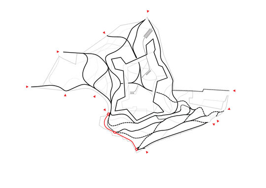 - partea superioară este curățată de excesul de ziduri, pentru a face vizibilă zona stâncoasă; o nouă alee subtilă este realizată din beton cu agregate expuse;
