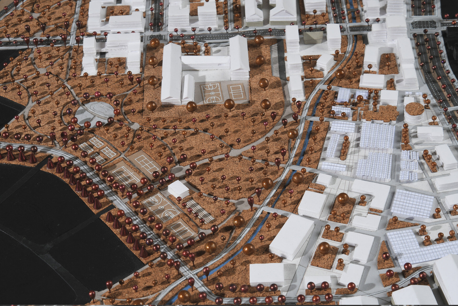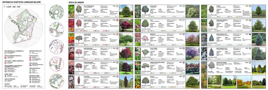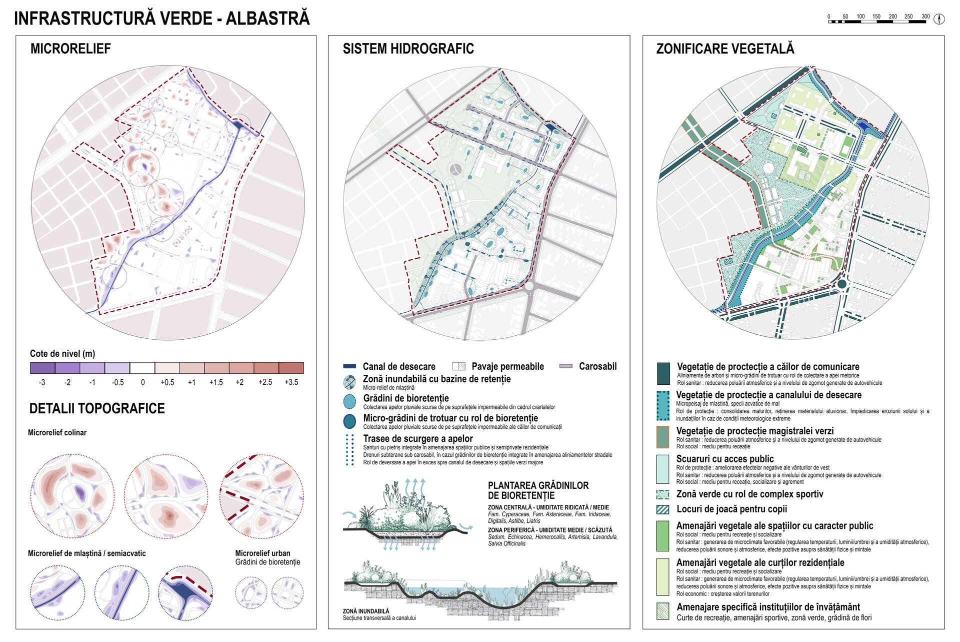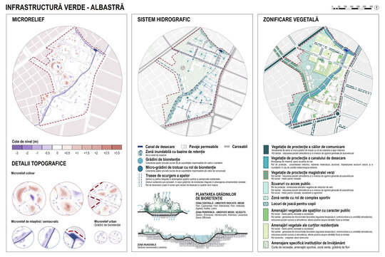 Infrastructura verde-albastră, concepută după principii de planificare biofilă, este alcătuită din elemente acvatice (canalul de desecare cu zonă inundabilă și grădini de bioretenție) și zone vegetale variate ca dimensiuni și mod de amenajare. Majoritatea speciilor lemnoase propuse sunt specii locale, selectate după considerente estetice, de mentenanță și simbolice, pentru a determina identitatea și caracterul vegetal specific al spațiilor exterioare.