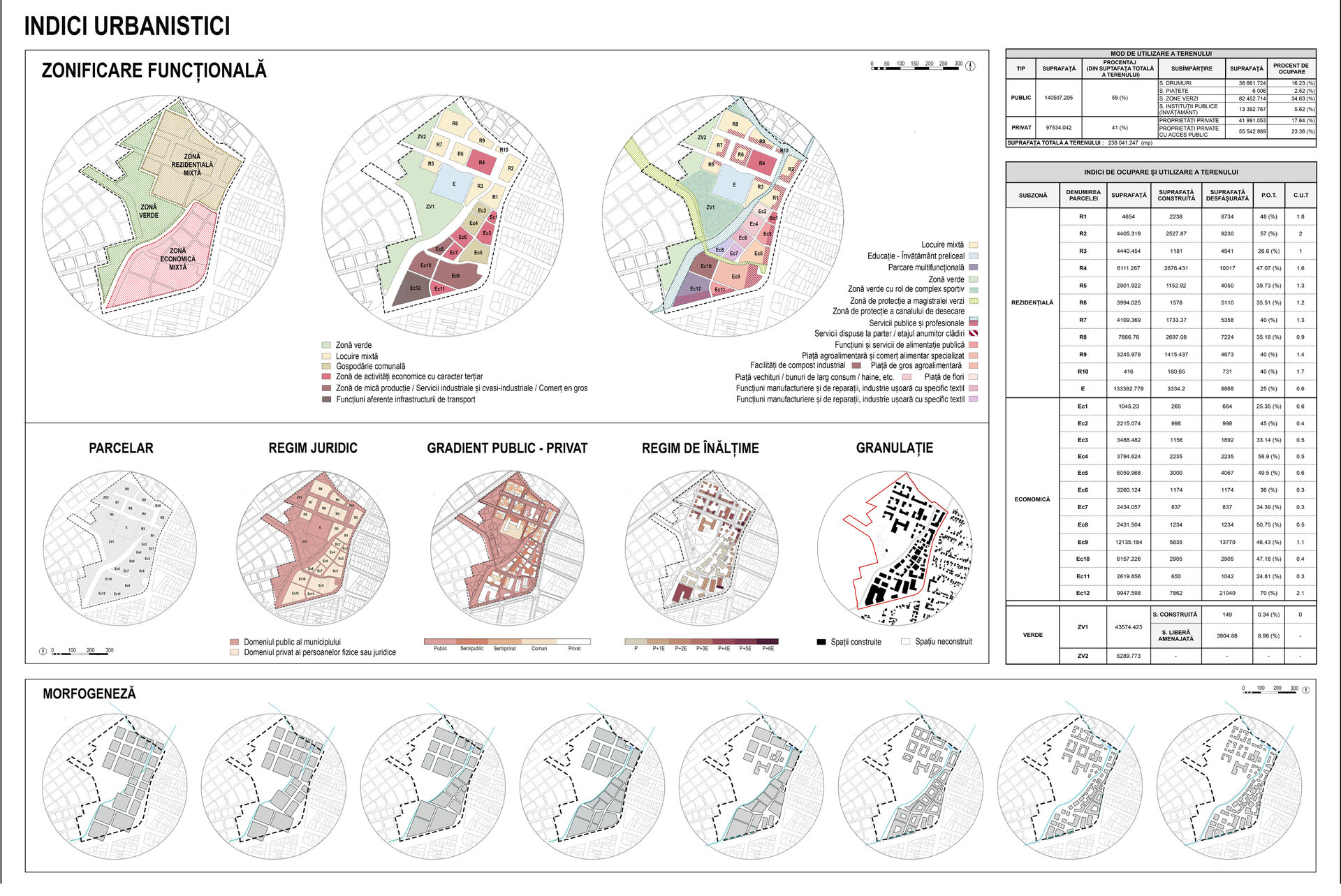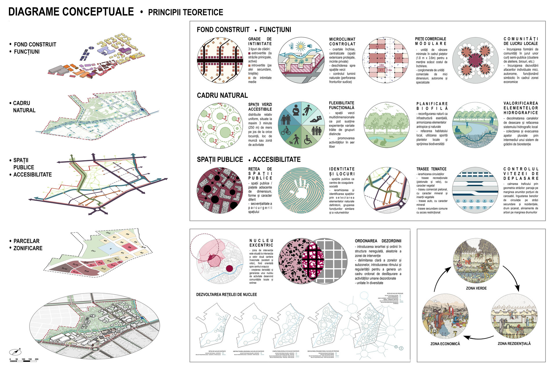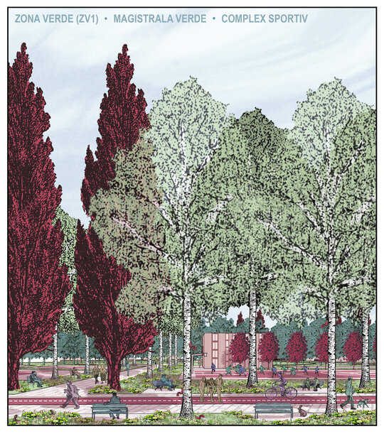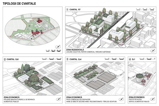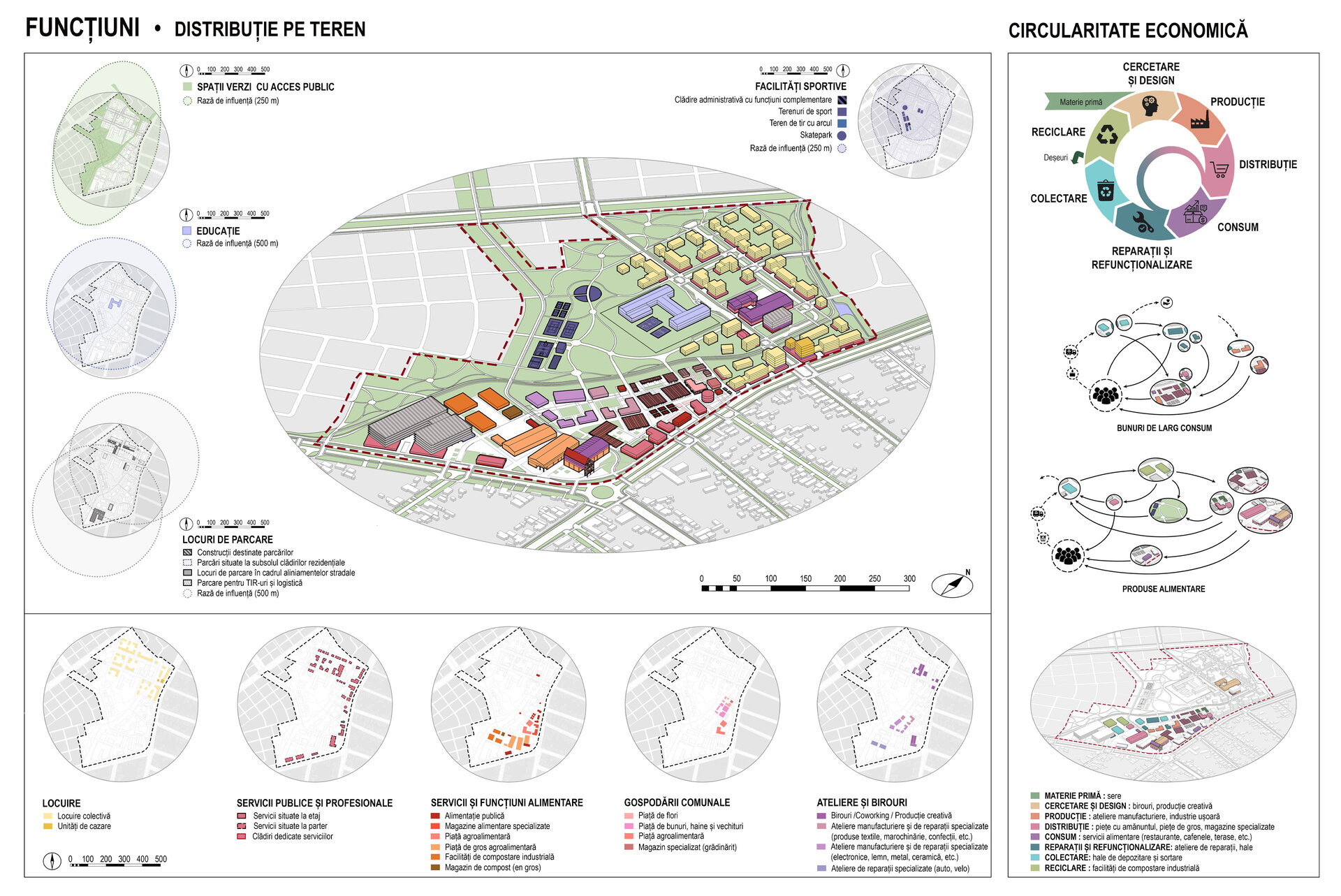 Terenul este sub-împărțit în Zona rezidențială mixtă, Zona economică mixtă și Zona verde, planificarea funcțională fiind realizată în două etape: Zonificarea funcțională generală de tip PUG, după care s-au stabilit indicii urbanistici ai parcelelor, și Zonificarea funcțională detaliată, ce stabilește distribuția serviciilor publice și profesionale, gradientul economic de-a lungul aleii comerciale centrale și delimitarea zonei verzi cu rol de complex sportiv. Strategia propune un mix de funcțiuni grupate după relații de complementaritate și simbioză, cu diferite raze de influență. Zona economică este concepută după modelul economiei circulare, conținând cicluri interne întregi sau parțiale de circulație a materiei și anumite verigi ce pot funcționa pe plan local.