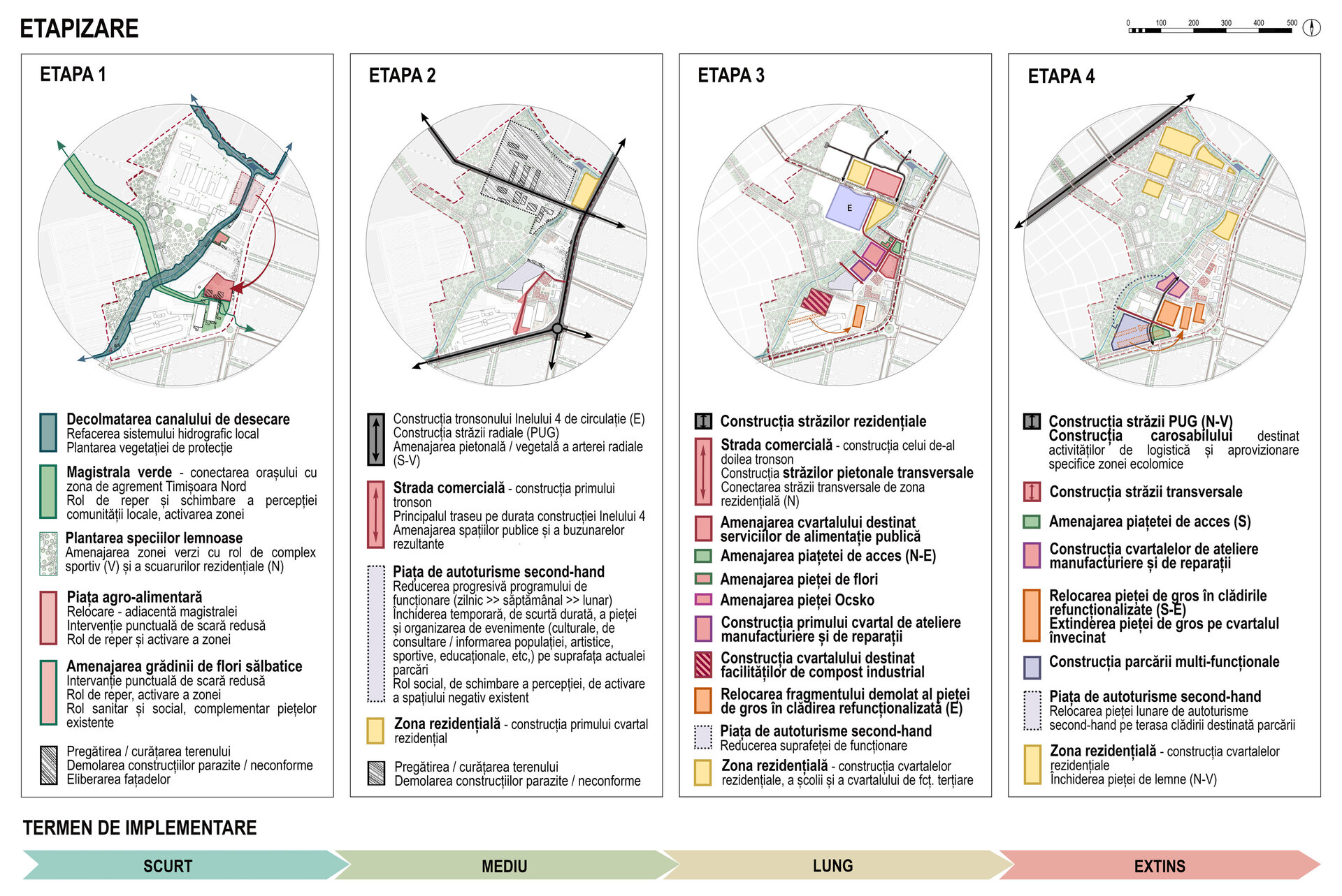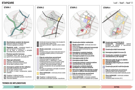 Dezvoltarea este structurată în patru etape cu timpi de implementare diferiți, concepute astfel încât zona de intervenție să fie funcțională în toate stadiile intermediare.
