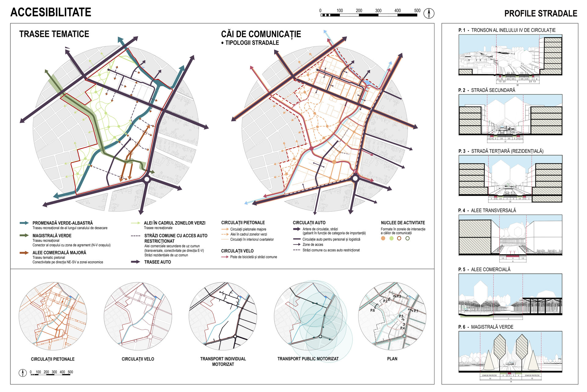 Mobilitatea pe teren este asigurată prin rețeaua de trasee tematice majore (recreaționale, comerciale și auto), dublată de o rețea de trasee secundare transversale. Căile de comunicații urmează forma terenului, fiind ierarhizate și dimensionate după categorii de importanță, fluxuri de activitate și intensitatea traficului. Au fost considerate esențiale valorificarea capătului de perspectivă și introducerea unui reper vertical major în zona de colț.