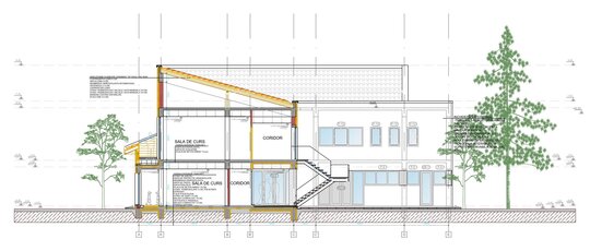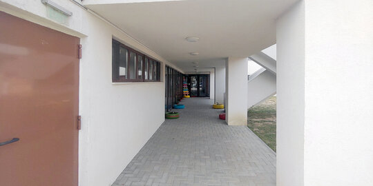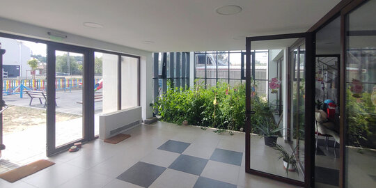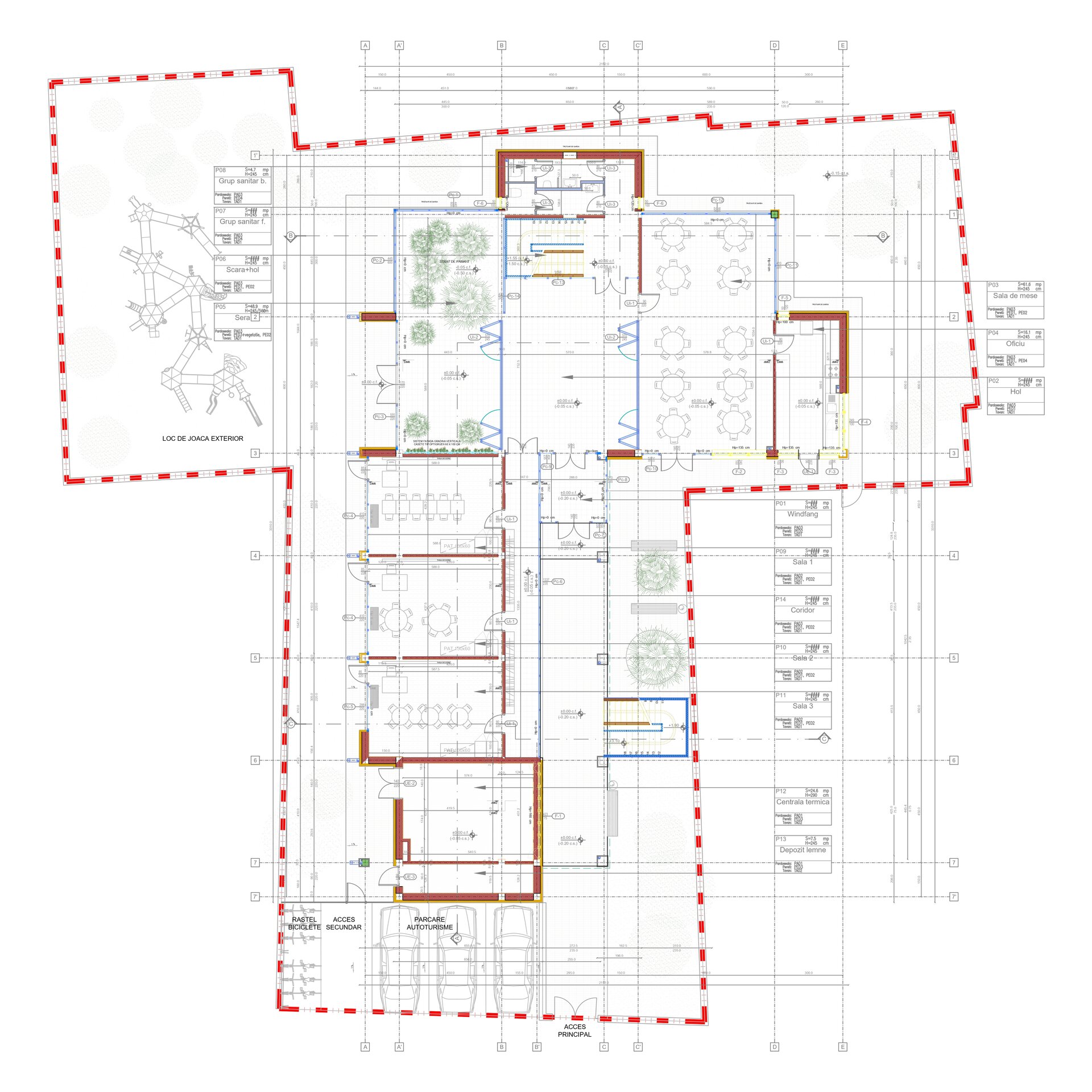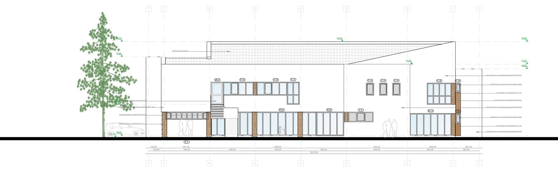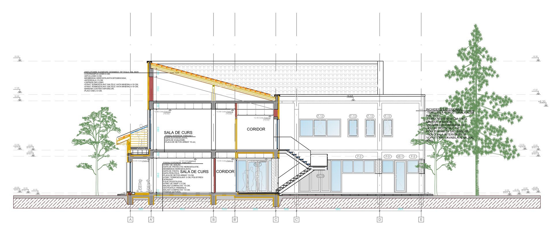Forma în L a clădirii în plan nu doar că permite optimizarea spațiului, dar și facilitează conectarea fluidă între diferite funcțiuni. Accesul de pe laturile sud, est și nord asigură o intrare comodă pentru copii și personal.