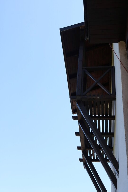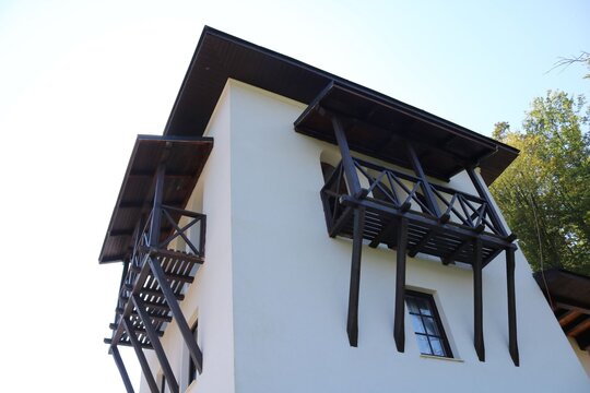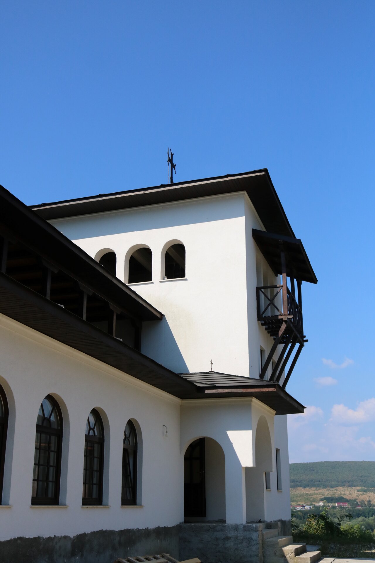 Accesul în corpul de chilii s-a dispus vis-a-vis de intrarea în biserică, de altfel, luând în considerare legătură cu sala de mese, e o dispunere comună, mai ales în mănăstirile din Muntele Athos. Micul pridvor exterior, peste intrarea principală, articulează compozițional volumele clădirii. Turnul înalt, adăpostind stăreția, biblioteca și clopotnița, dă verticală clădirii, dezvoltată, în ansamblu, orizontal.
