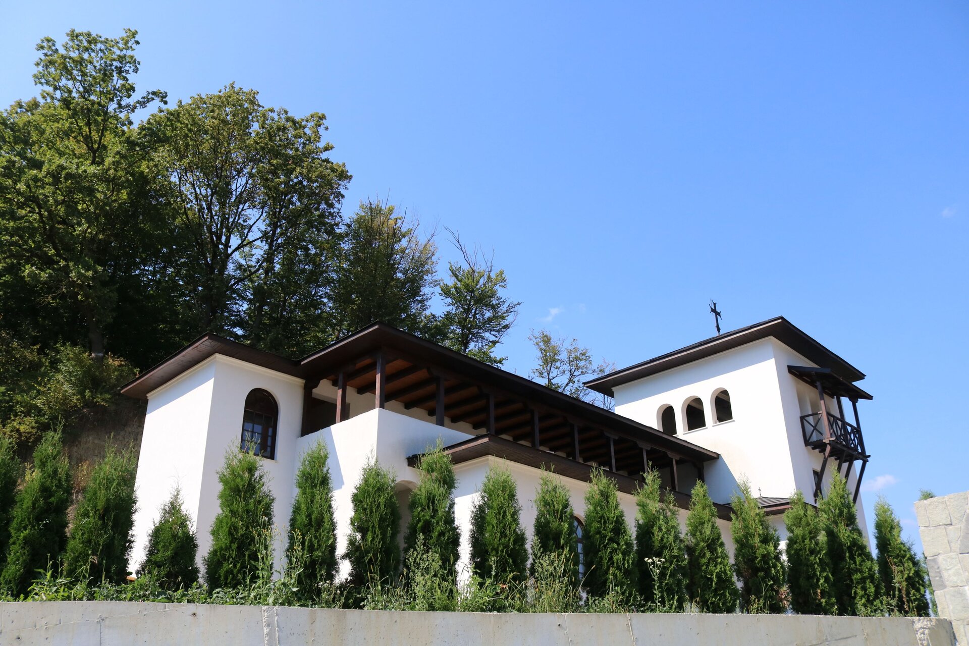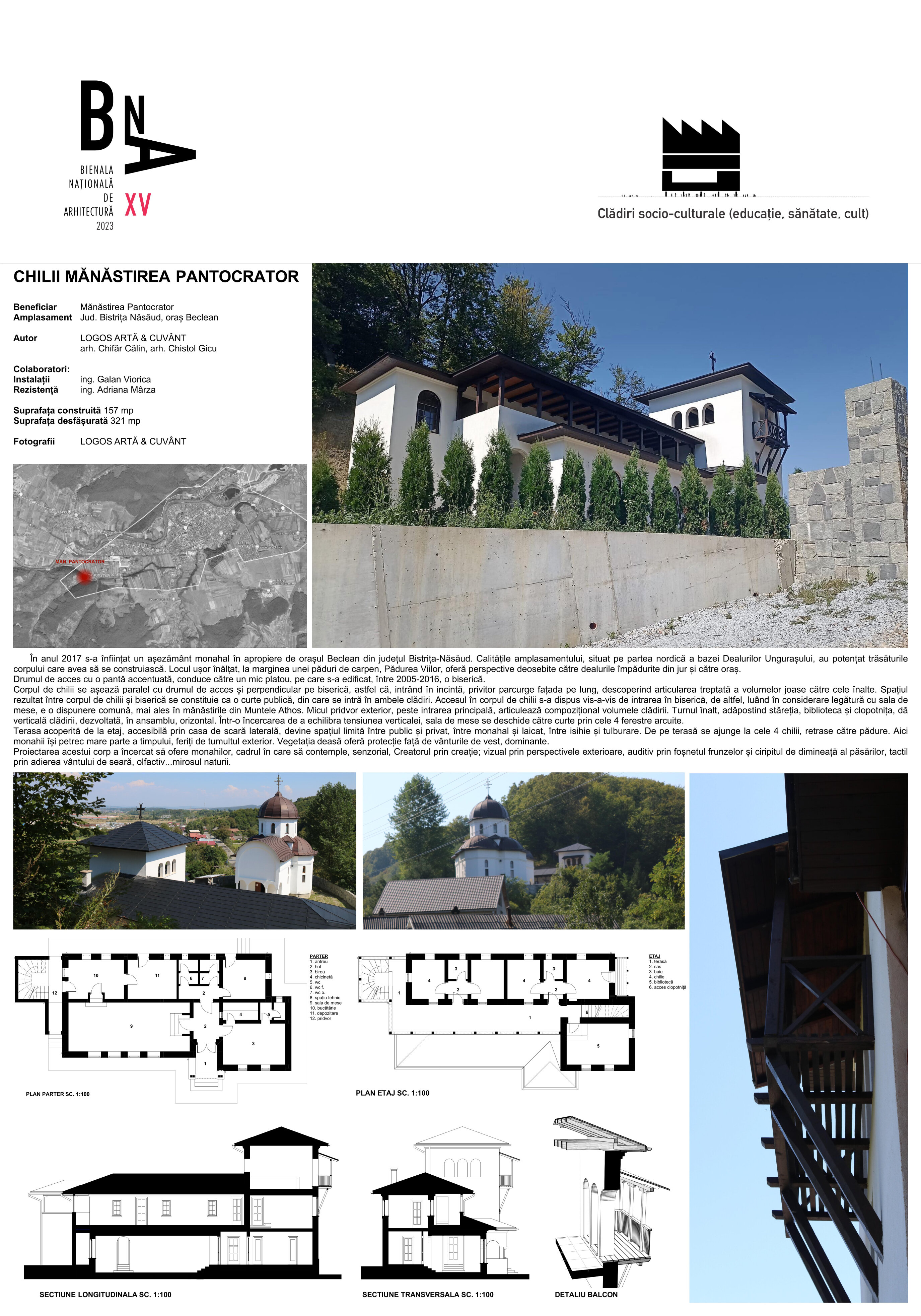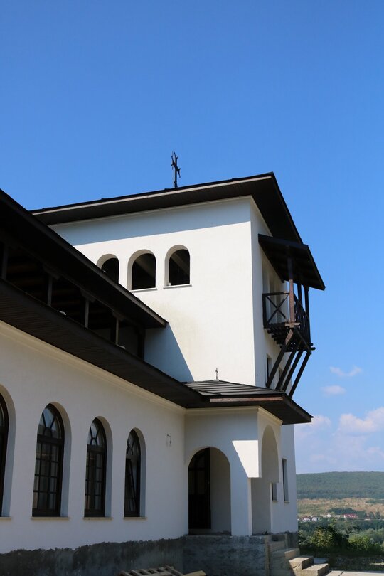 Corpul de chilii se așează paralel cu drumul de acces și perpendicular pe biserică, astfel că, intrând în incinta monahală, privitorul parcurge fațada pe lung, descoperind articularea treptată a volumelor joase către cele înalte. Spațiul rezultat între corpul de chilii și biserică se constituie ca o curte publică, din care se intră în ambele clădiri.