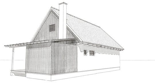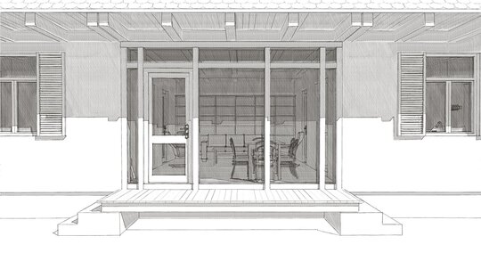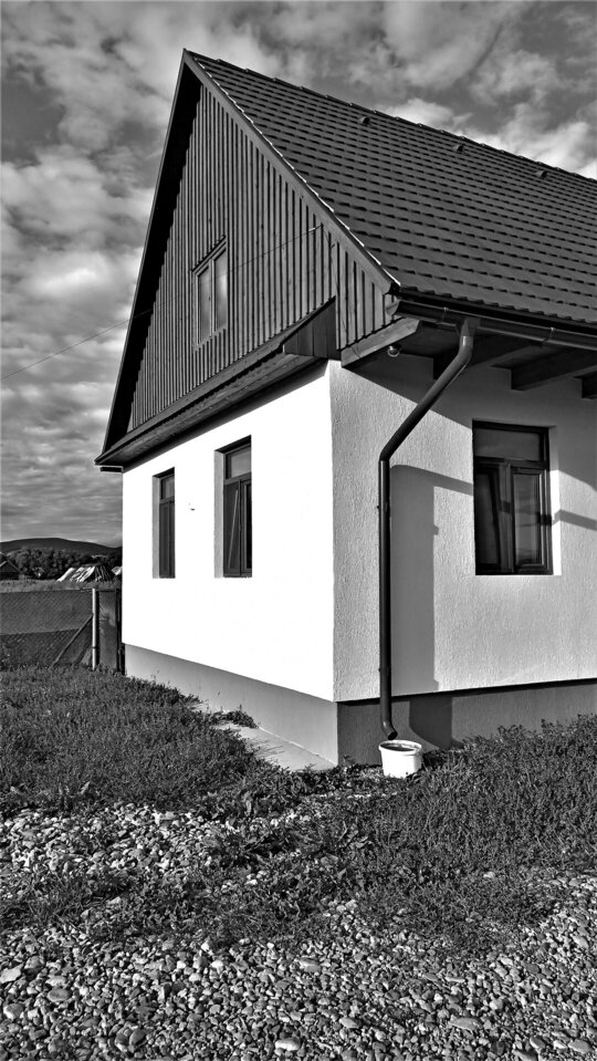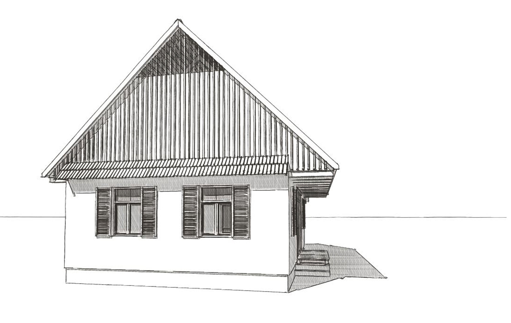 Plecând de la un model de casă-vagon preferat în periada anilor 1920-1940, am formulat o locuinţă cu planimetrie compactă, în care livingul îndeplineşte şi rolul unui spaţiu „intermediar”, datorită suprafaţei ample vitrate către curte, care ocupă toată lăţimea livingului. Din acest spaţiu central se deschid restul spaţiilor principale: cele două camere şi bucătăria.