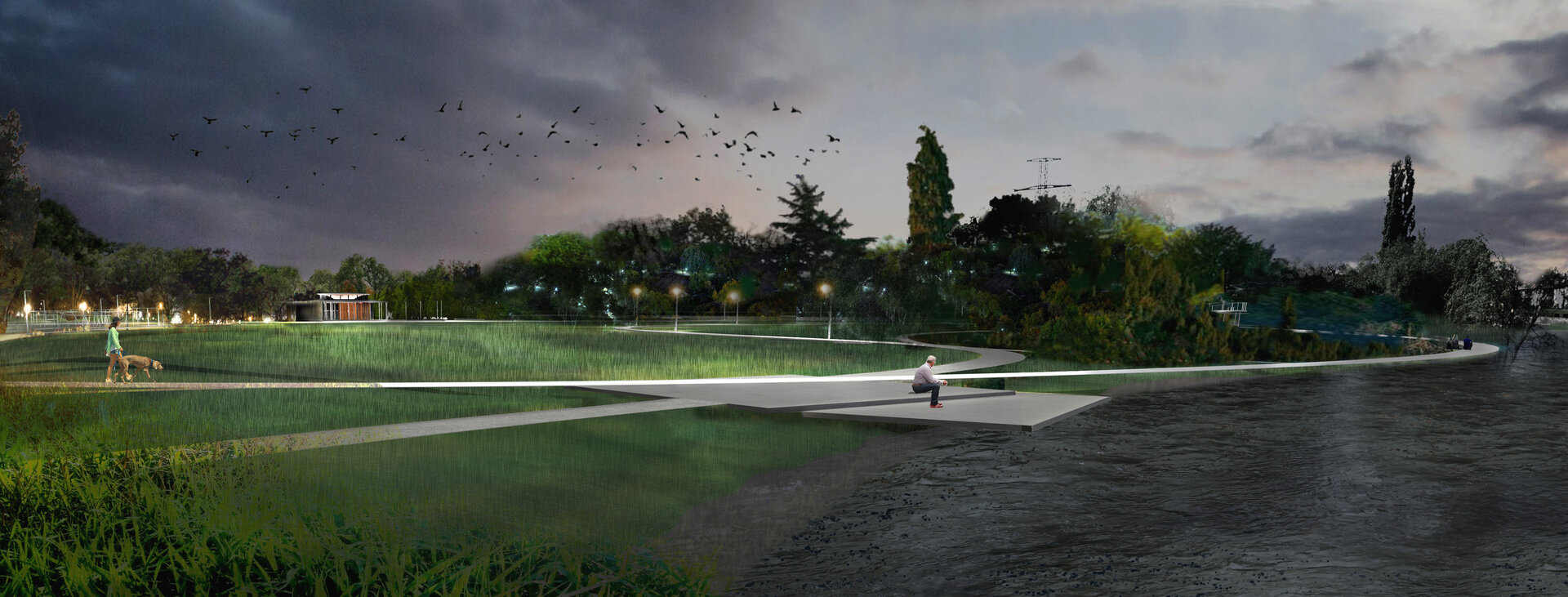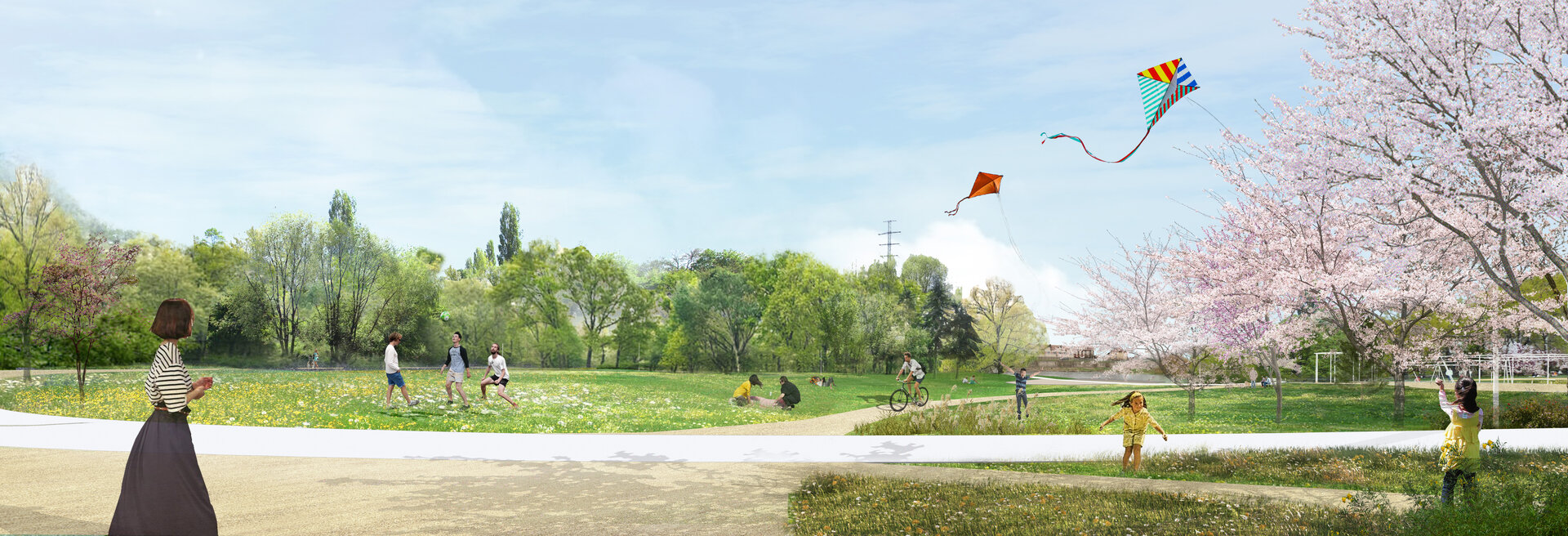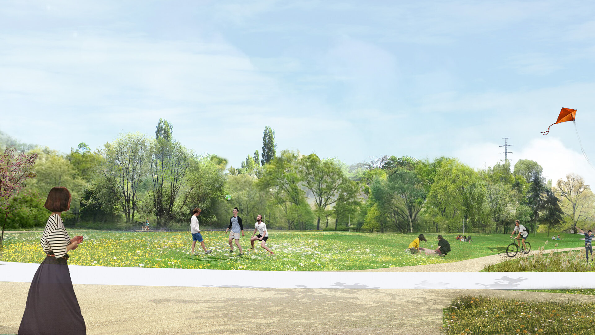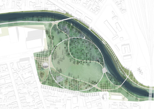 Centrat în jurul unui spațiu deschis generos, parcul devine o platformă pentru toată lumea, în spiritul common-ului englezesc și al Volkspark-ului german. Acest luminiș luxuriant, care coboară ușor spre râu, este încadrat de plantații de copaci consistente și diverse (până la 200% noi), oferind o serie de atmosfere diferite într-un format compact.