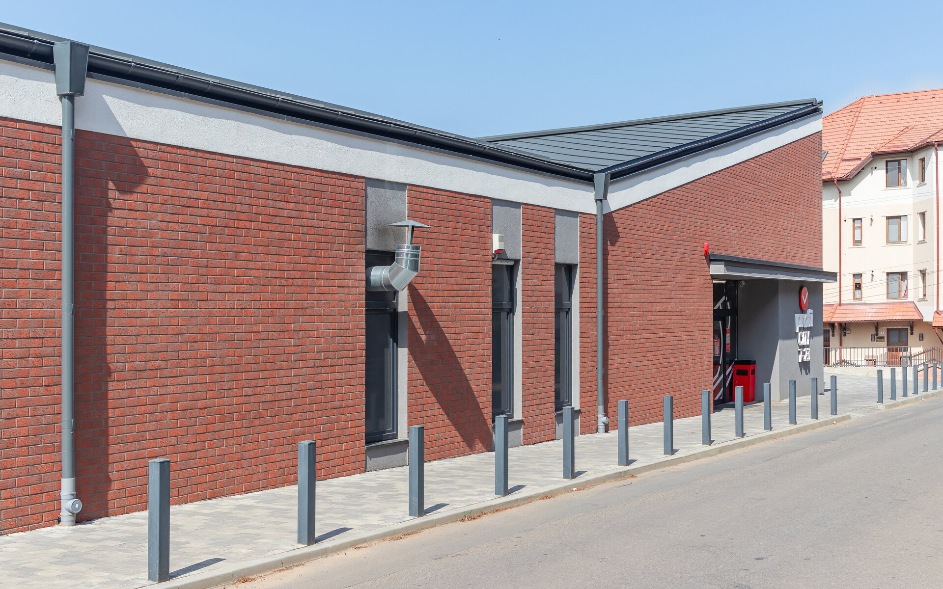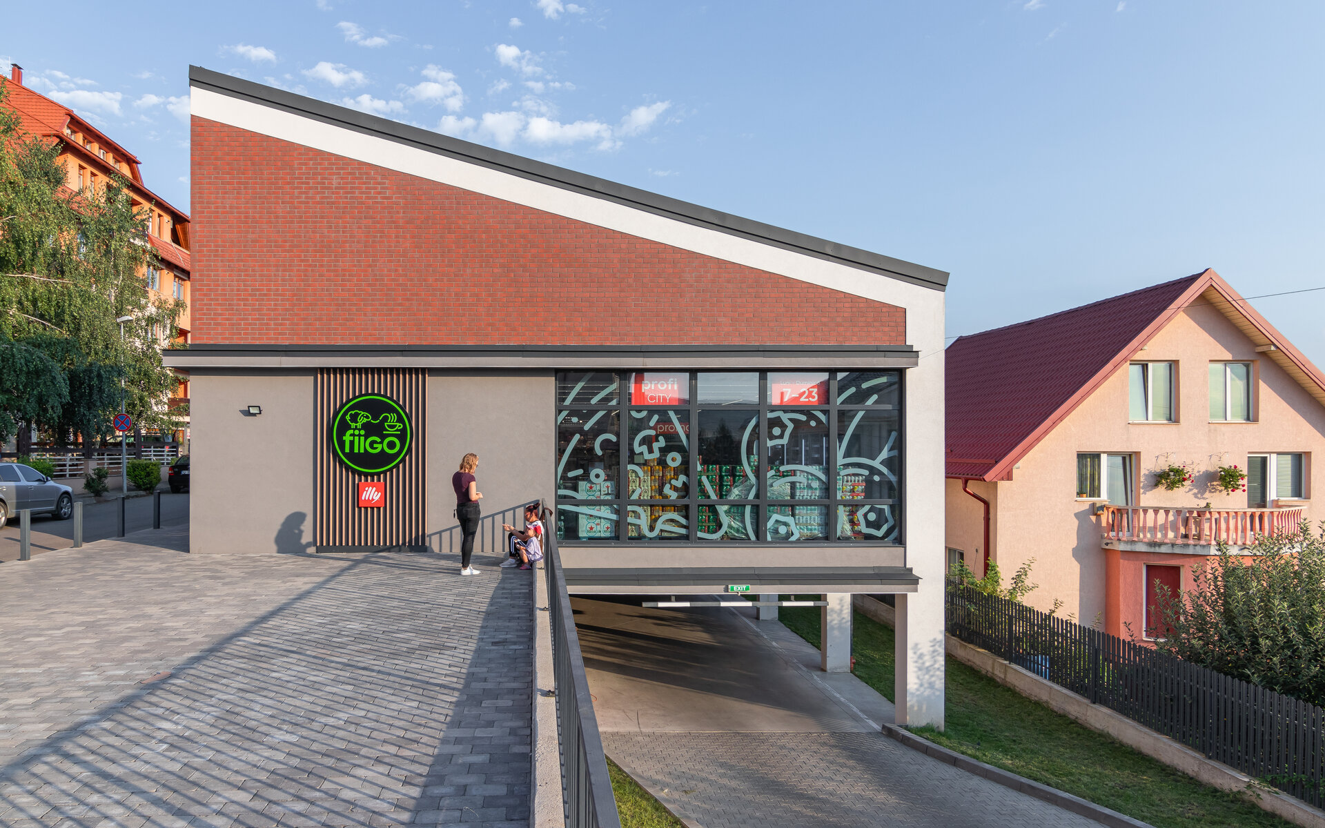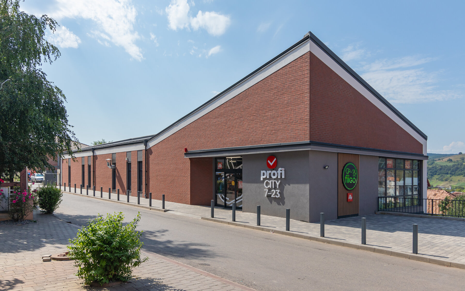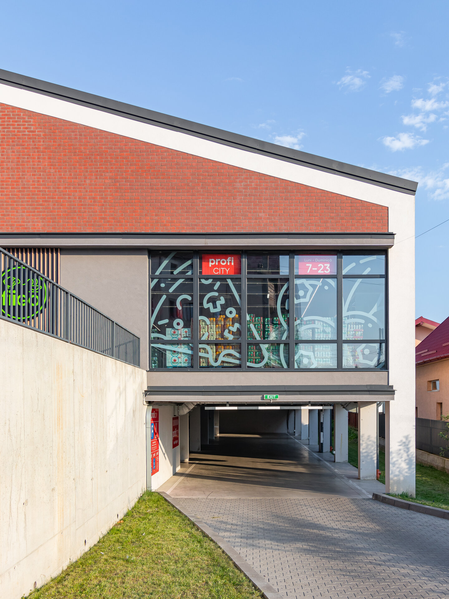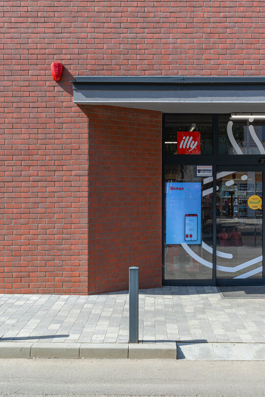La nivelul finisajelor s-a lucrat majoritar cu cărămida aparentă, care reprezintă un material estetic și durabil în timp, compatibil atât cu funcțiunea clădirii cât și cu caracterul zonei rezidențiale. Complementar, tencuiala gri, protejată cu o copertină subtilă, marchează colțul impreună cu zona de intrare și oferă o suprafață unde magazinul poate amplasa firma luminoasă și logo-ul, elemente cerute și specifice industriei comerțului.