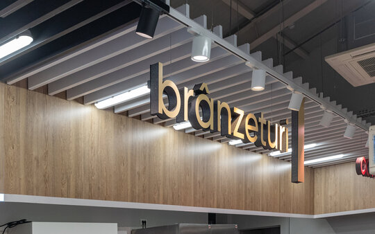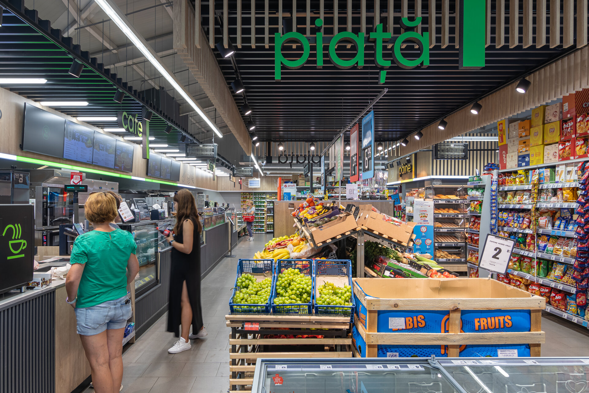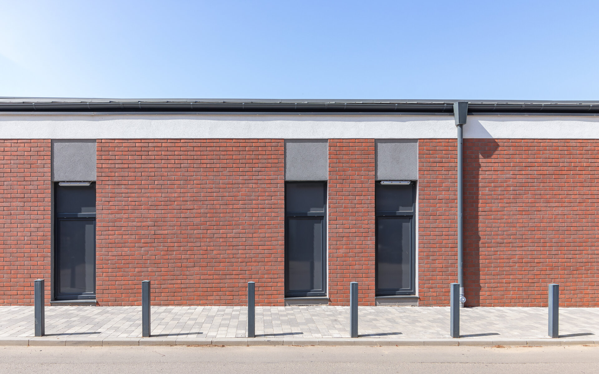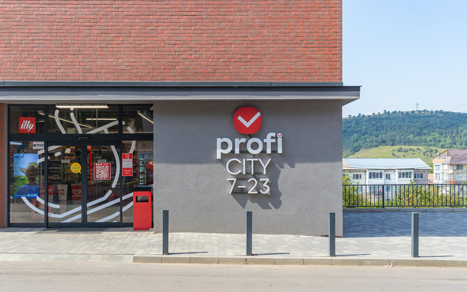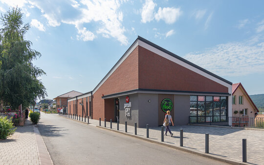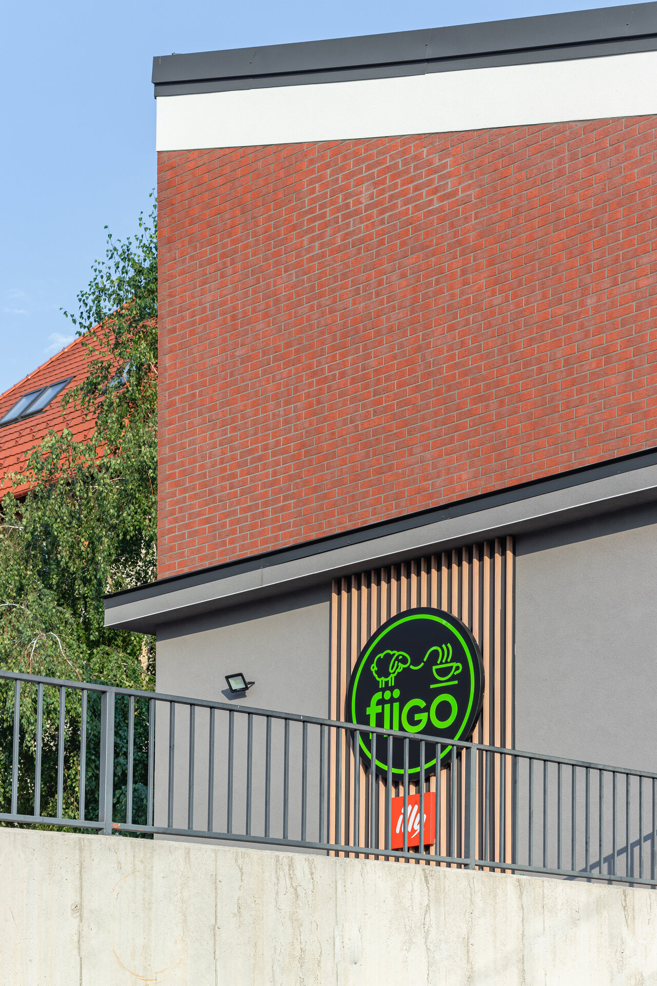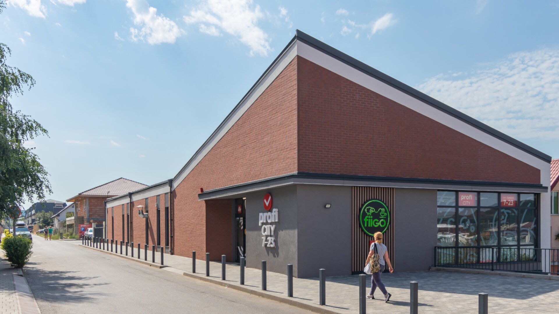 La nivelul finisajelor s-a lucrat majoritar cu cărămida aparentă, care reprezintă un material estetic și durabil în timp, compatibil atât cu funcțiunea clădirii cât și cu caracterul zonei rezidențiale. Complementar, tencuiala gri, protejată cu o copertină subtilă, marchează colțul impreună cu zona de intrare și oferă o suprafață unde magazinul poate amplasa firma luminoasă și logo-ul, elemente cerute și specifice industriei comerțului.