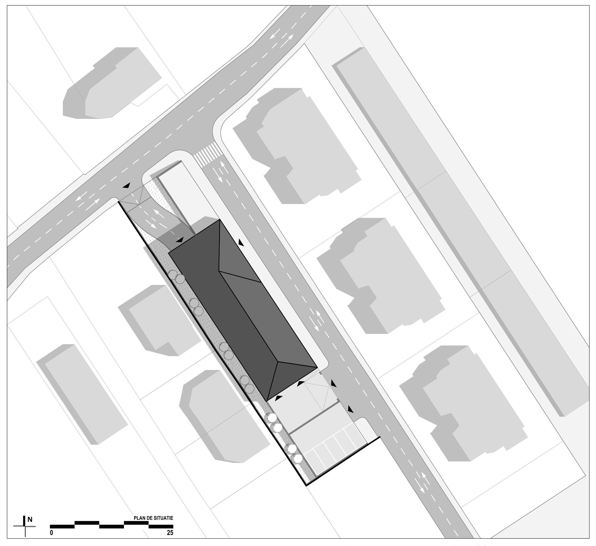 Terenul pe care s-a realizat investiția este o parcelă de colț, cu frontul îngust spre strada principală, caracterizat topografic de o diferență de nivel accentuată, și latura lungă paralelă cu strada secundară. Fiind o parcelă aflată într-o zonă de tranziție între locuințele unifamiliale și cele colective, regimul maxim de înălțime permis a fost de două niveluri. De asemenea au fost respectate o serie de alte condiționări urbanistice solicitate din partea autorităților locale și județene, cum ar fi: