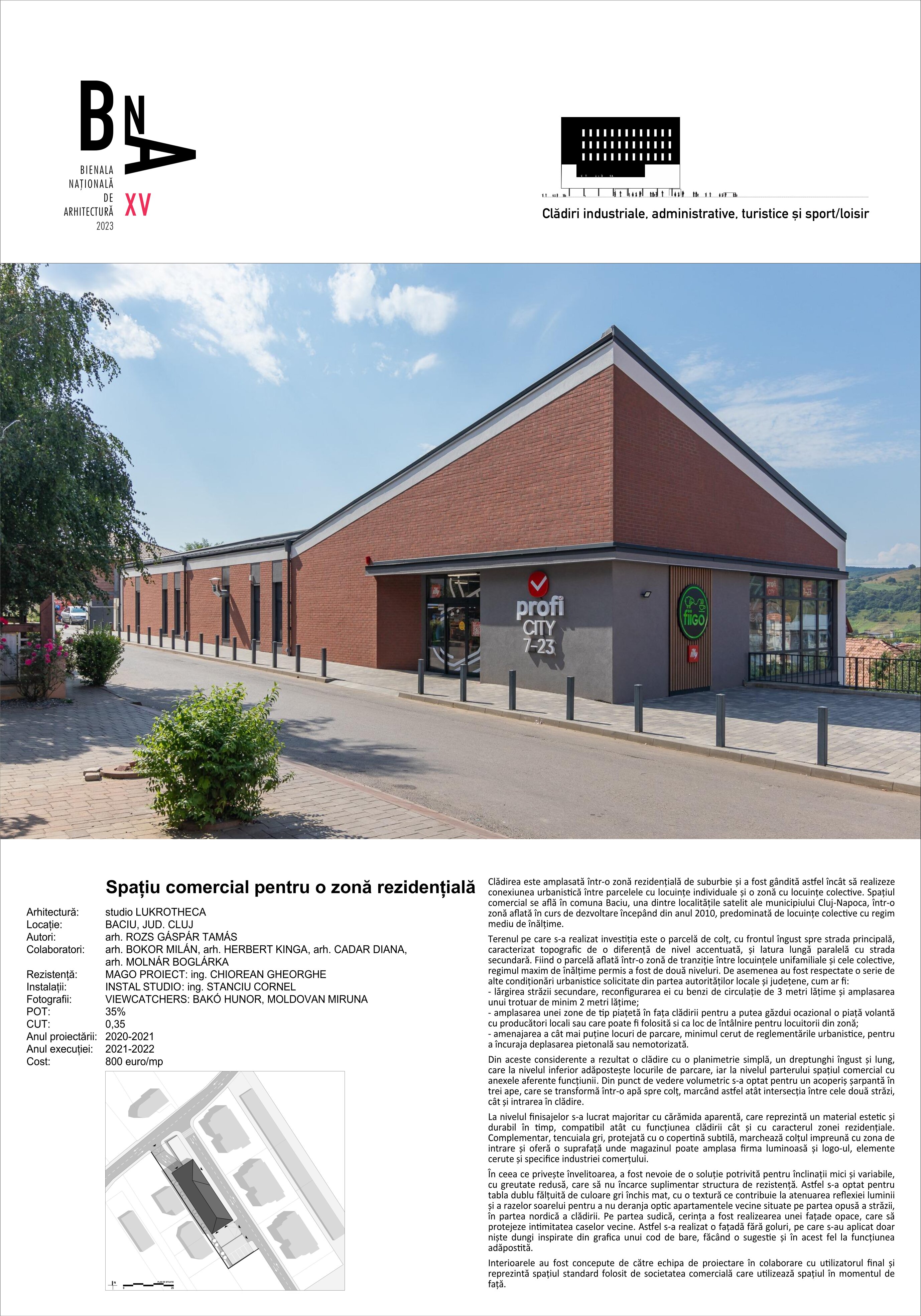 Clădirea este amplasată într-o zonă rezidențială de suburbie și a fost gândită astfel încât să realizeze conexiunea urbanistică între parcelele cu locuințe individuale și o zonă cu locuințe colective. Spațiul comercial se află în comuna Baciu, una dintre localitățile satelit ale municipiului Cluj-Napoca, într-o zonă aflată în curs de dezvoltare începând din anul 2010, predominată de locuințe colective cu regim mediu de înălțime.