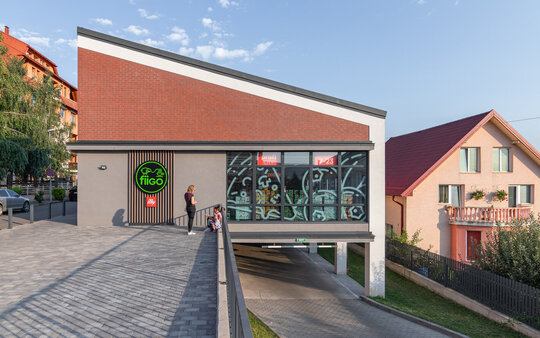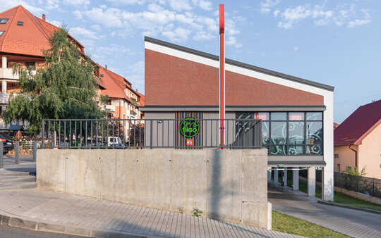 În ceea ce privește învelitoarea, a fost nevoie de o soluție potrivită pentru înclinații mici și variabile, cu greutate redusă, care să nu încarce suplimentar structura de rezistență. Astfel s-a optat pentru tabla dublu fălțuită de culoare gri închis mat, cu o textură ce contribuie la atenuarea reflexiei luminii și a razelor soarelui pentru a nu deranja optic apartamentele vecine situate pe partea opusă a străzii, în partea nordică a clădirii. Pe partea sudică, cerința a fost realizearea unei fațade opace, care să protejeze intimitatea caselor vecine. Astfel s-a realizat o fațadă fără goluri, pe care s-au aplicat doar niște dungi inspirate din grafica unui cod de bare, făcând o sugestie și în acest fel la funcțiunea adăpostită.