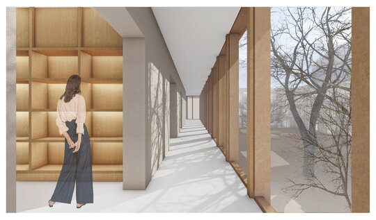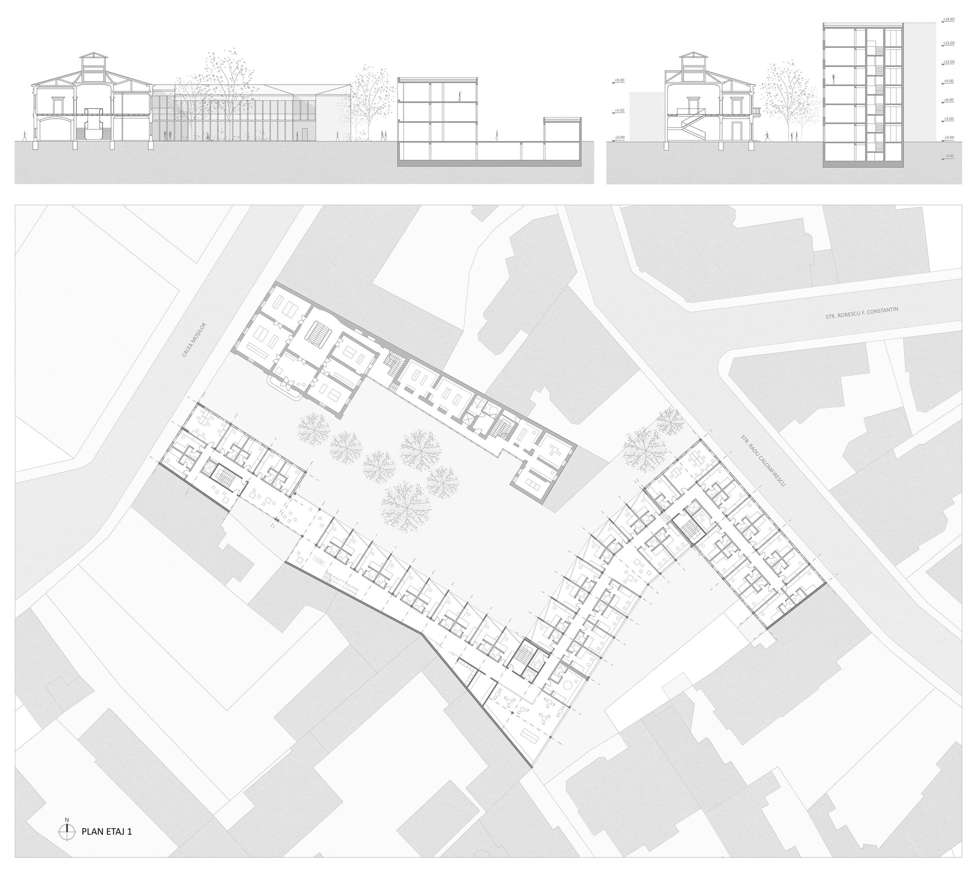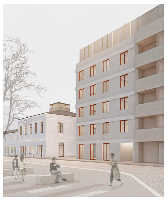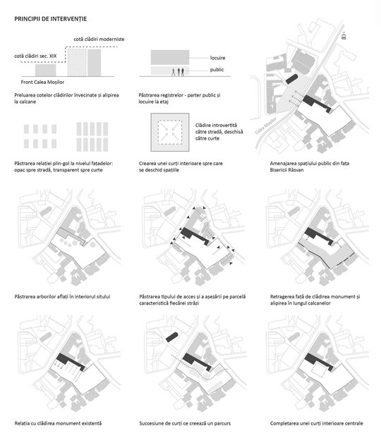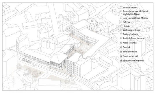 Se urmărește o coerență între inserție și contextul istoric existent. Noua construcție preia înălțimile clădirilor învecinate, P+5 la Calea Moșilor și P+1 la Str. Radu Calomfirescu, respectiv a celor două cote caracteristice, cea a clădirilor moderniste și cea a clădirilor de secol XIX. Păstrează registrele, având spații publice la parter și locuire la nivelurile superioare, cât și relația plin-gol la nivelul fațadelor, mai opac spre stradă și mai transparent spre curte. Asemenea hanurilor sau grupărilor de locuințe tradiționale se dorește stabilirea unei strânse relații cu spațiul public, acesta continuându-se în interiorul sitului printr-o curte principală ce se formează în relație cu casa veche. Unitățile de locuit se află la etaj, iar la parter se găsesc spații de lucru comune, o cantină și un spațiu expozițional.