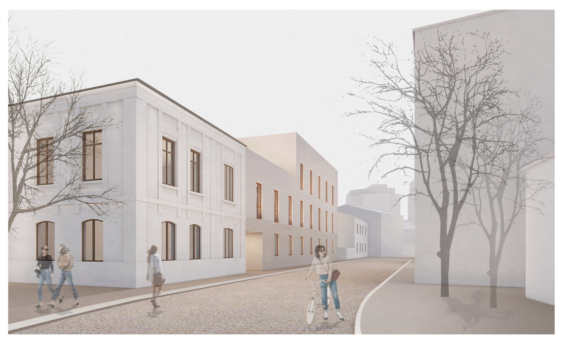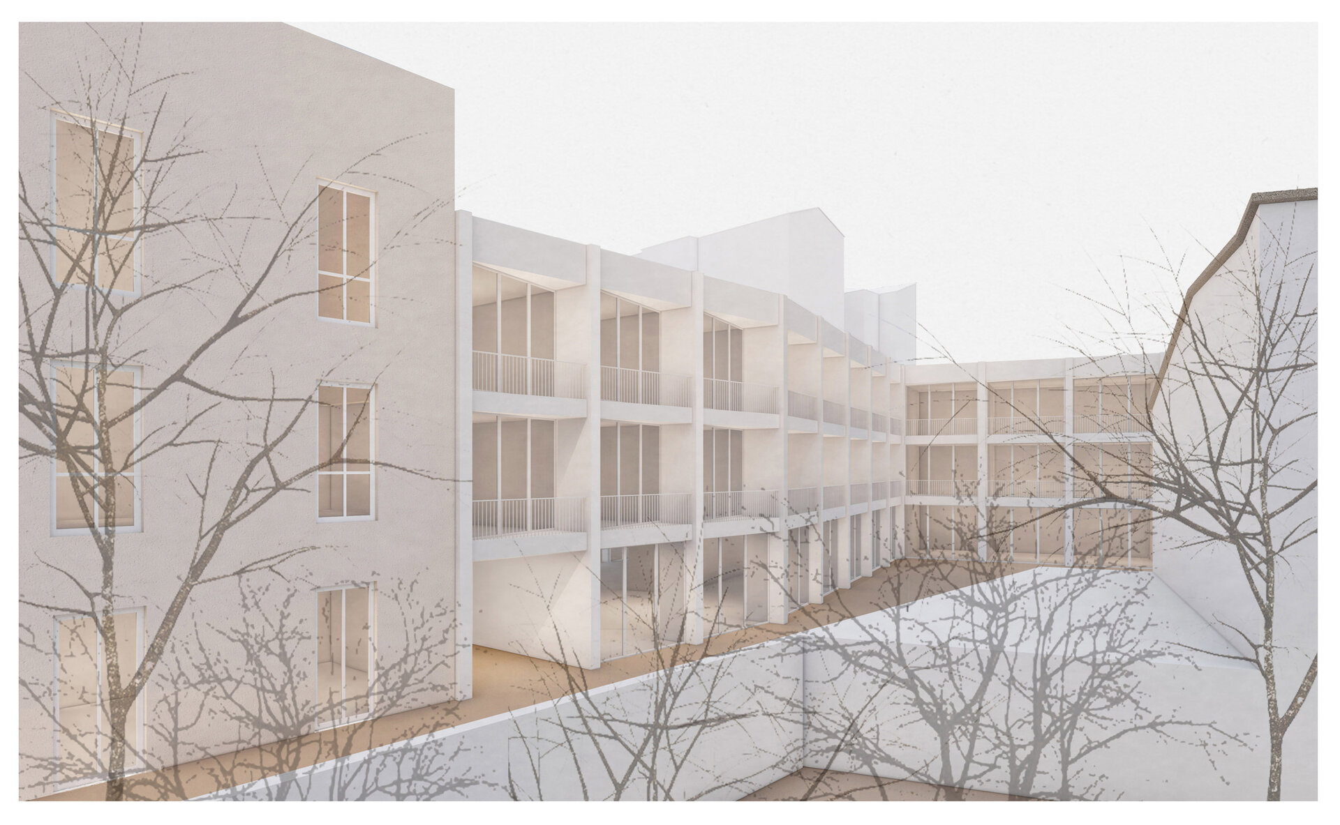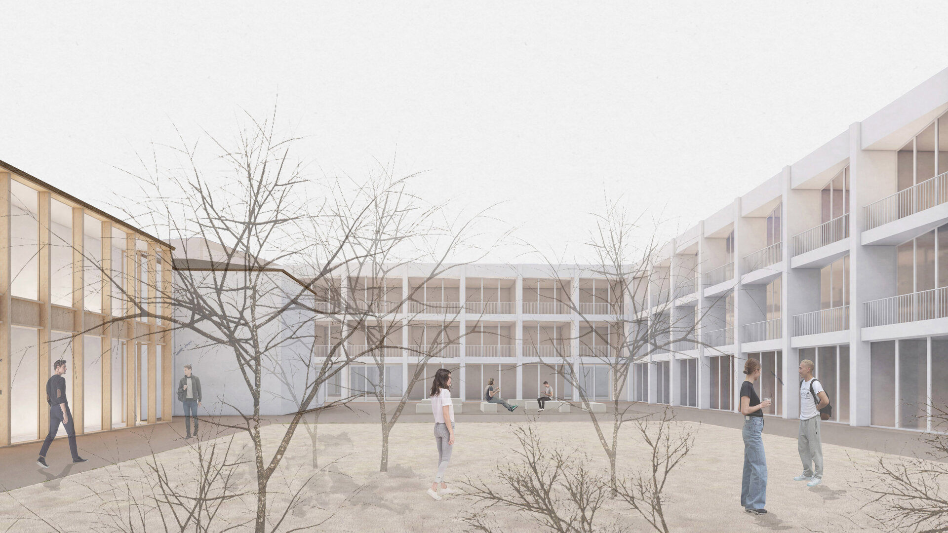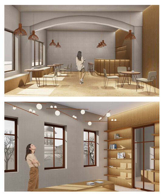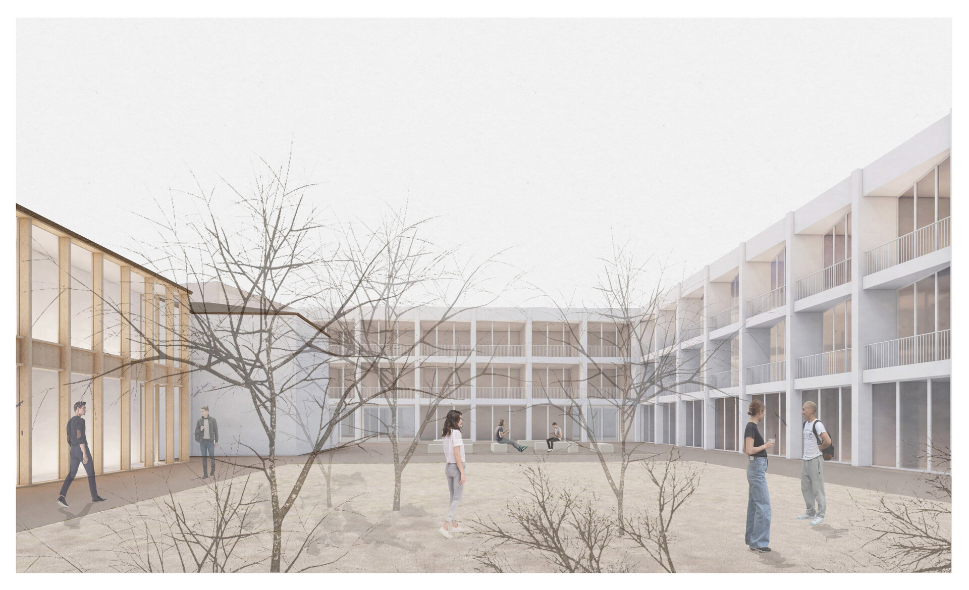 Clădirea devine intermediar între spațiul privat pentru rezidenți și cel public. Se formează diferite grade de intimitate, casa veche și curtea principală rămân accesibile locuitorilor orașului, spațiile de co-working ce se adresează studenților, integrate în noua inserție, au un alt grad de deschidere către public, asemenea și curtea secundară în relație cu cantina, iar spațiile rezidențiale rămân private, existând o separare între acestea și cele publice. Se creează, astfel, acea gradație de la public la privat specifică formelor de locuire tradițională.