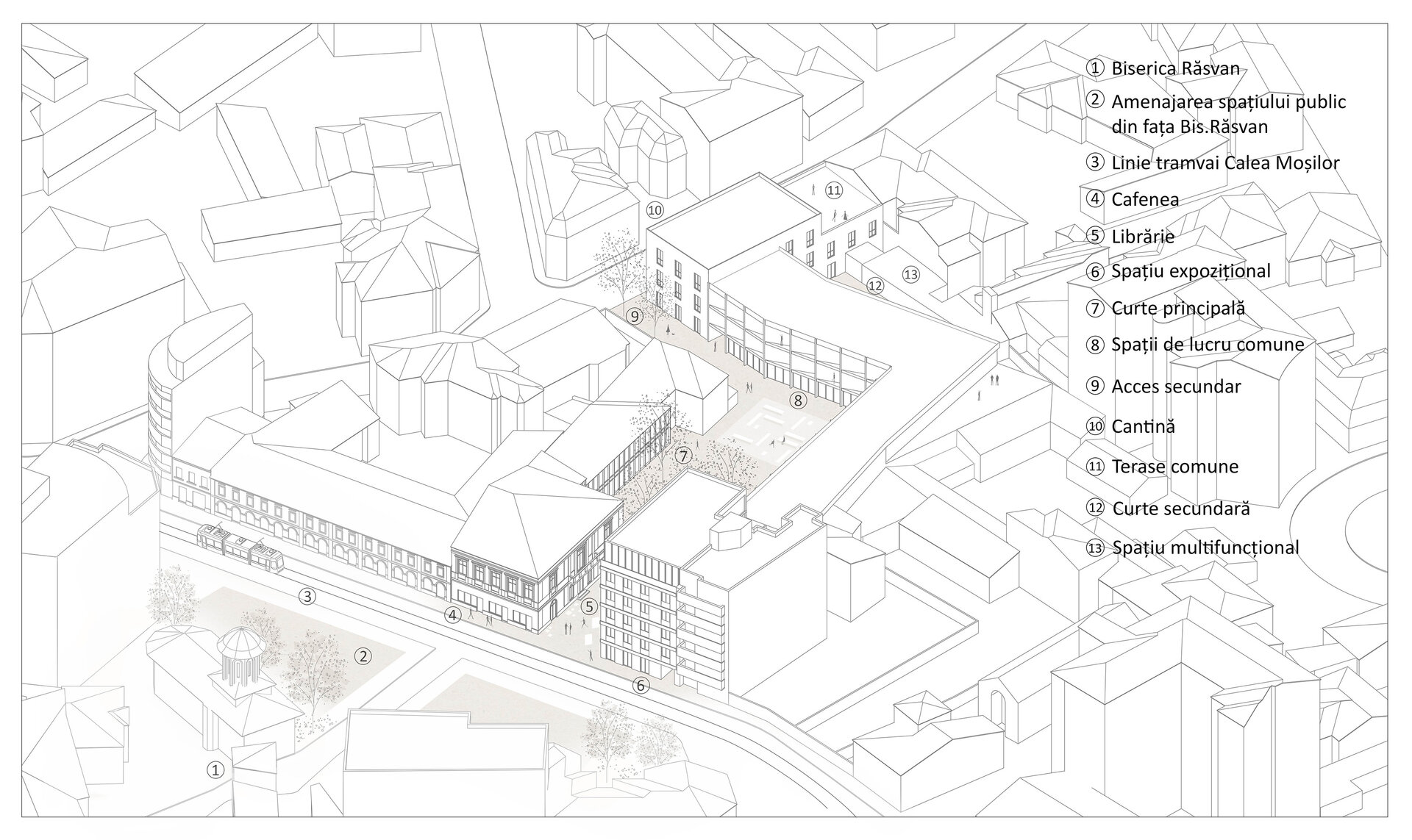 Proiectul propune un program atât rezidențial, cât și public. Păstrează, astfel, caracterul zonei prin îmbinarea funcțiunii de locuire cu funcțiuni accesibile publicului și contribuie la reactivarea zonei prin spații ce se adresează atât celor care locuiesc aici, cât și întregii comunități de studenți și locuitorilor orașului. Se dorește reintegrarea spațiului în viața urbană, situl fiind alcătuit acum dintr-un teren viran și o clădire abandonată, ocupată abuziv și lăsată să se degradeze din ce în ce mai mult, atrăgând și aici viața activă din apropiere.